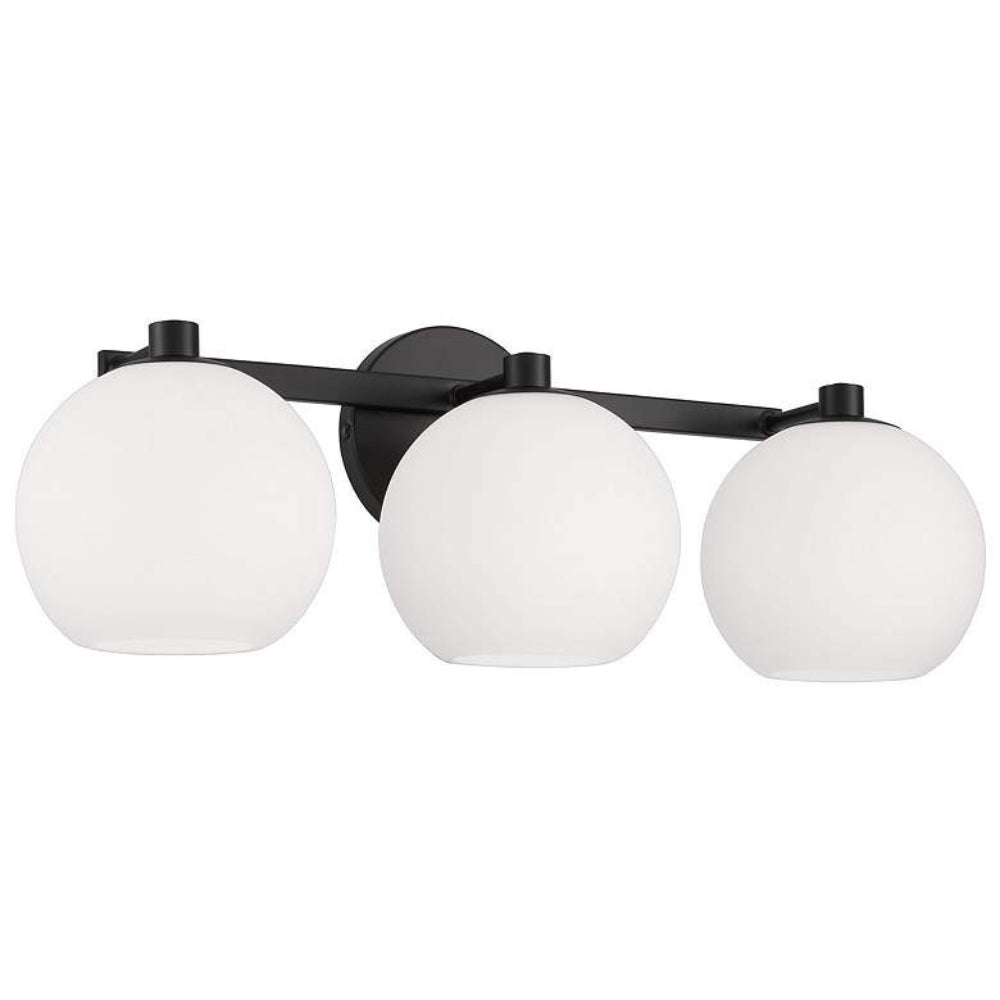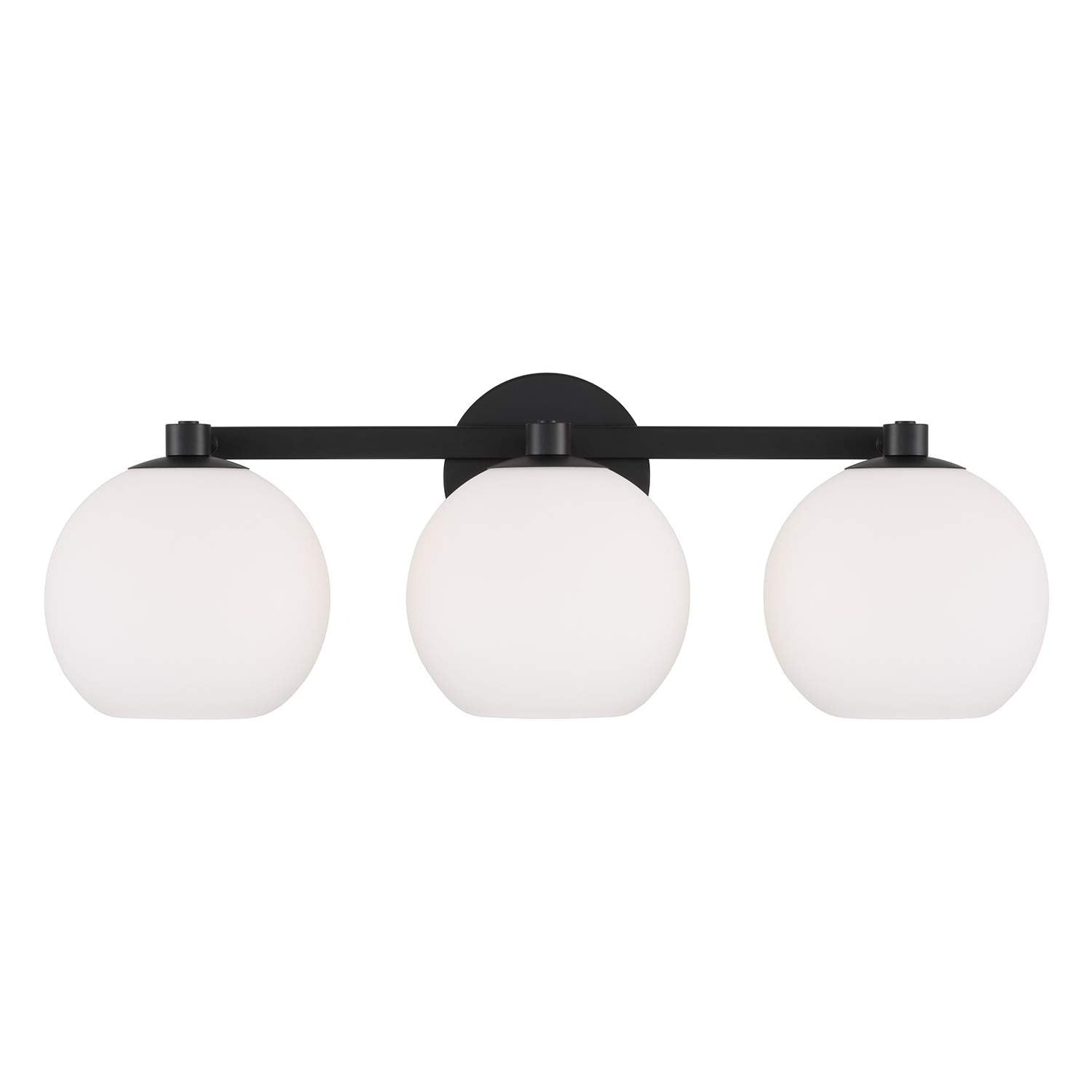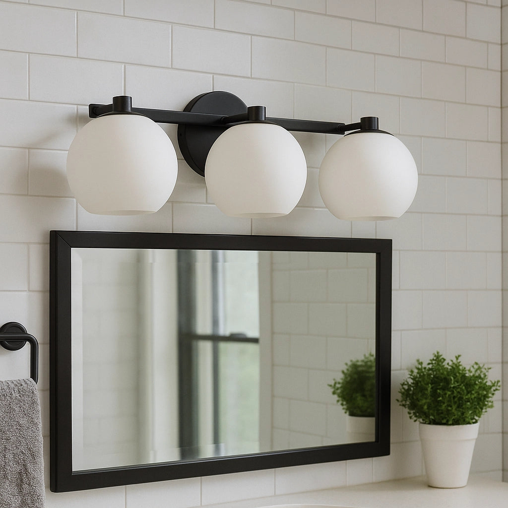 The Lucas Triple White Globe Wall Lamp features three white glass globes mounted on sleek black metal arms. It emits a soft, ambient light and is perfect for bathrooms, vanities, or living spaces.