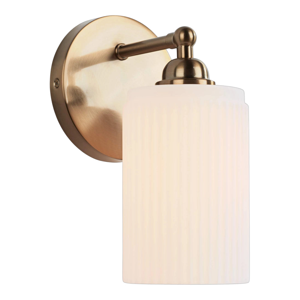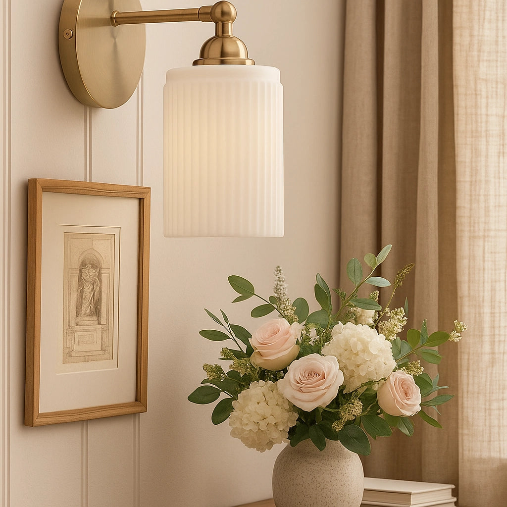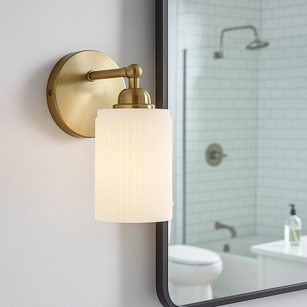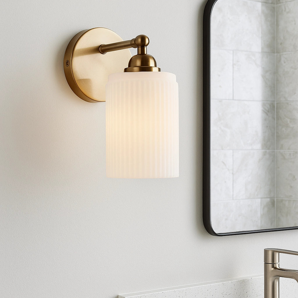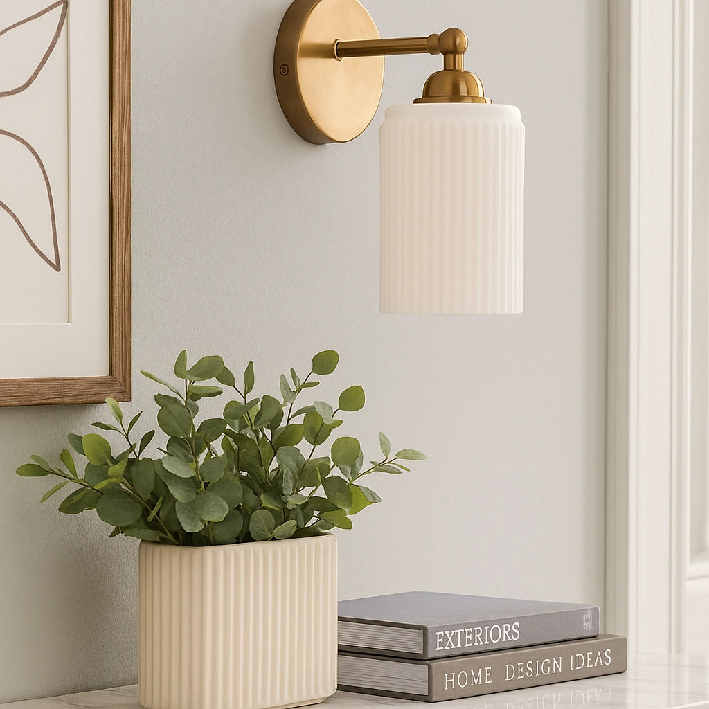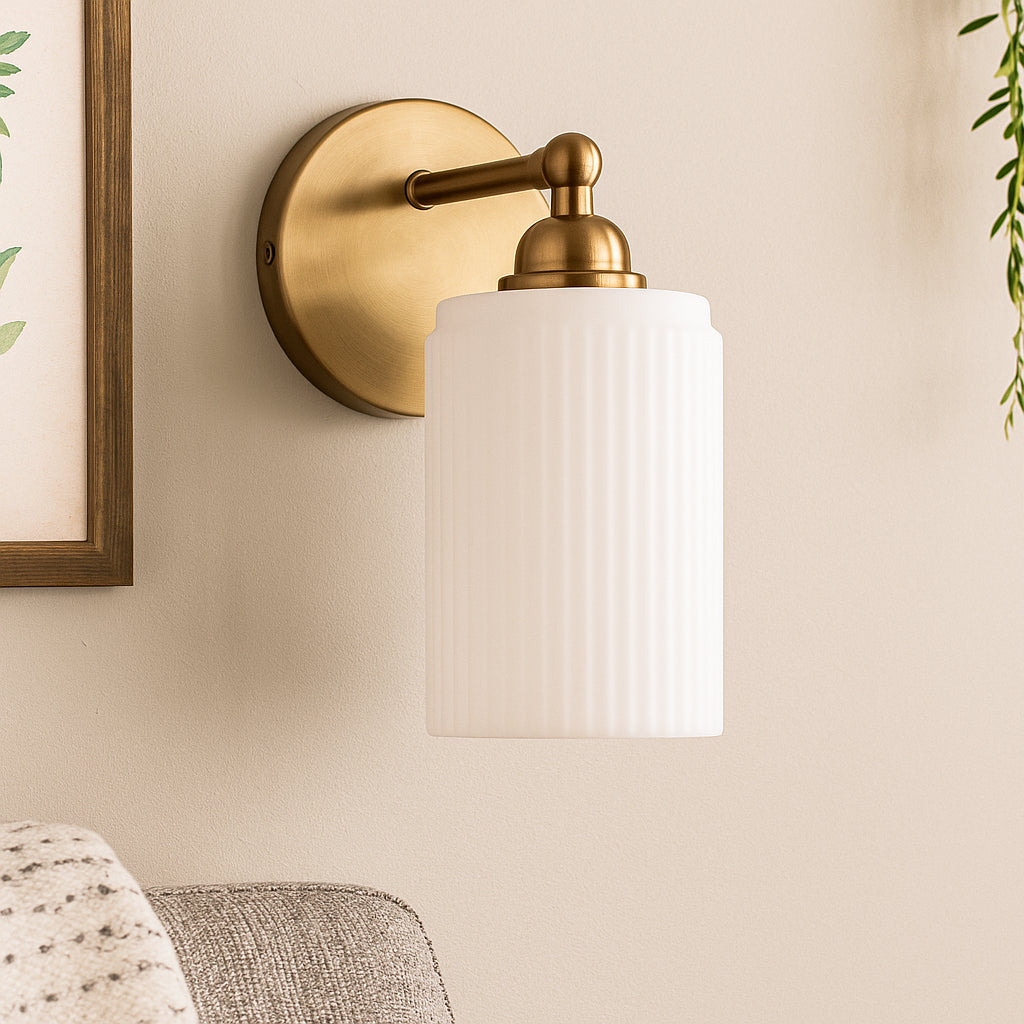 The Wall Sconce blends retro charm with modern elegance. Brass finish and ribbed glass shade cast warm, inviting light, ideal for adding a touch of sophistication to any space.