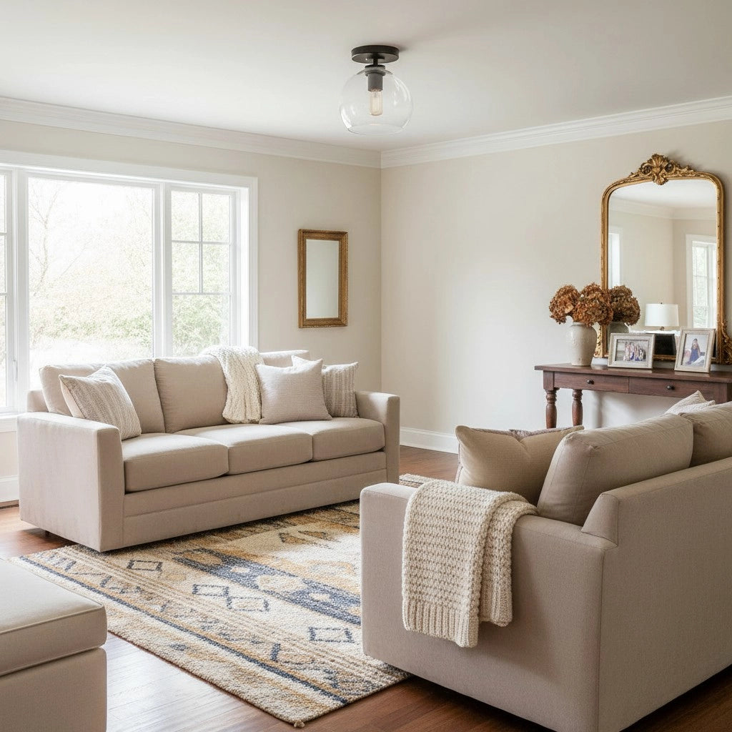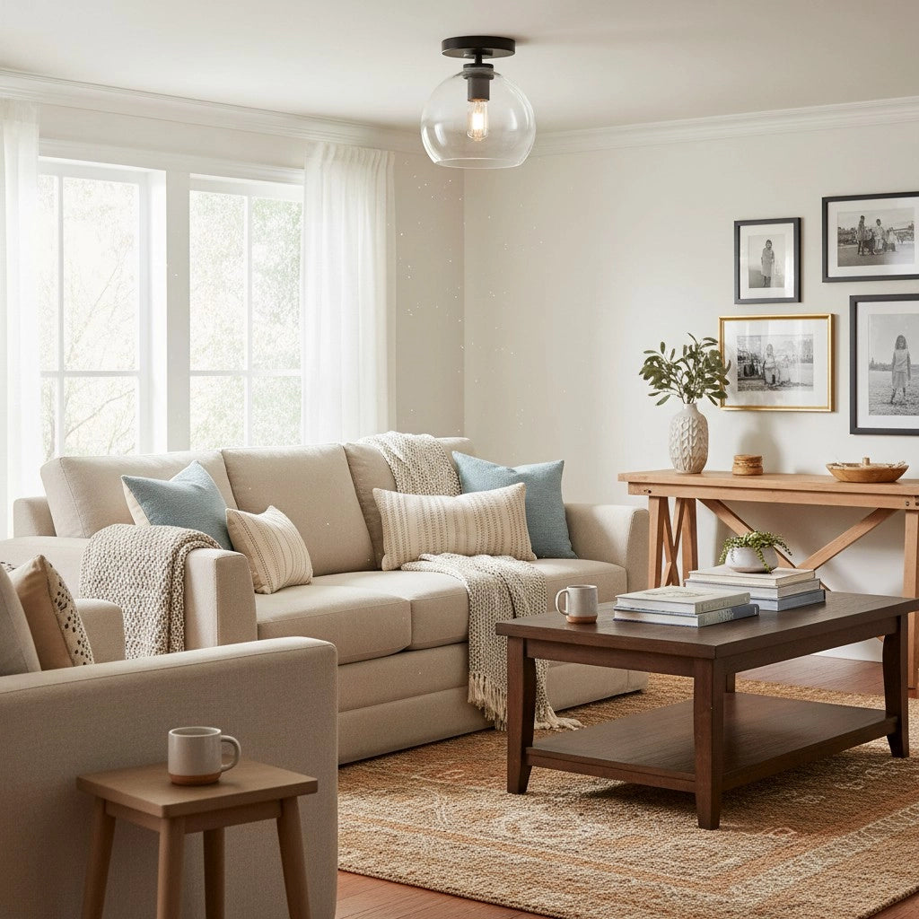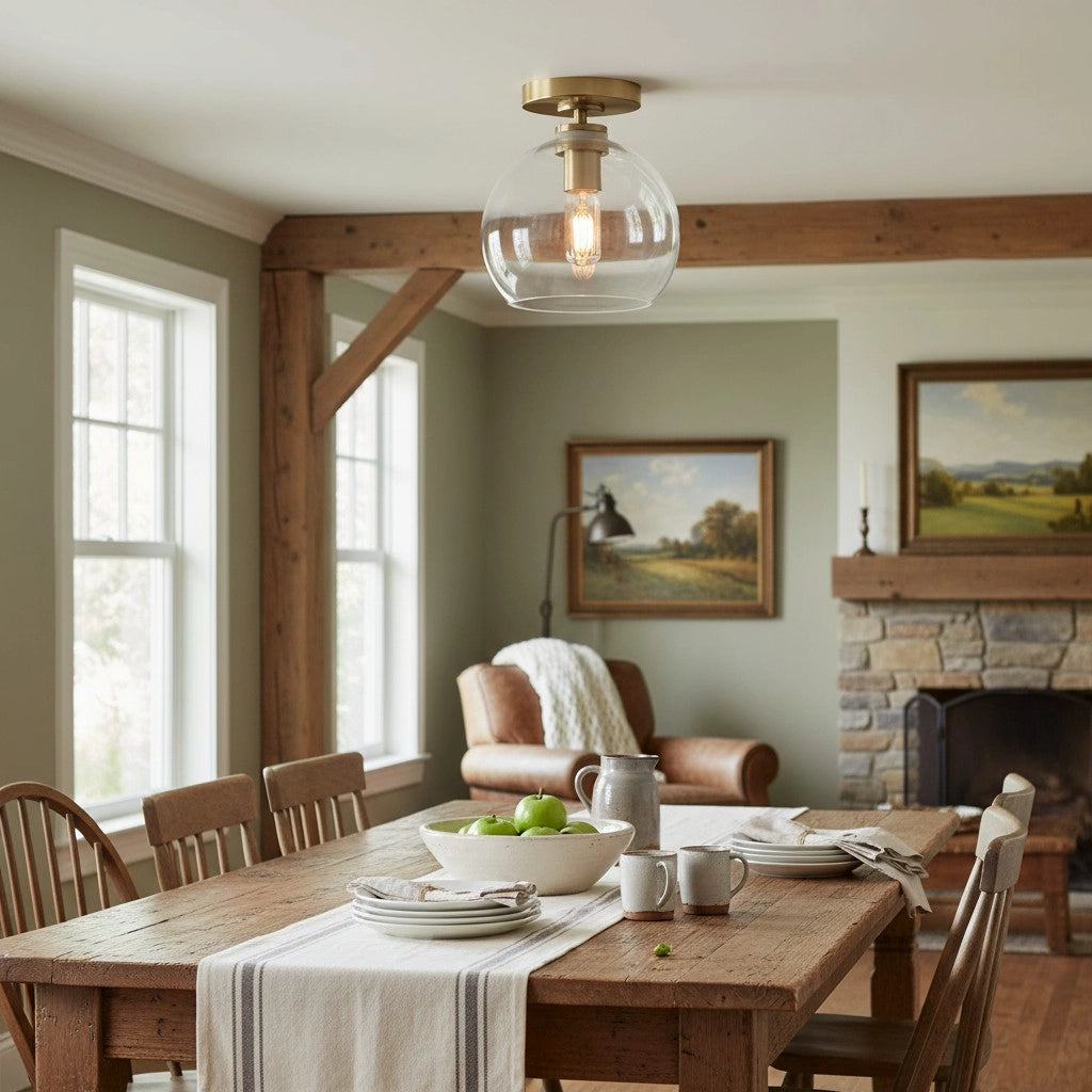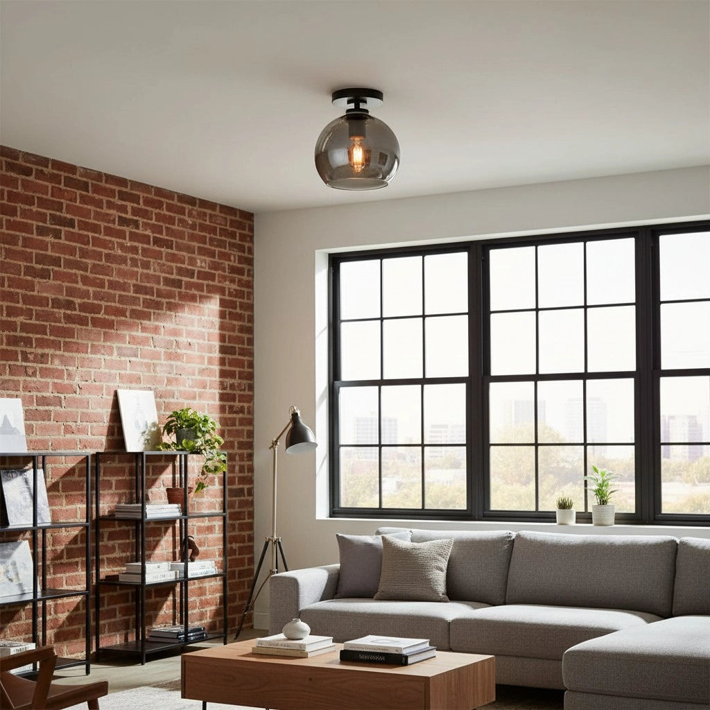 This ceiling light features clean lines, and its rounded glass shade creates a beautiful contrast with the iron fixture.
