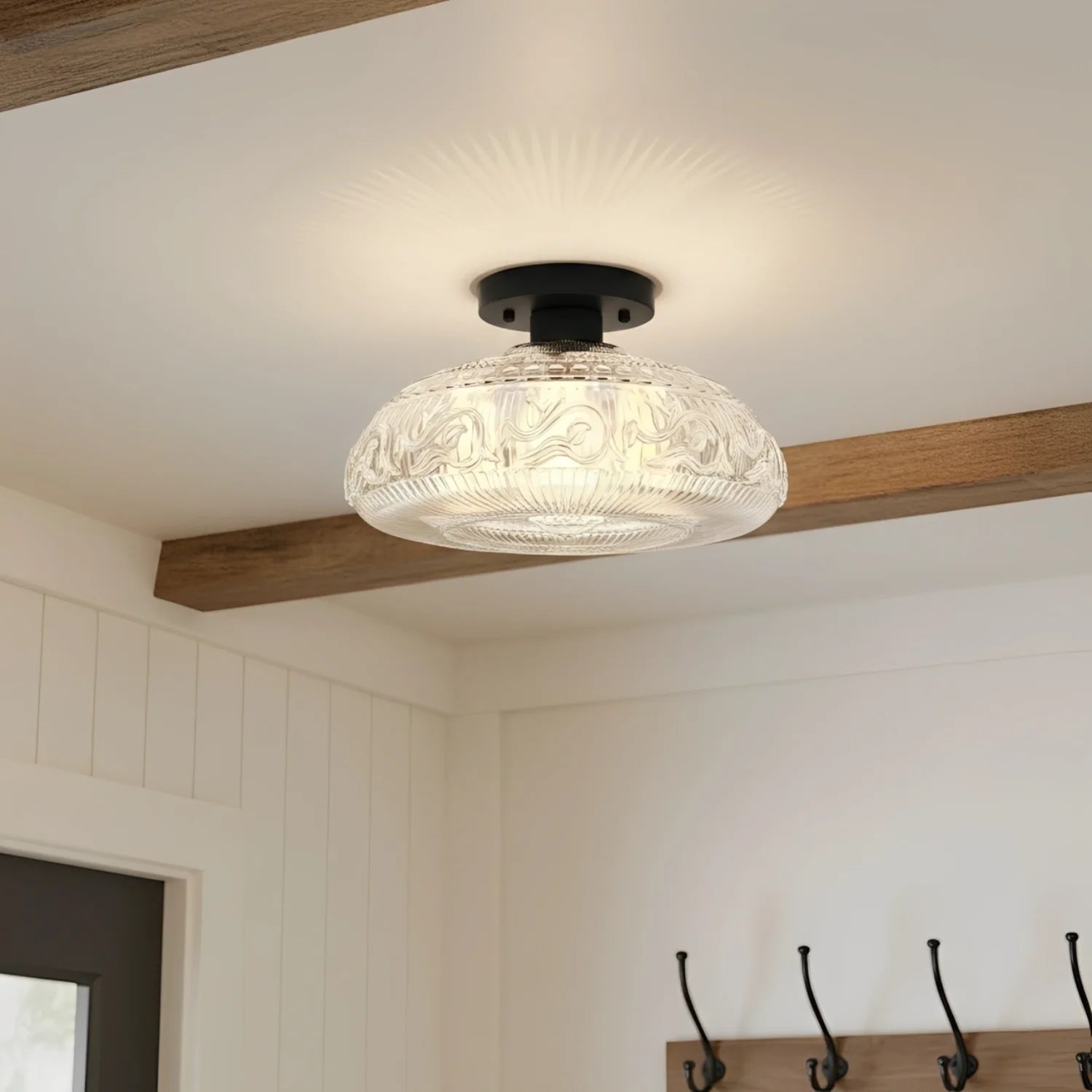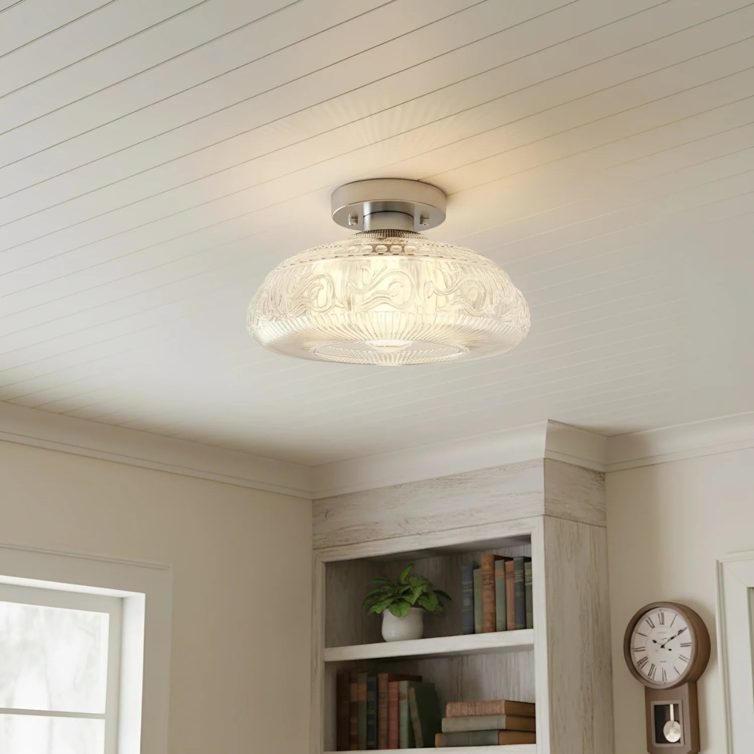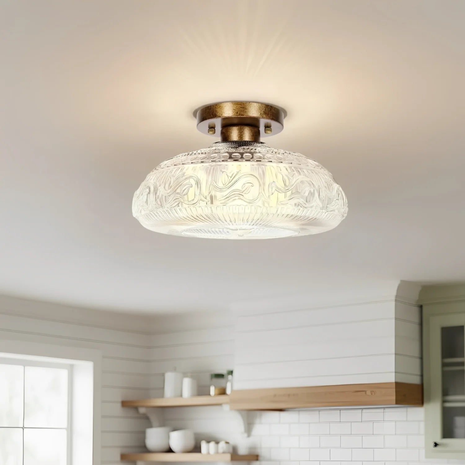 This engraved clear glass ceiling light, with its intricate etched pattern and smooth metal body, adds soft ambient lighting and a refined visual aesthetic to spaces such as living rooms, dining rooms, hallways, kitchens, or bedrooms.
