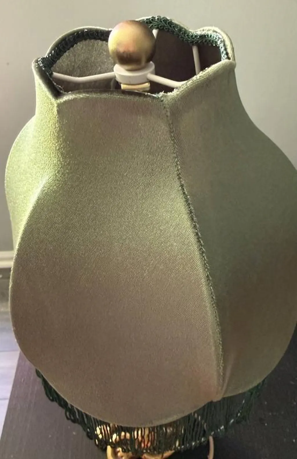 The deep green velvet shade with matching fringe delivers a tactile, opulent texture.