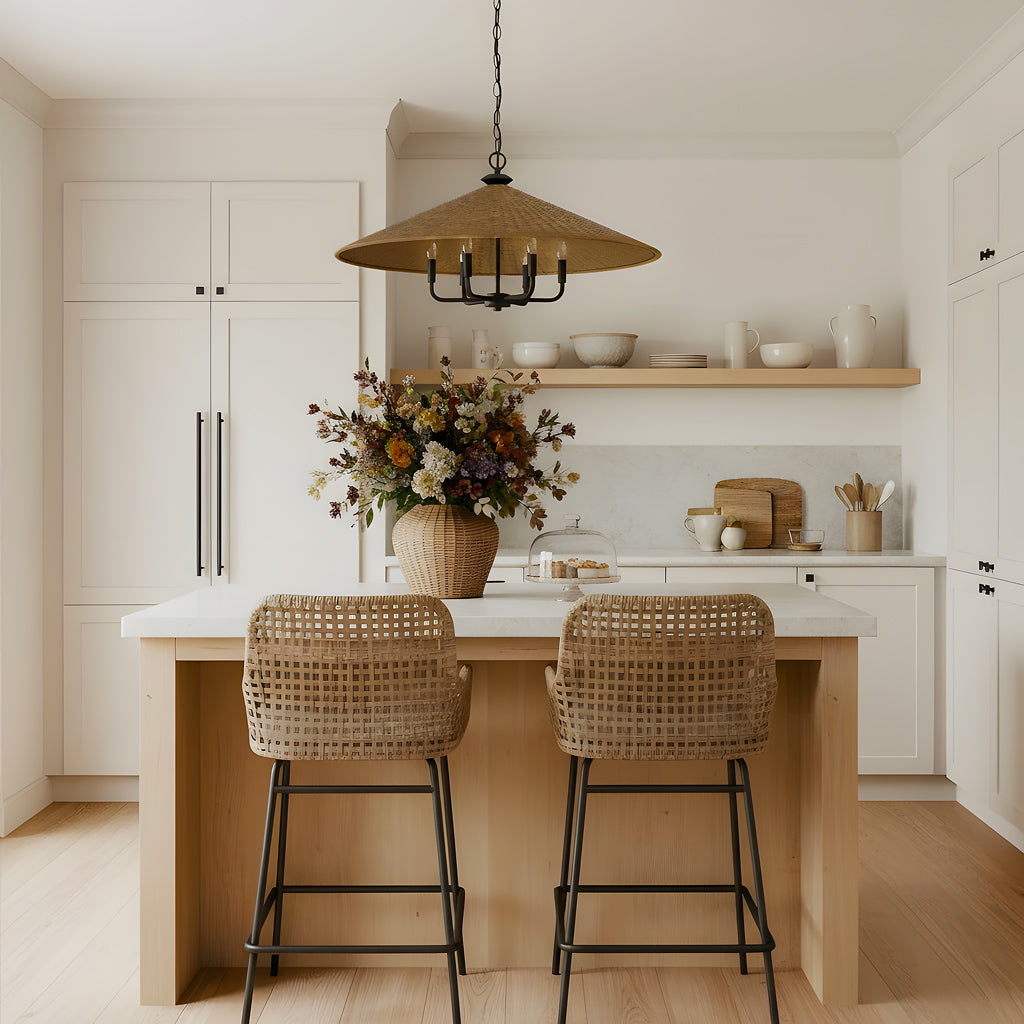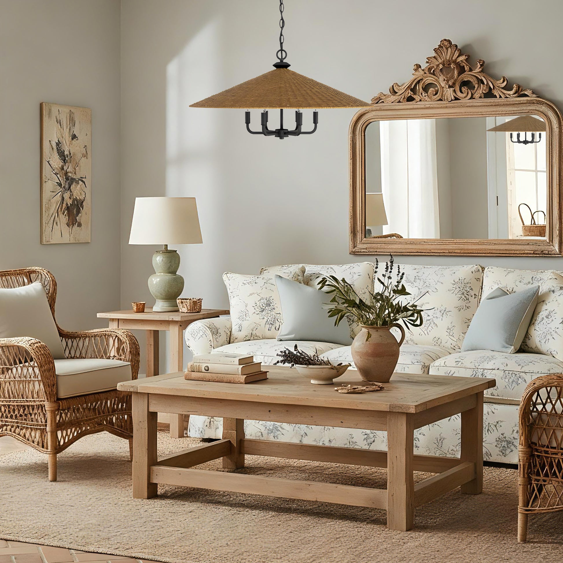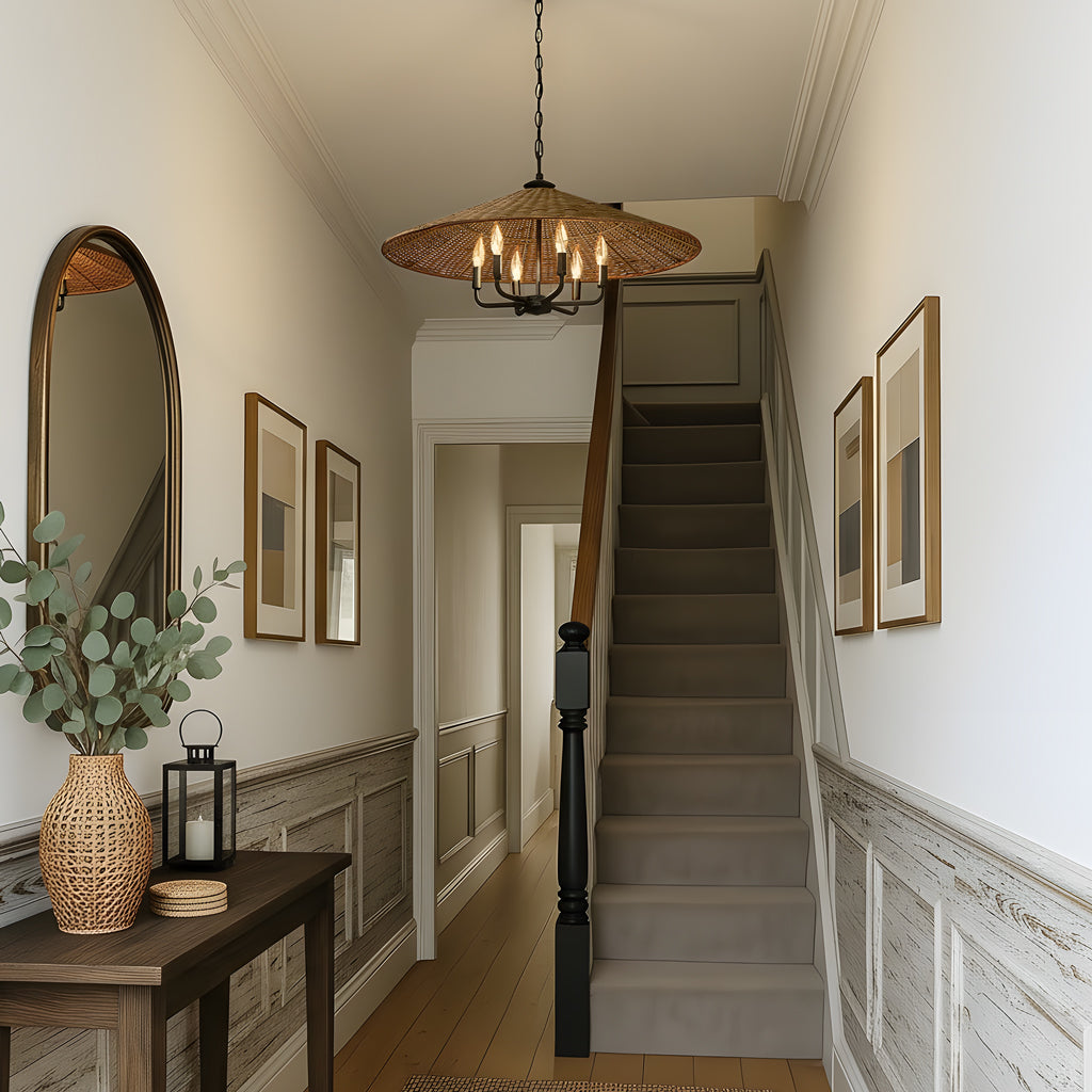 Brighten your space with this stylish cone-shaped chandelier. A matte black candelabra peeks from a rattan shade, mixing textures beautifully. Its adjustable chain fits any ceiling, and its dynamic design adds elegant ambient lighting.