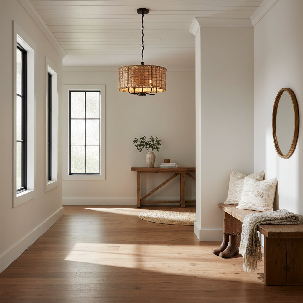 The Chione Pendant Light showcases a handwoven natural rattan shade that casts a warm 360° glow with textured shadows. Blending coastal charm with rustic appeal, it adds inviting character to dining rooms, living spaces, or bedrooms.