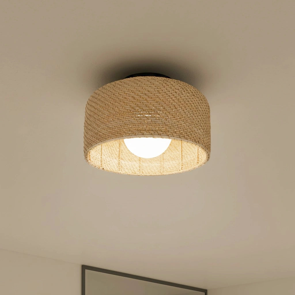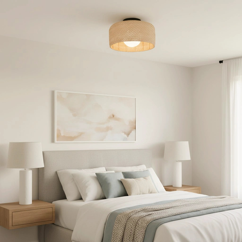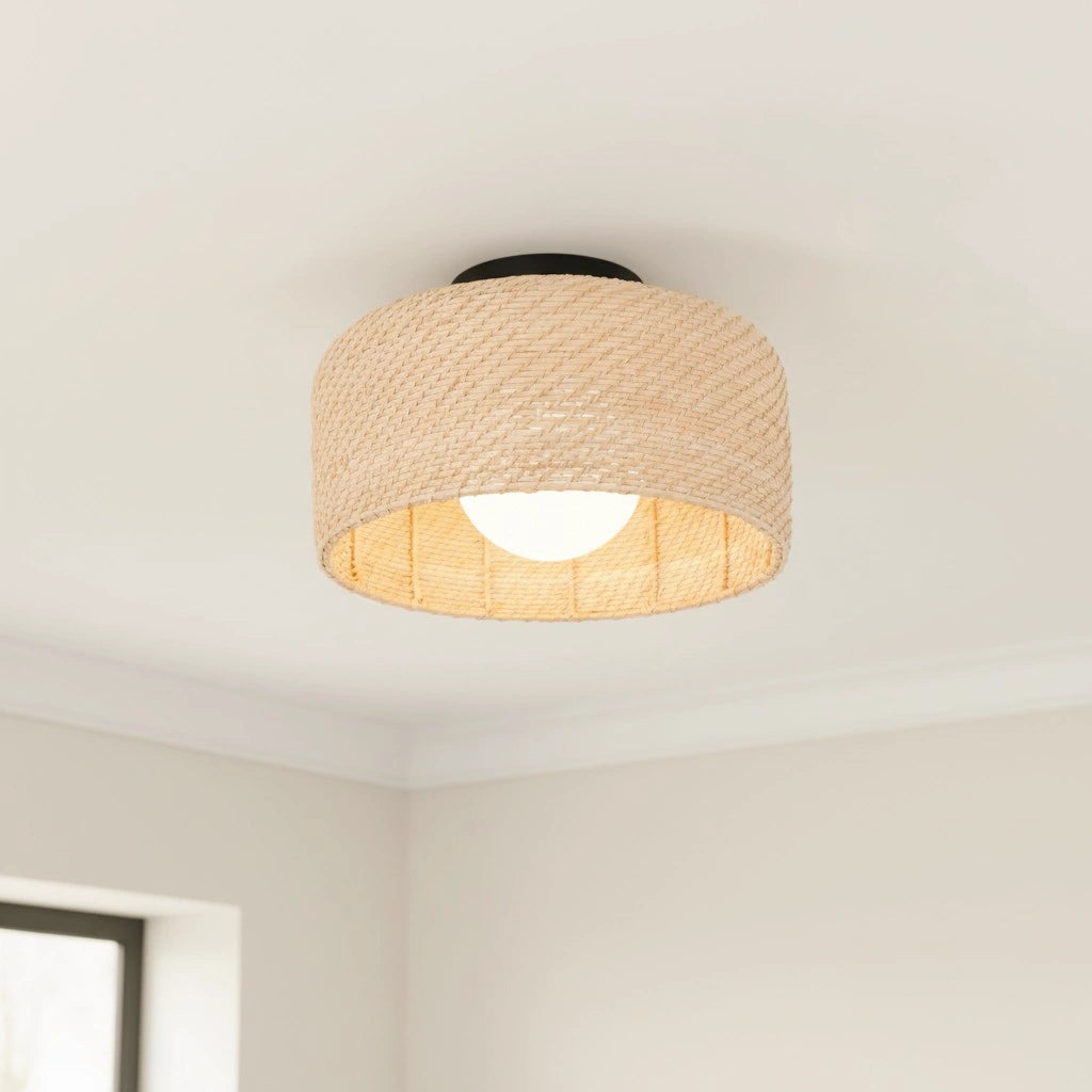 This erica ceiling light features a rattan shade that provides a soft, even ambiance, while the frosted plastic diffuser adds a touch of understated elegance. It's perfect for living rooms, bedrooms, hallways, and entryways.