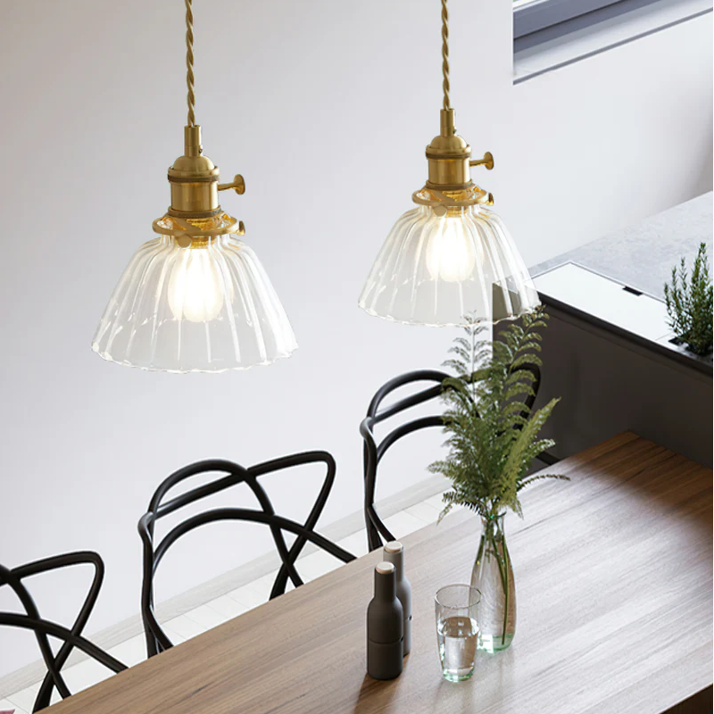 The Porphyrion Pendant Light combines vintage charm with modern versatility. This collection features three unique designs—clear glass, globe, and fluted—each finished in brass. Ideal for dining rooms, kitchens, or cafés.