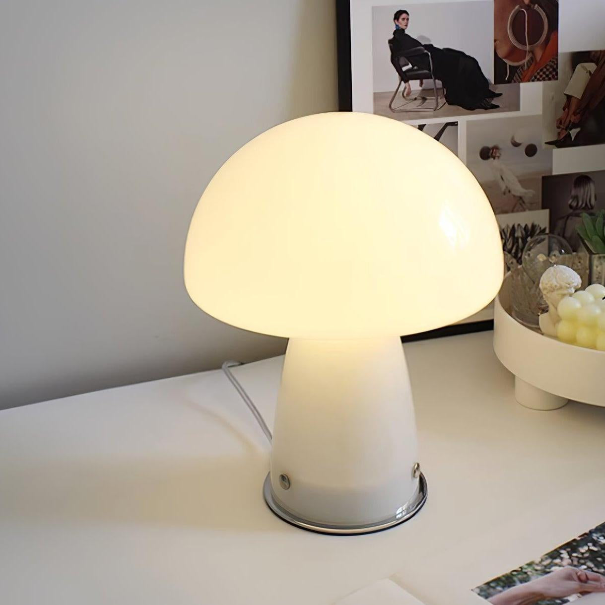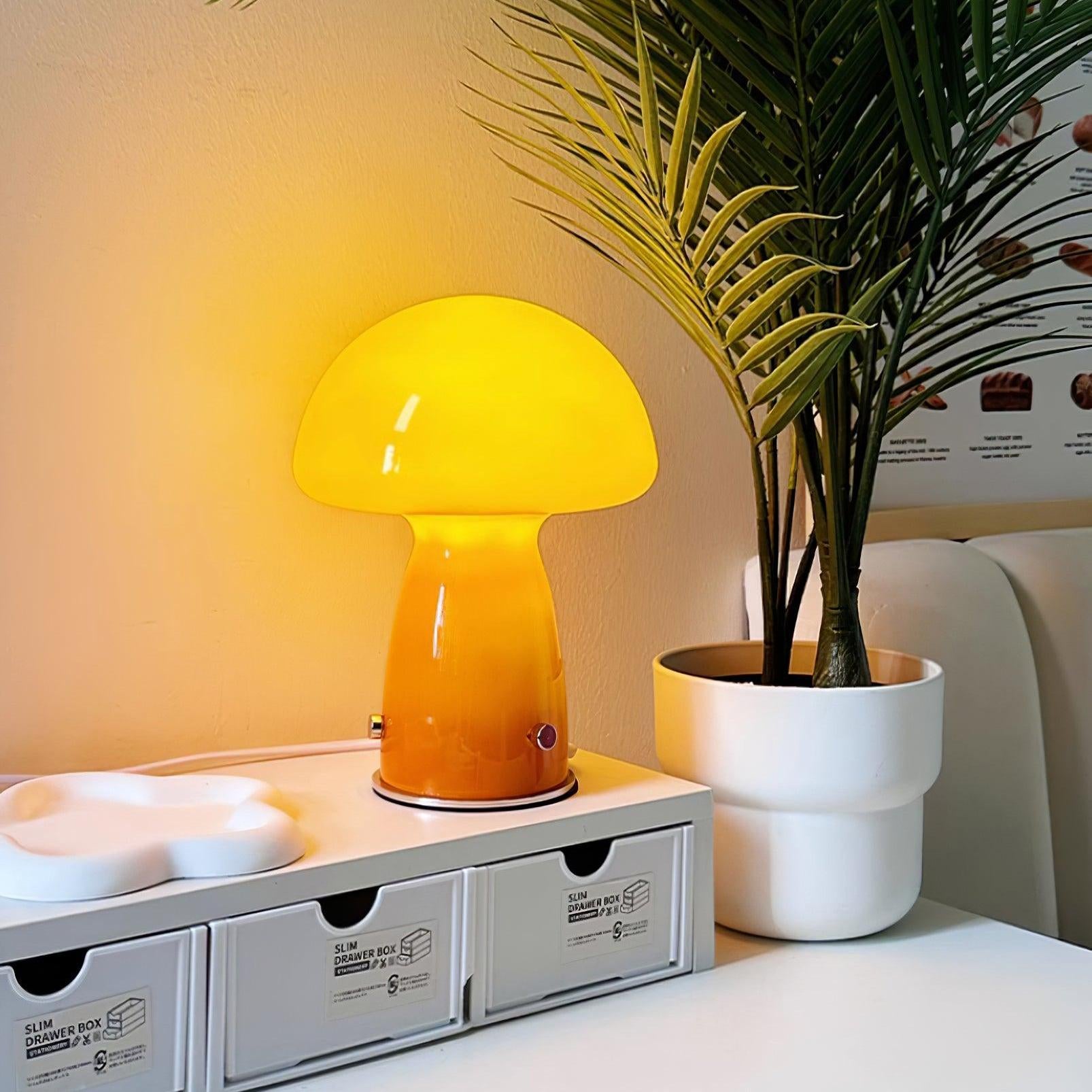 A Bauhaus-inspired glass mushroom table lamp in vibrant orange. Its sculptural form and warm glow bring retro charm and modern character to bedrooms, living rooms, or creative spaces.