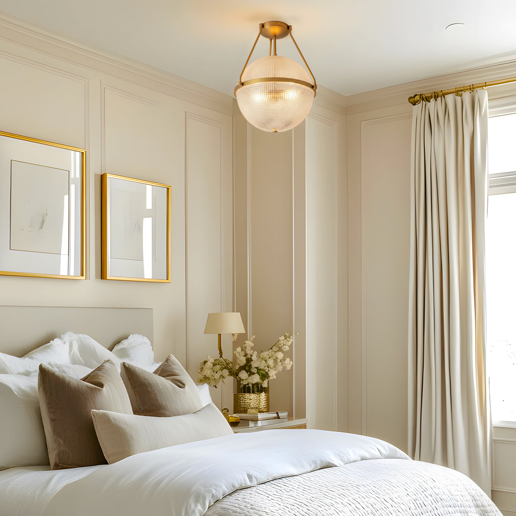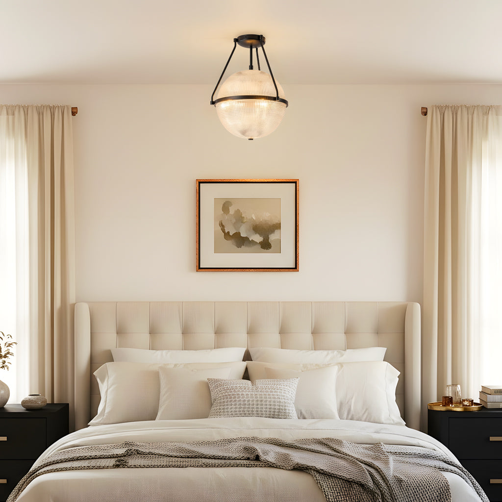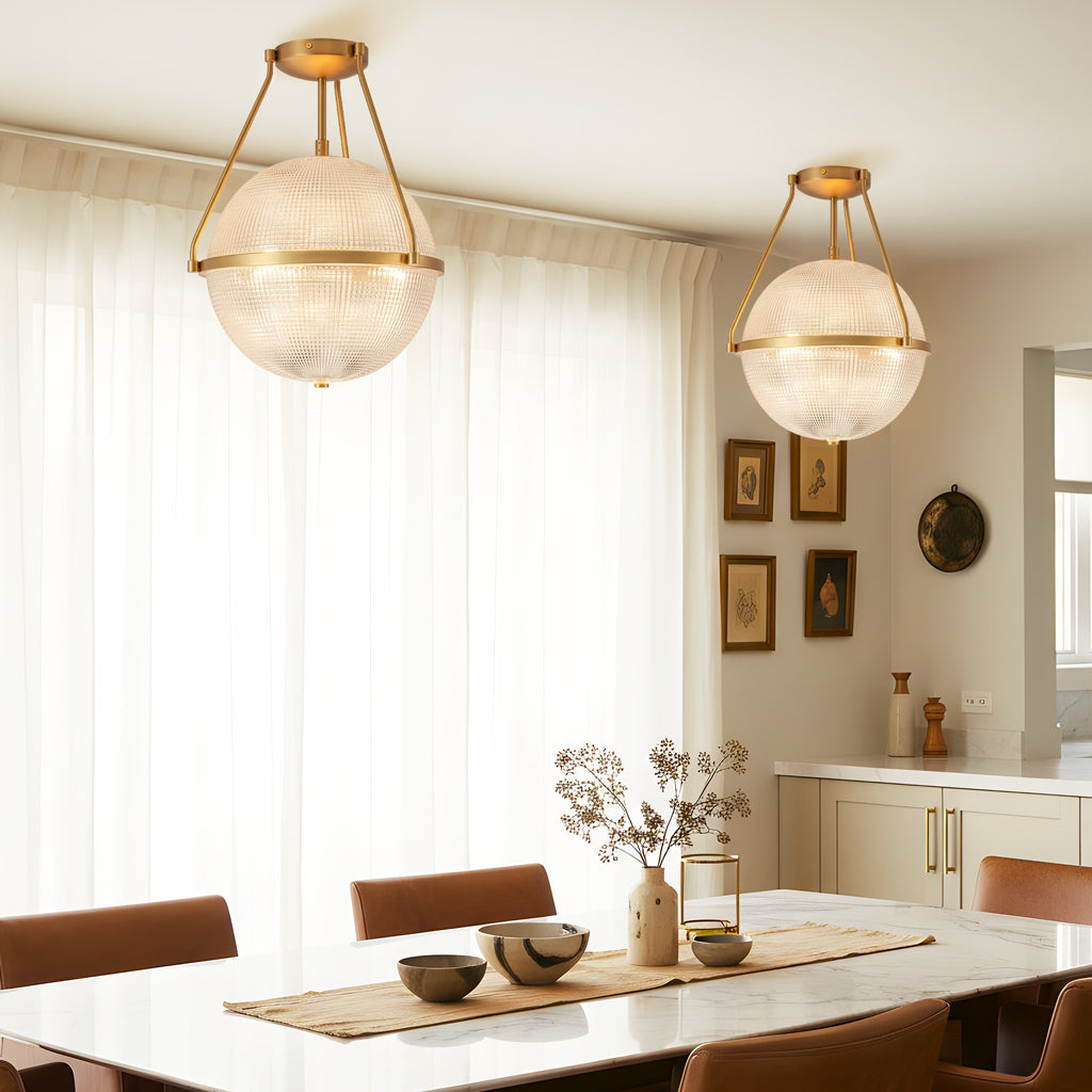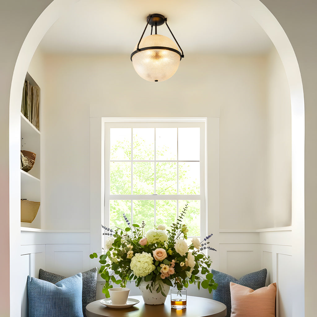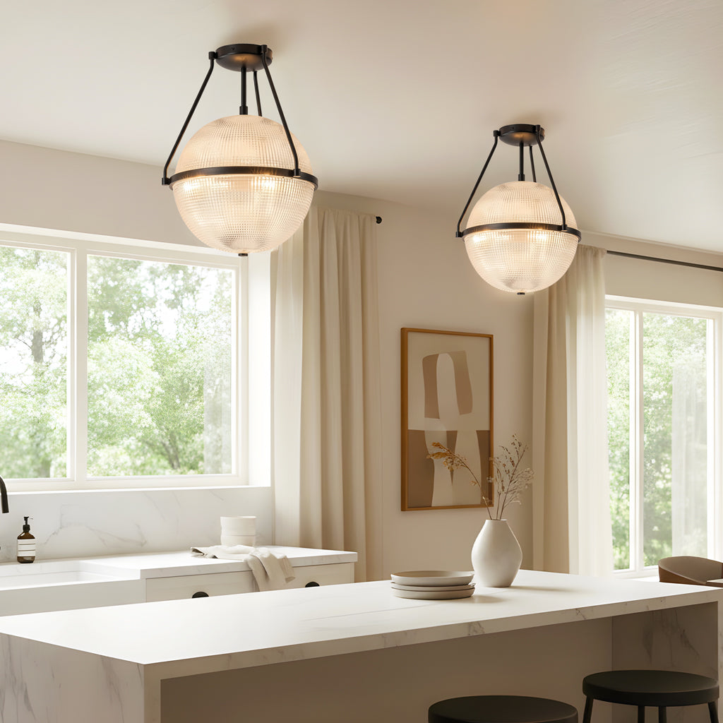 This semi-ceiling lamp blends modern and retro style with a rippled glass shade and sleek metal base. It casts soft, layered light and adds a refined touch to hallways, entryways, kitchen Island or bedrooms.