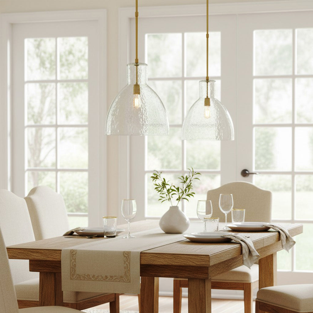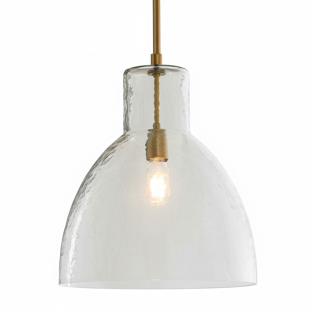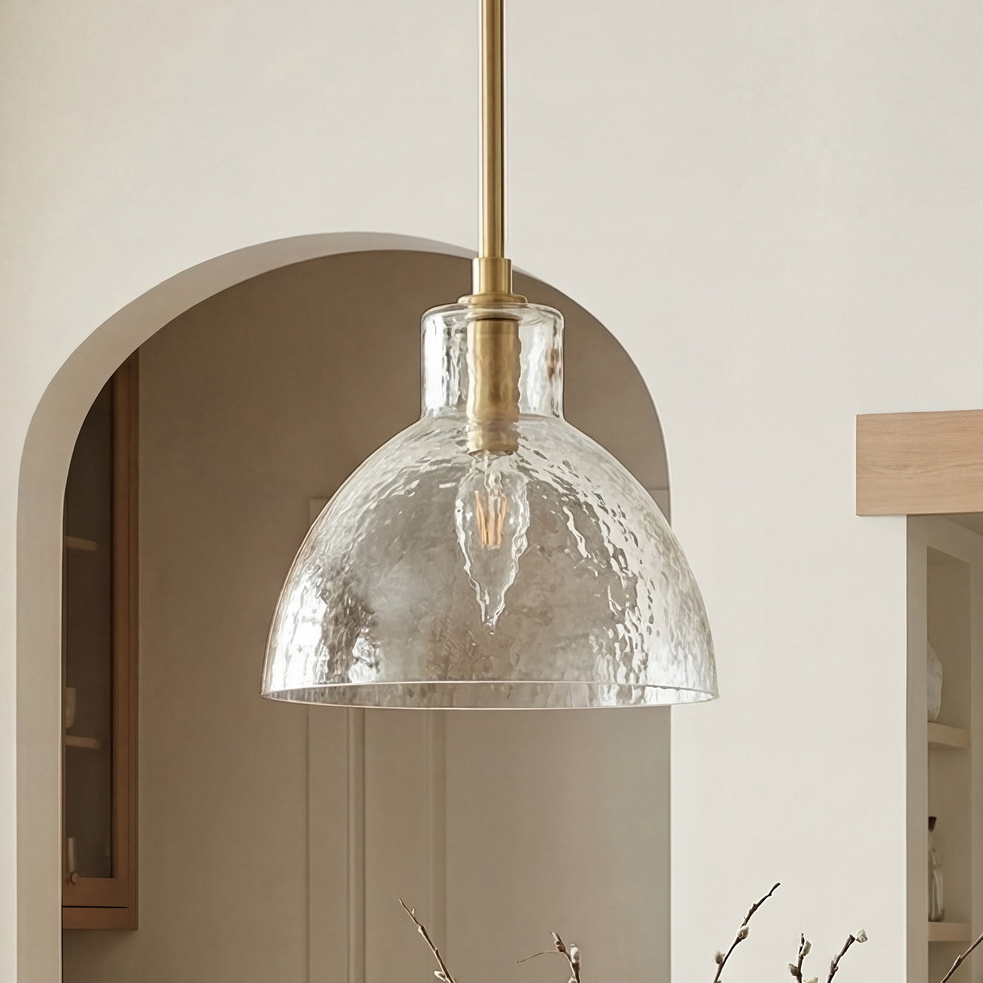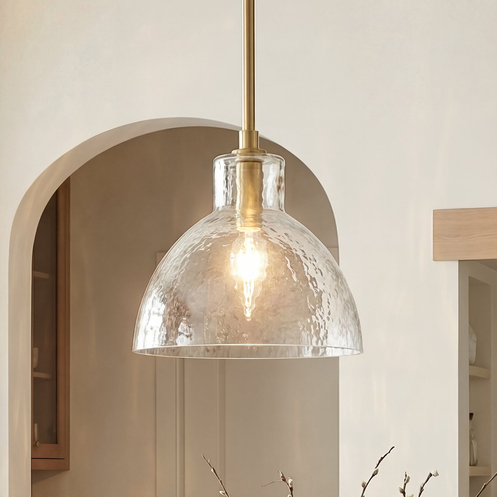 Bring subtle elegance to your space with this hammered glass pendant. Featuring a gently curved silhouette and warm brass details, it casts soft, textured light that adds depth and character to dining rooms, kitchens, and living areas. Perfect alone or in pairs for a sophisticated, modern look.