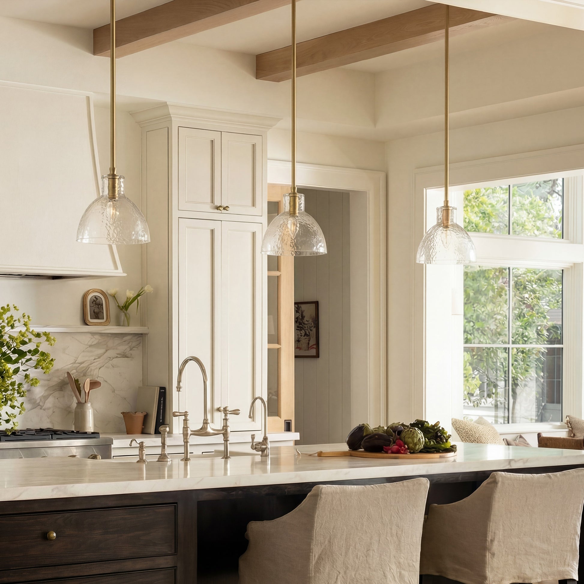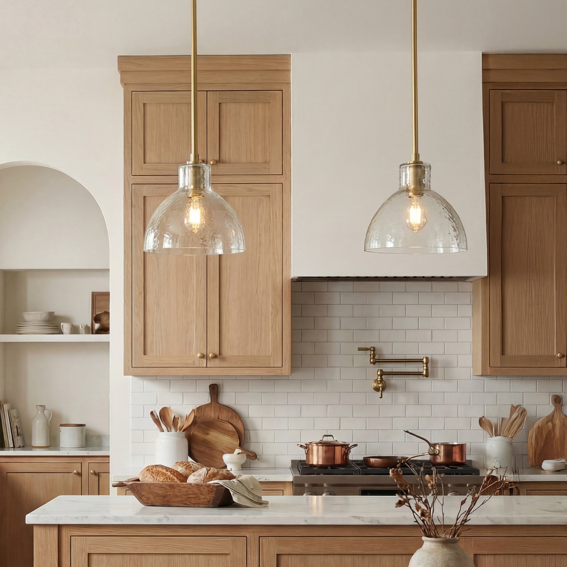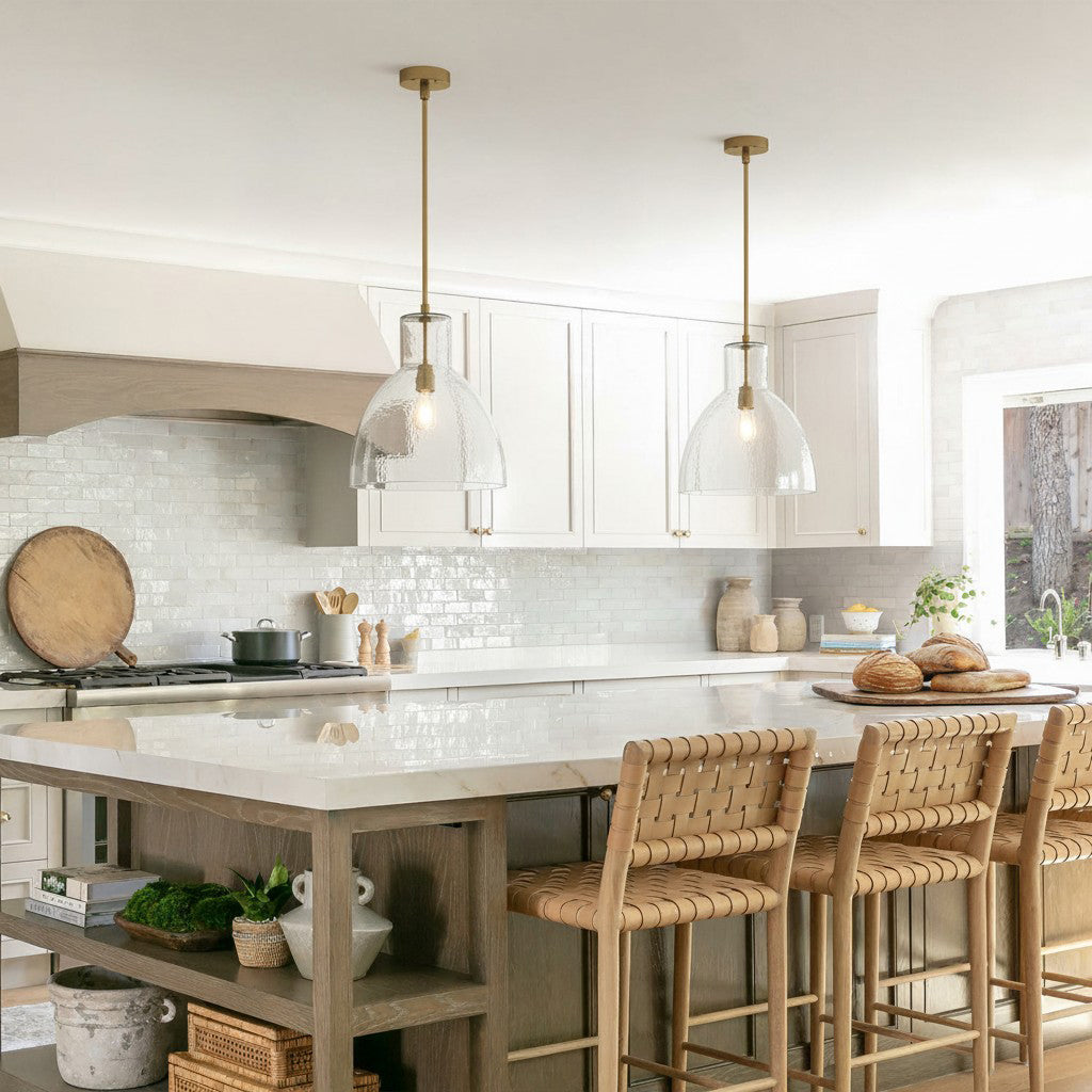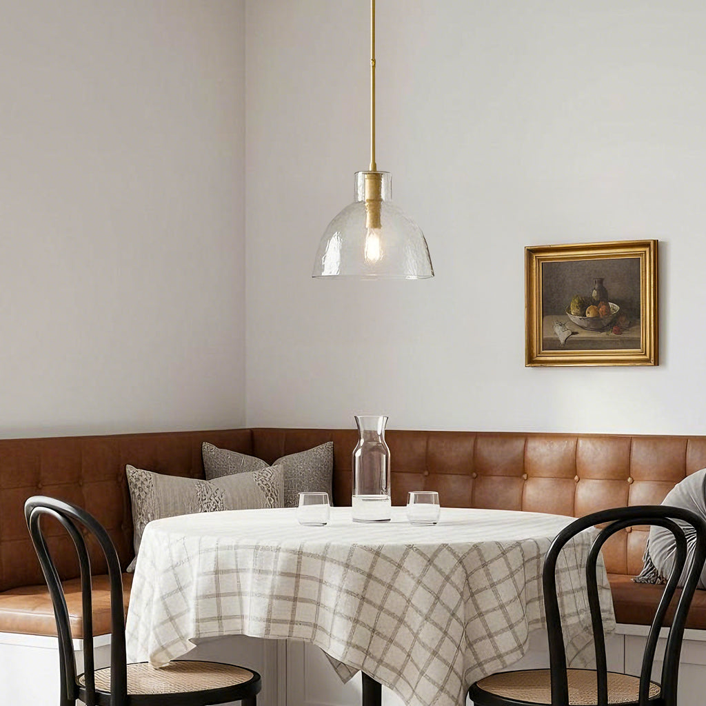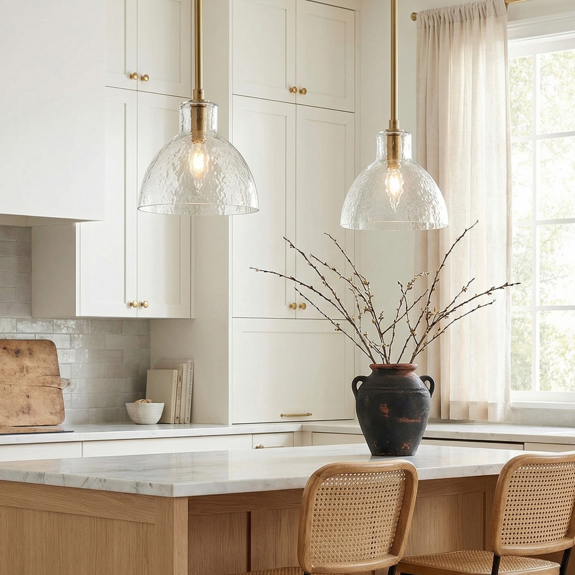 Bring subtle elegance to your space with this hammered glass pendant. Featuring a gently curved silhouette and warm brass details, it casts soft, textured light that adds depth and character to dining rooms, kitchens, and living areas. Perfect alone or in pairs for a sophisticated, modern look.