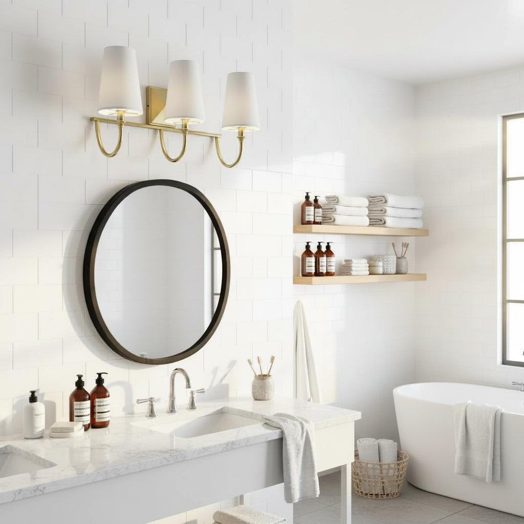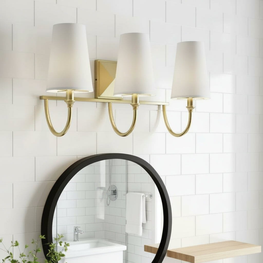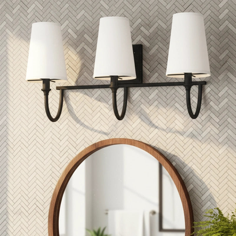 This vanity light highlights timeless elegance with its square backplate and gracefully curved arms. White fabric shades soften the glow to create a warm and inviting atmosphere, perfect for both primary and guest bathrooms.