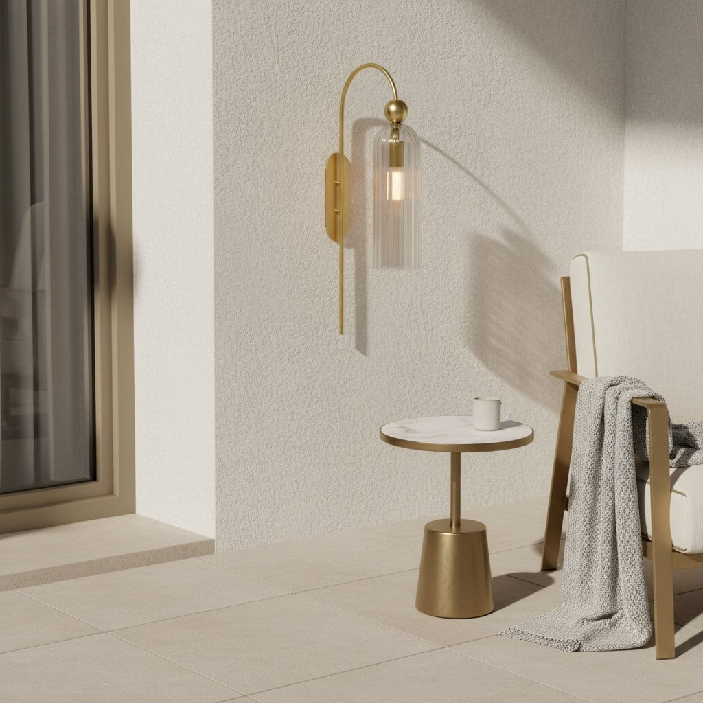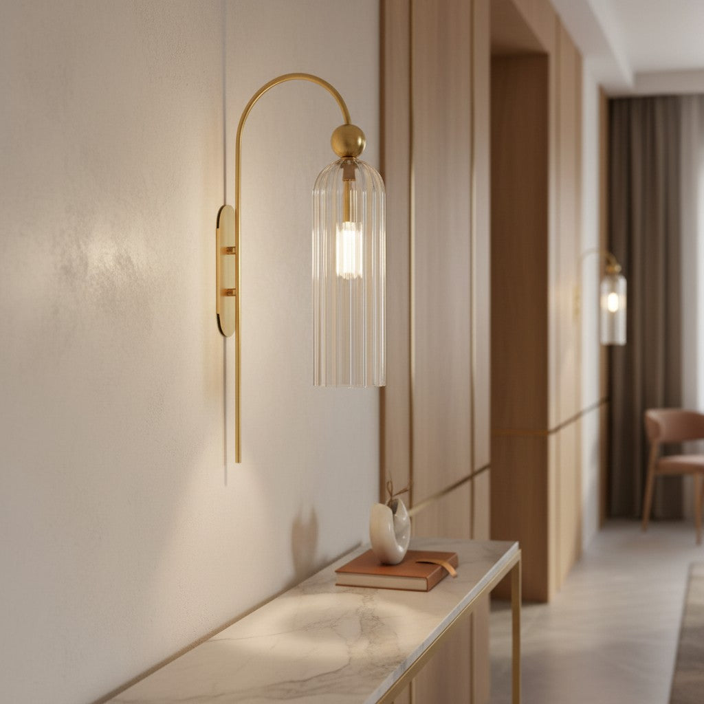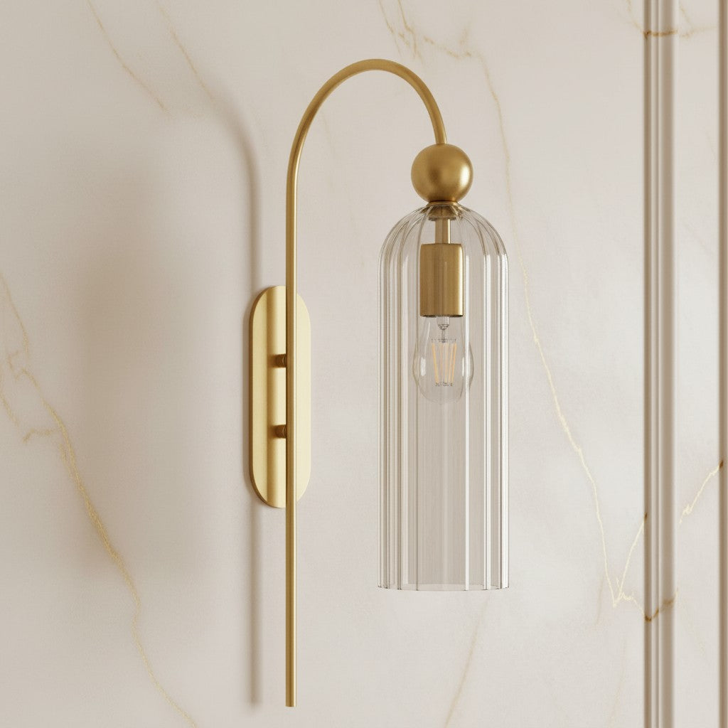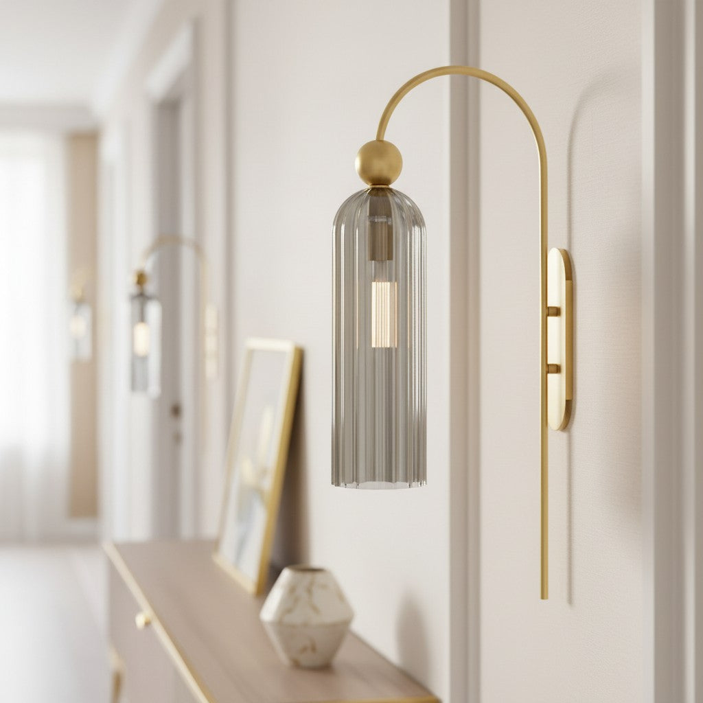 The Azura Wall Sconce brings elegance with its antique-inspired design. Featuring a vertical ribbed glass cylinder and a gold-finished metal frame, it softly diffuses light. Ideal for bedrooms, hallways, and living rooms.