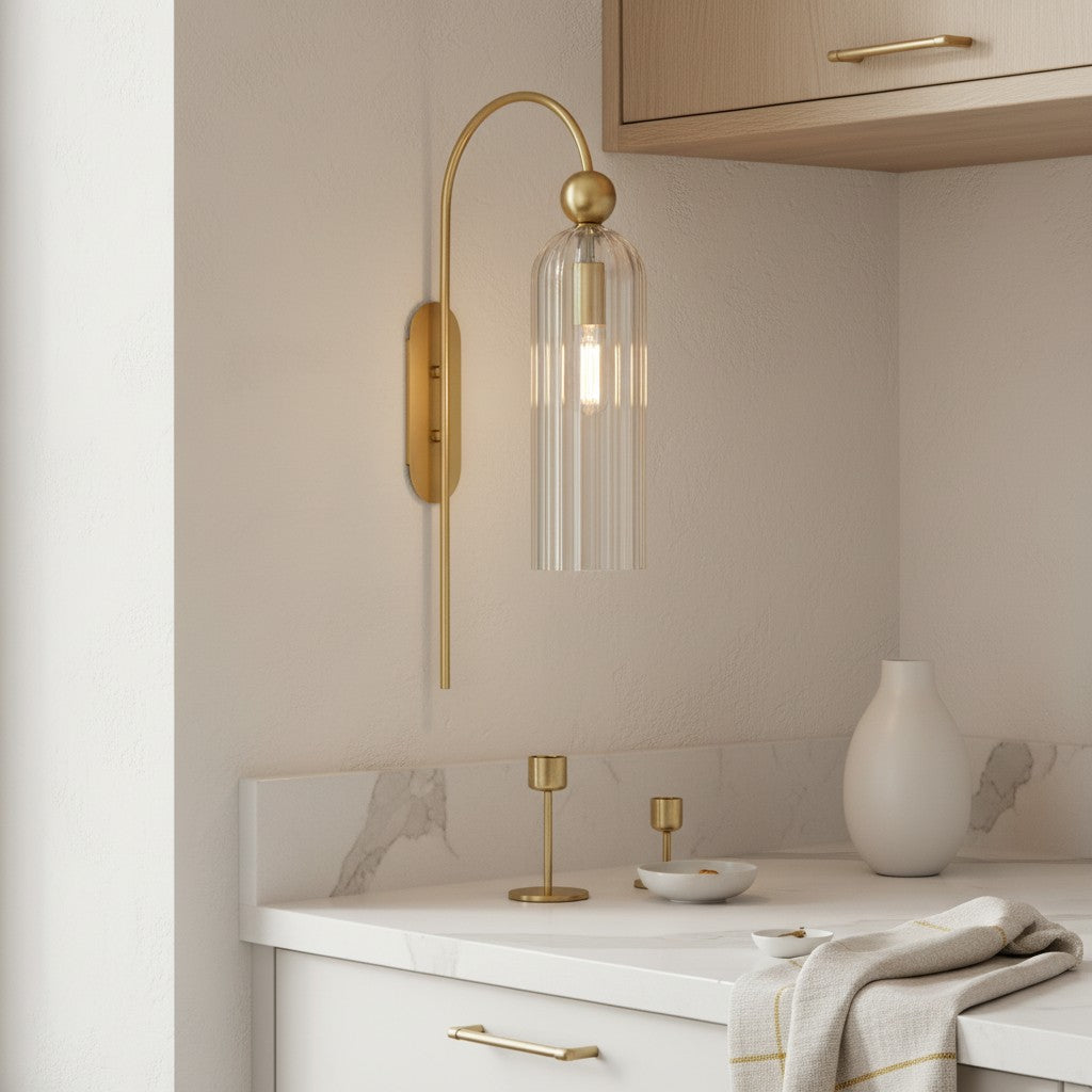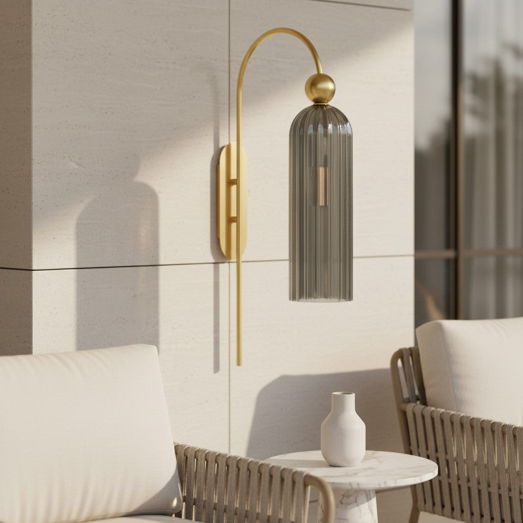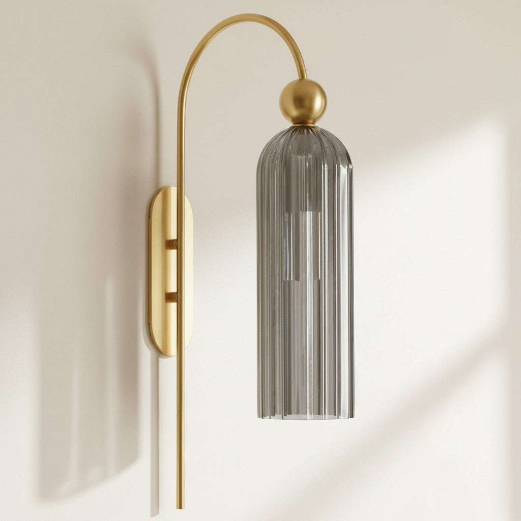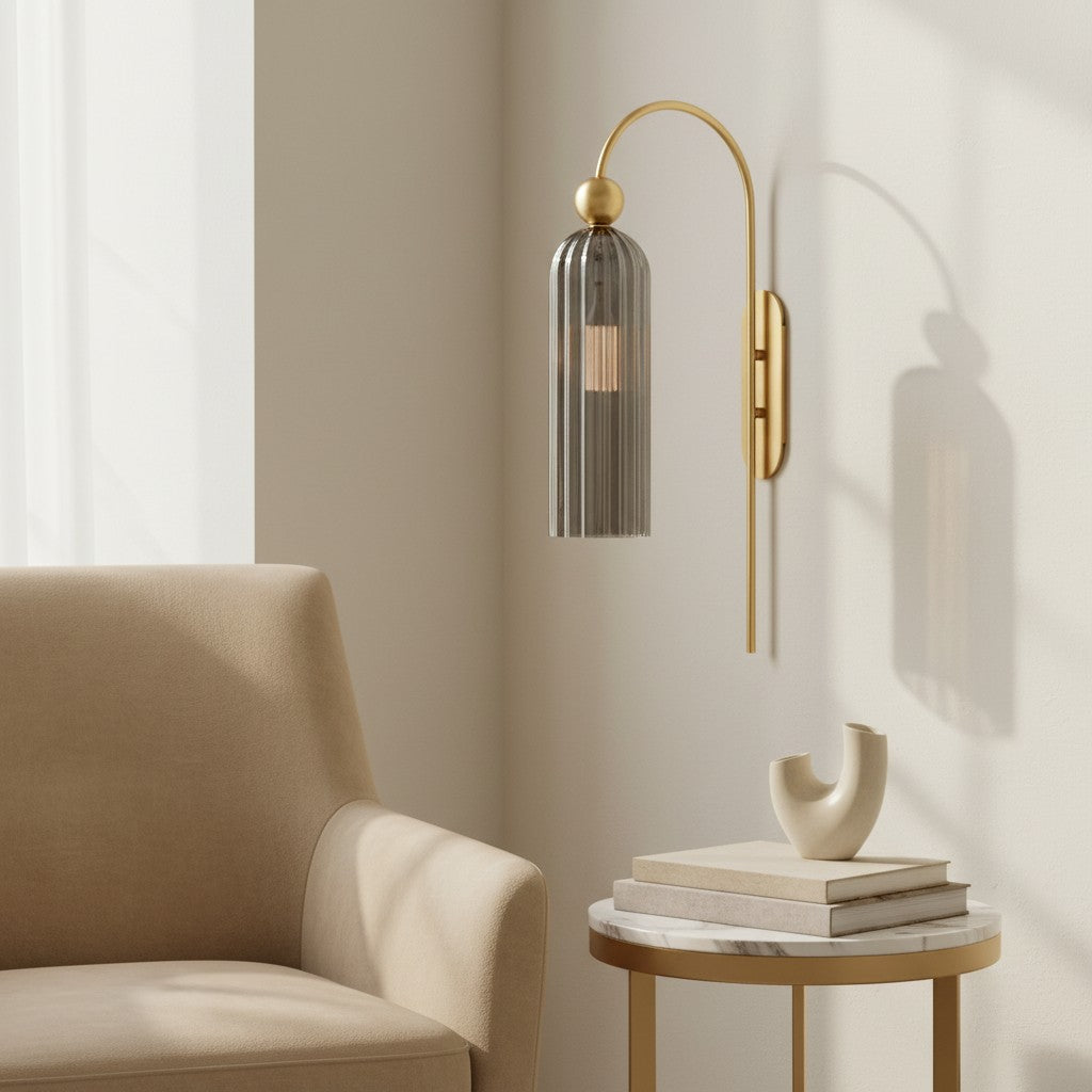 The Azura Wall Sconce brings elegance with its antique-inspired design. Featuring a vertical ribbed glass cylinder and a gold-finished metal frame, it softly diffuses light. Ideal for bedrooms, hallways, and living rooms.