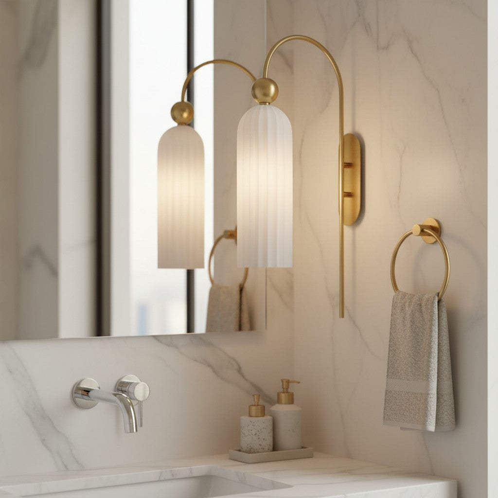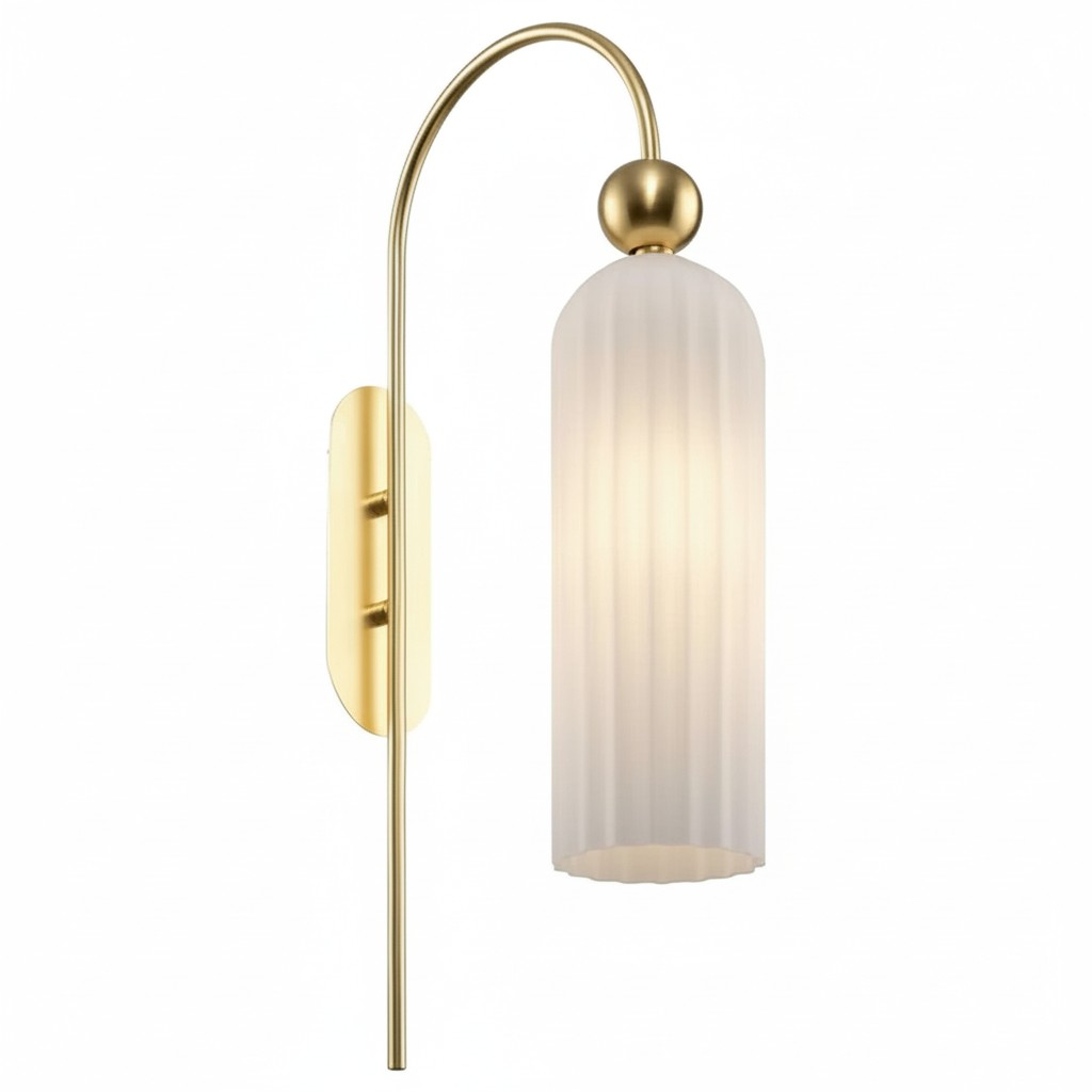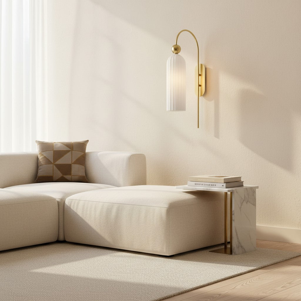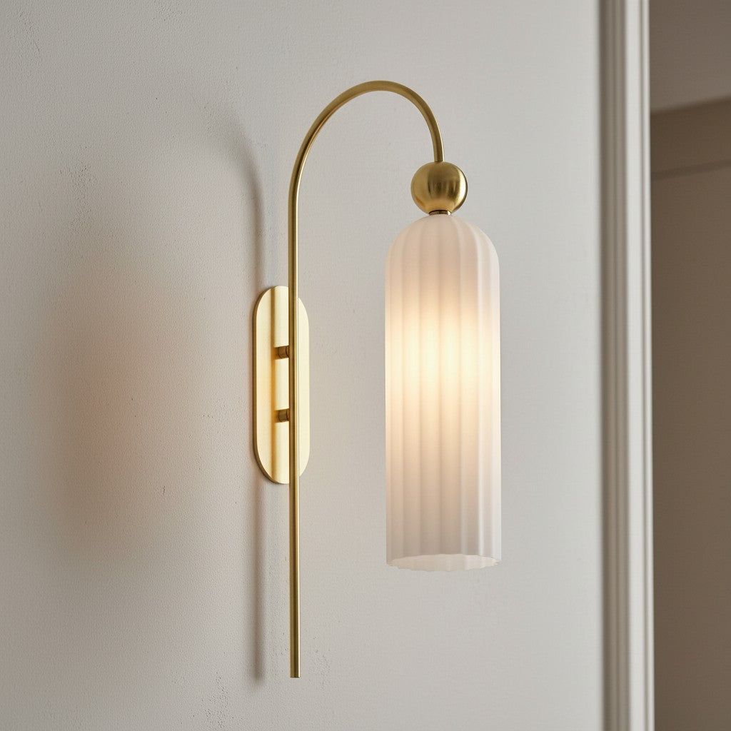 The Azura Wall Sconce brings elegance with its antique-inspired design. Featuring a vertical ribbed glass cylinder and a gold-finished metal frame, it softly diffuses light. Ideal for bedrooms, hallways, and living rooms.
