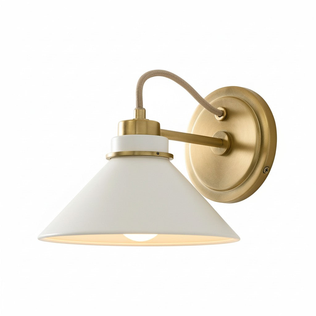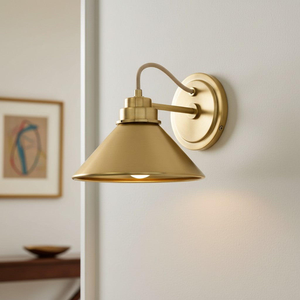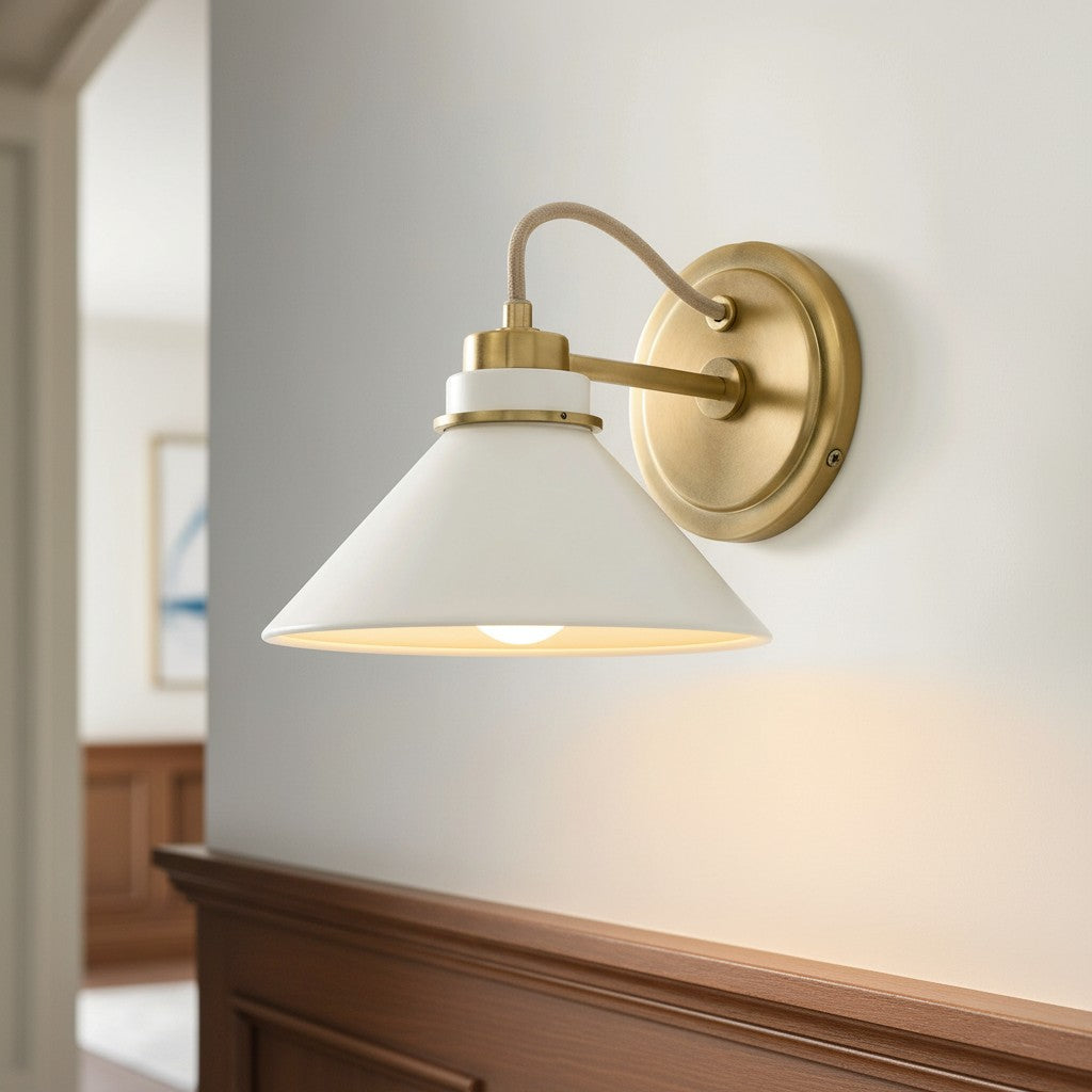 Bring vintage-inspired charm to your walls with the Brielle Wall Sconce. A flared metal shade and exposed fabric cord create a striking blend of texture and shape. Perfect for hallways, bedrooms, or reading nooks.