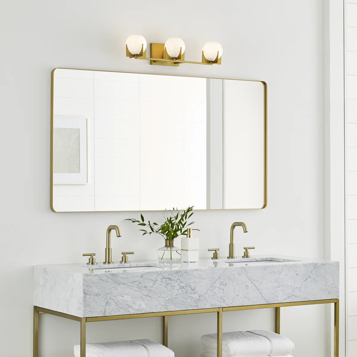 The Chase Vanity Light embodies mid-century modern style with its brass finish and round milk glass shades. Designed for damp spaces, it offers soft diffused light that creates a warm and refined ambiance in bathrooms or dressing areas.