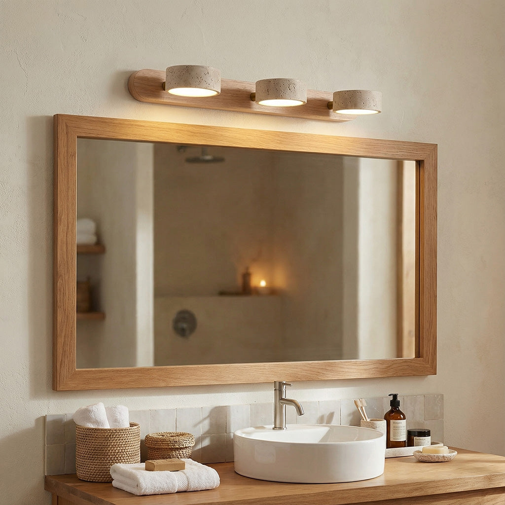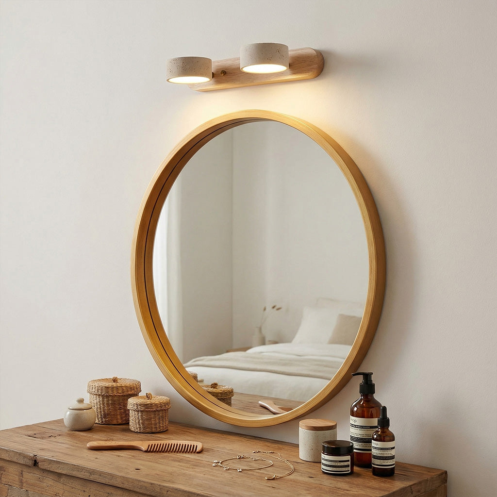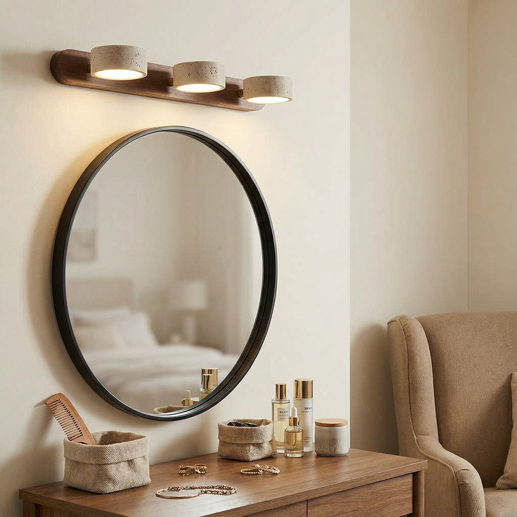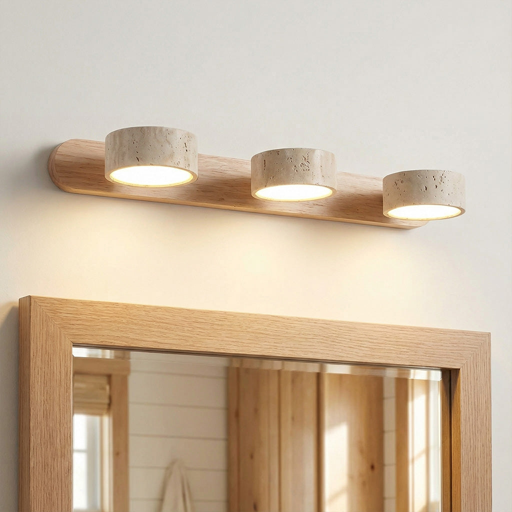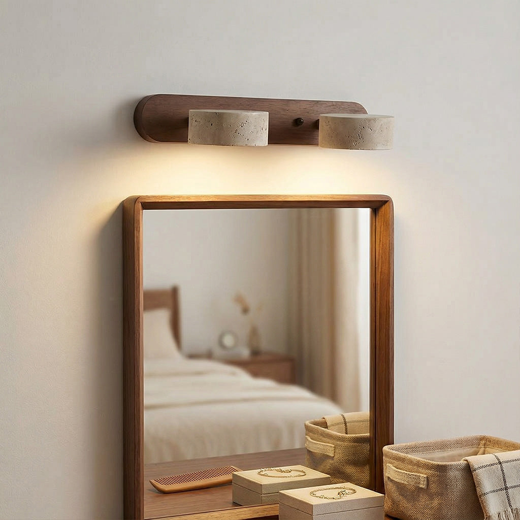 Blending natural travertine stone and reclaimed wood, this wall sconce adds organic warmth to bathrooms, bedrooms, or entryways. The adjustable arms allow flexible positioning over mirrors, while integrated LEDs provide soft illumination.