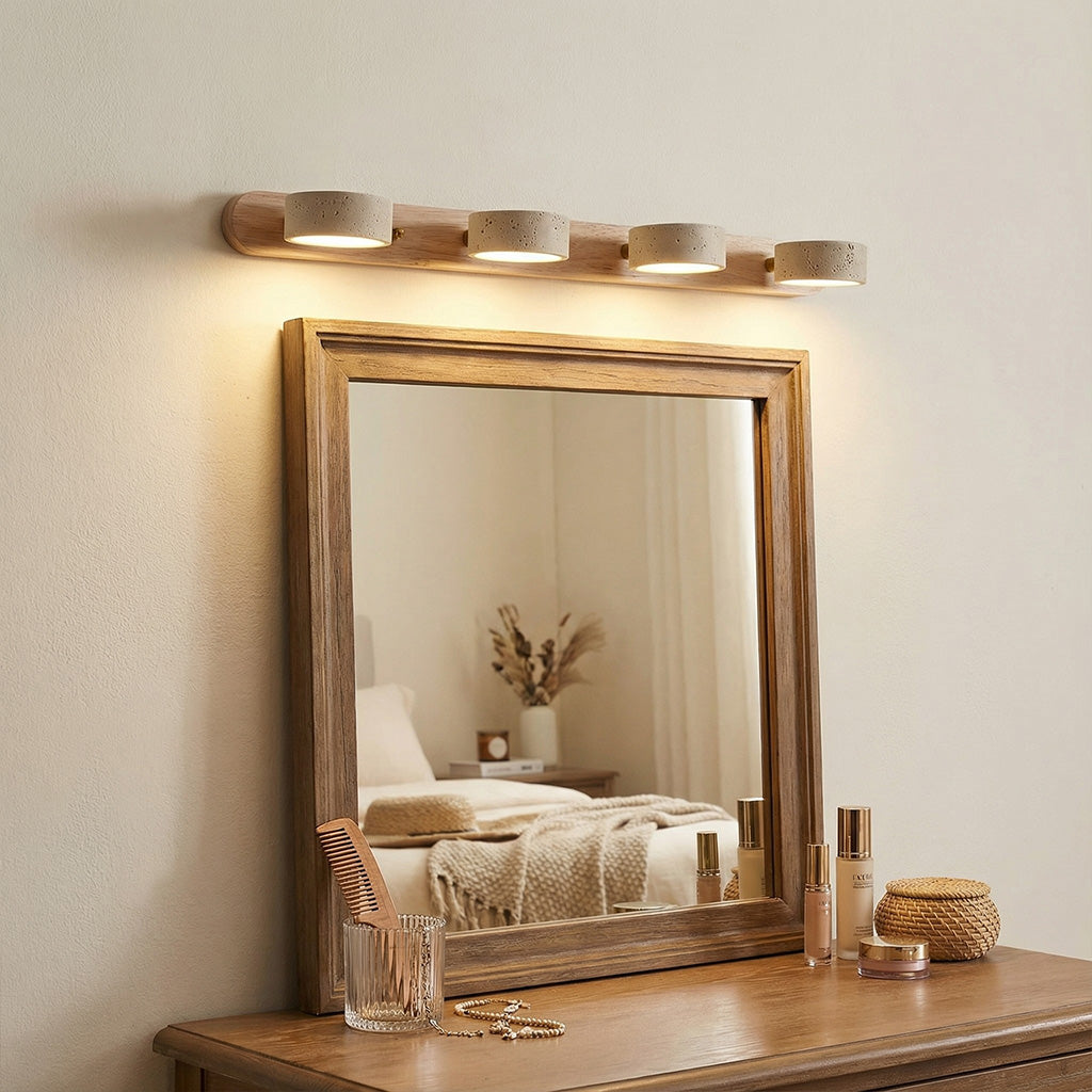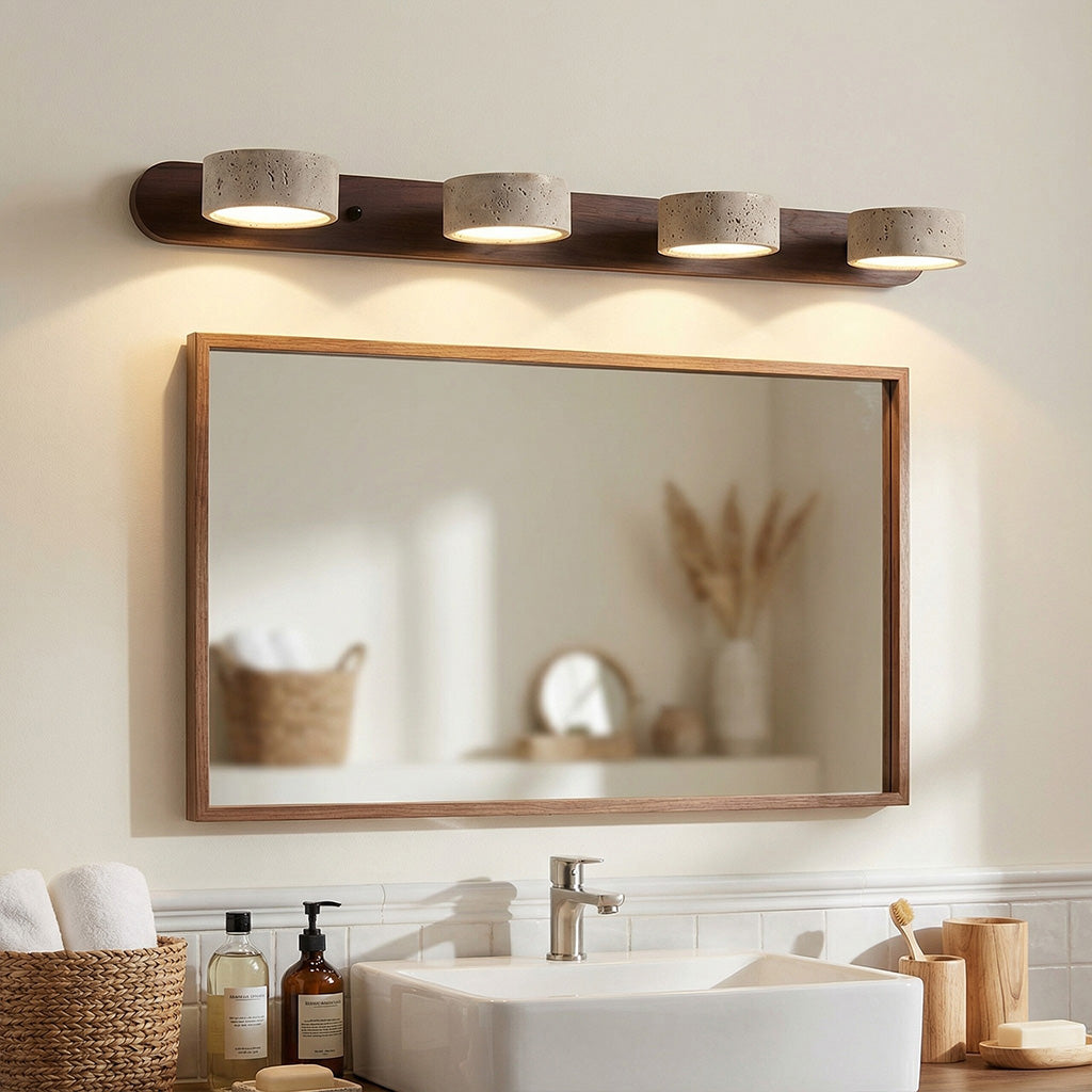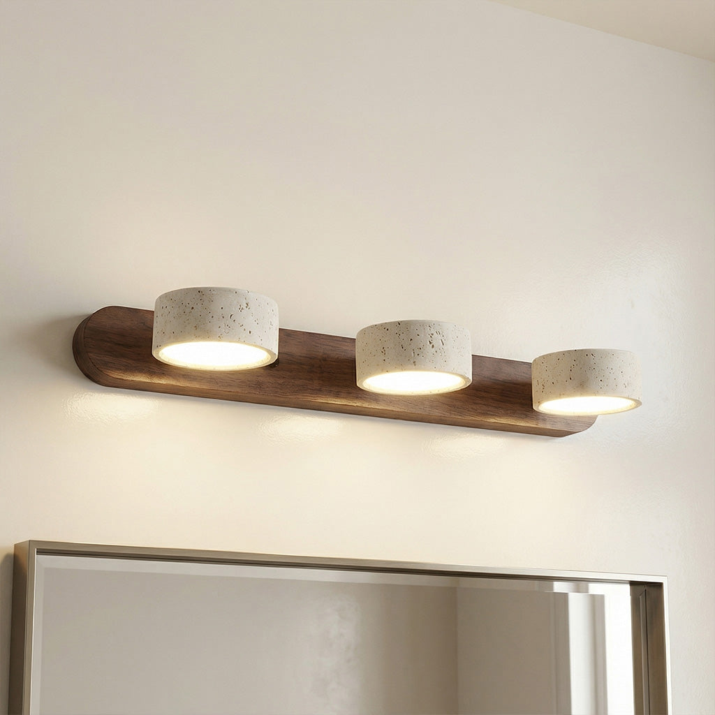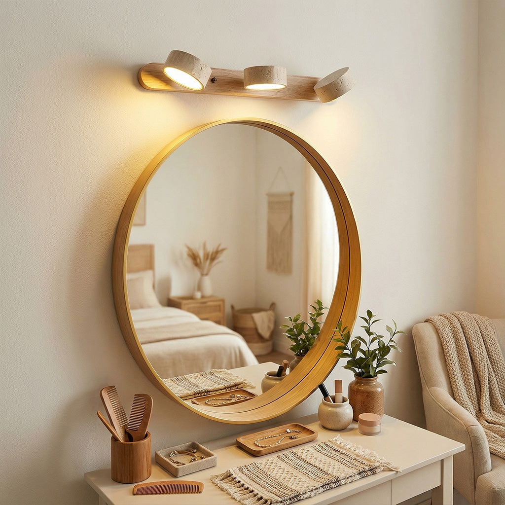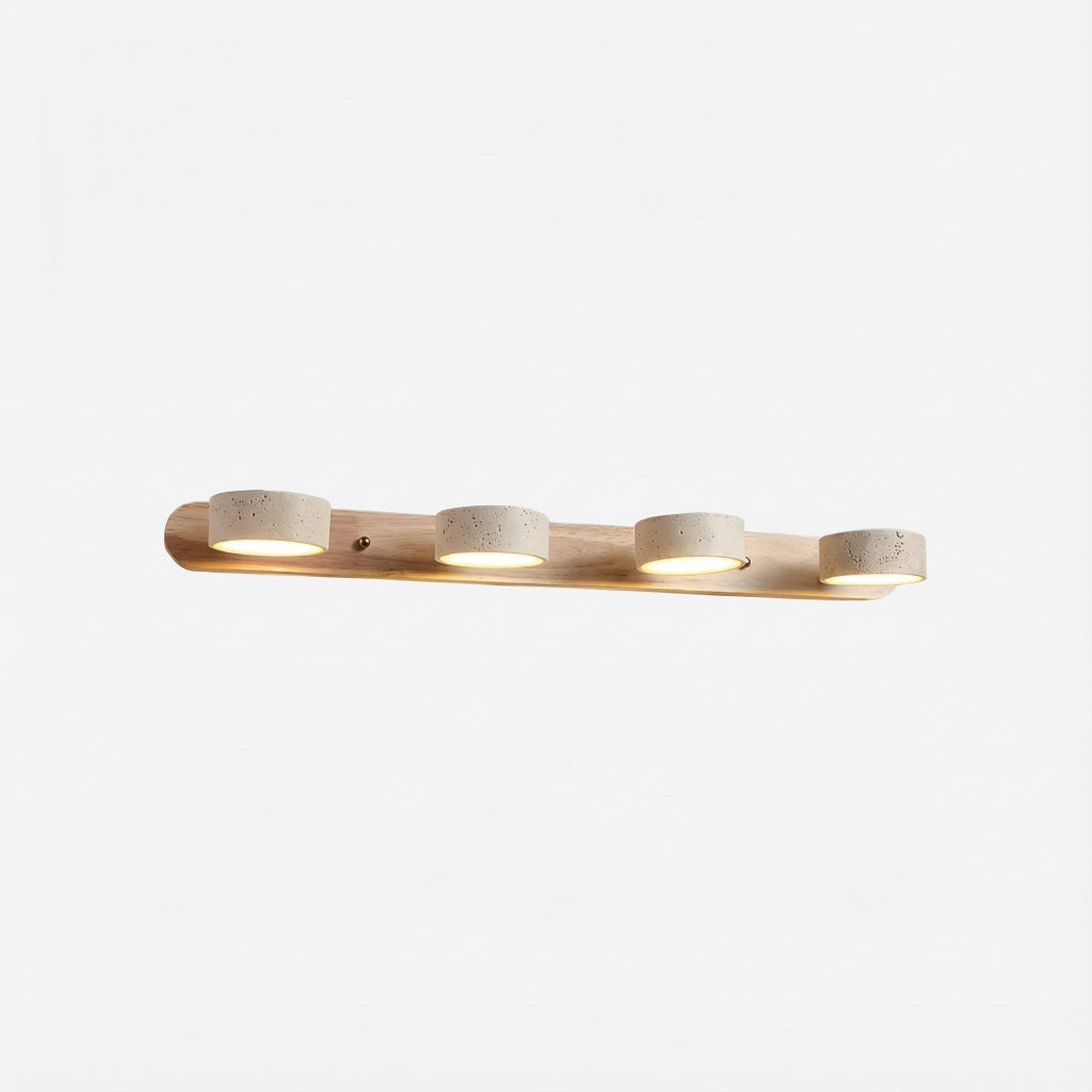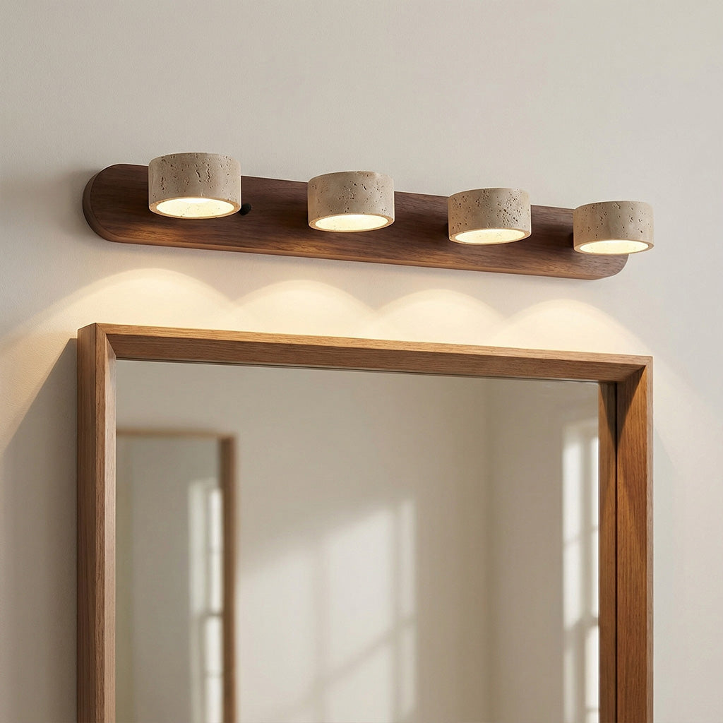 Blending natural travertine stone and reclaimed wood, this wall sconce adds organic warmth to bathrooms, bedrooms, or entryways. The adjustable arms allow flexible positioning over mirrors, while integrated LEDs provide soft illumination.