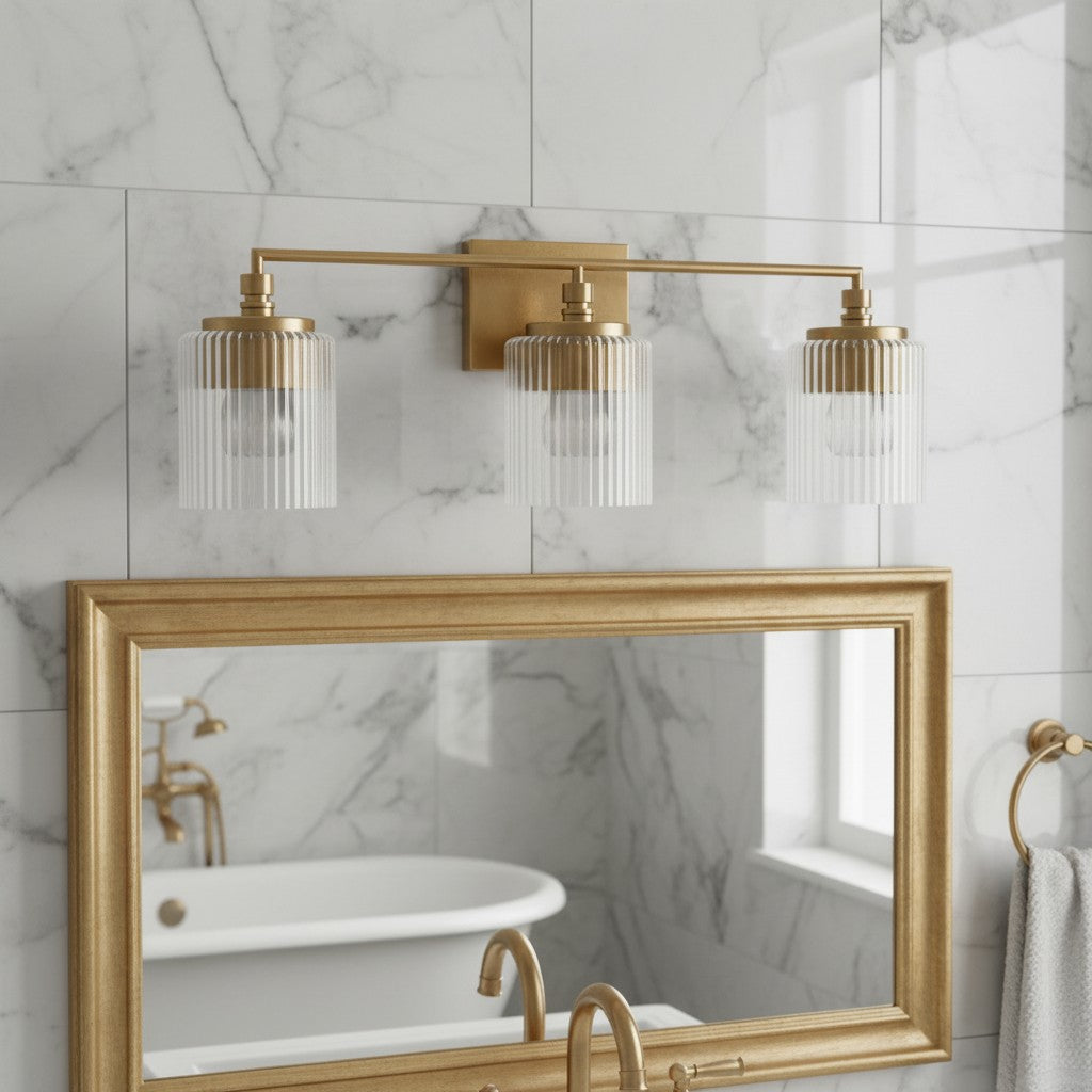 The Eliot Vanity Lamp features three ribbed glass cylinders and a sleek modern frame that balance style and function. Its warm glow and premium finishes make it a perfect choice for bathrooms, powder rooms, and dressing areas.