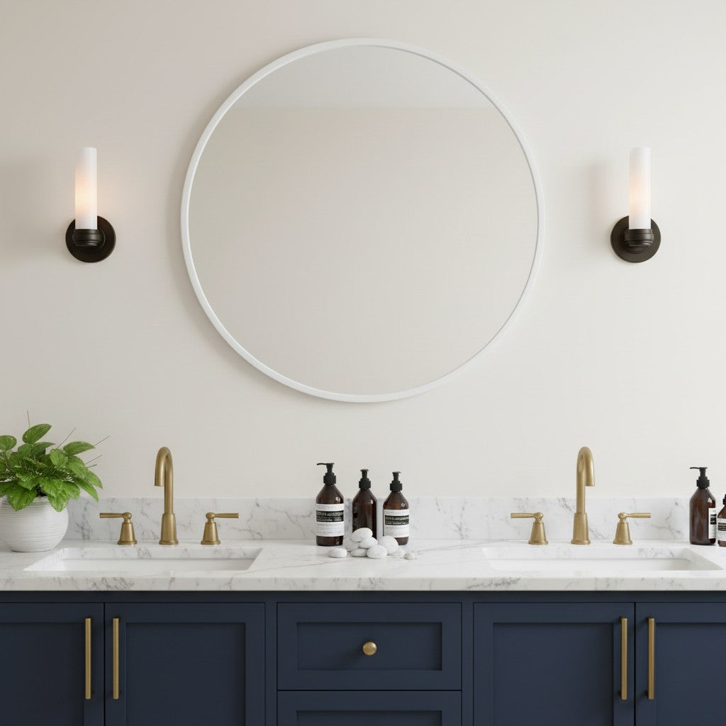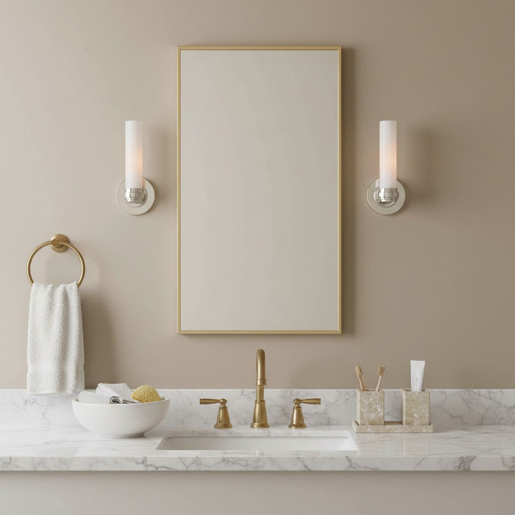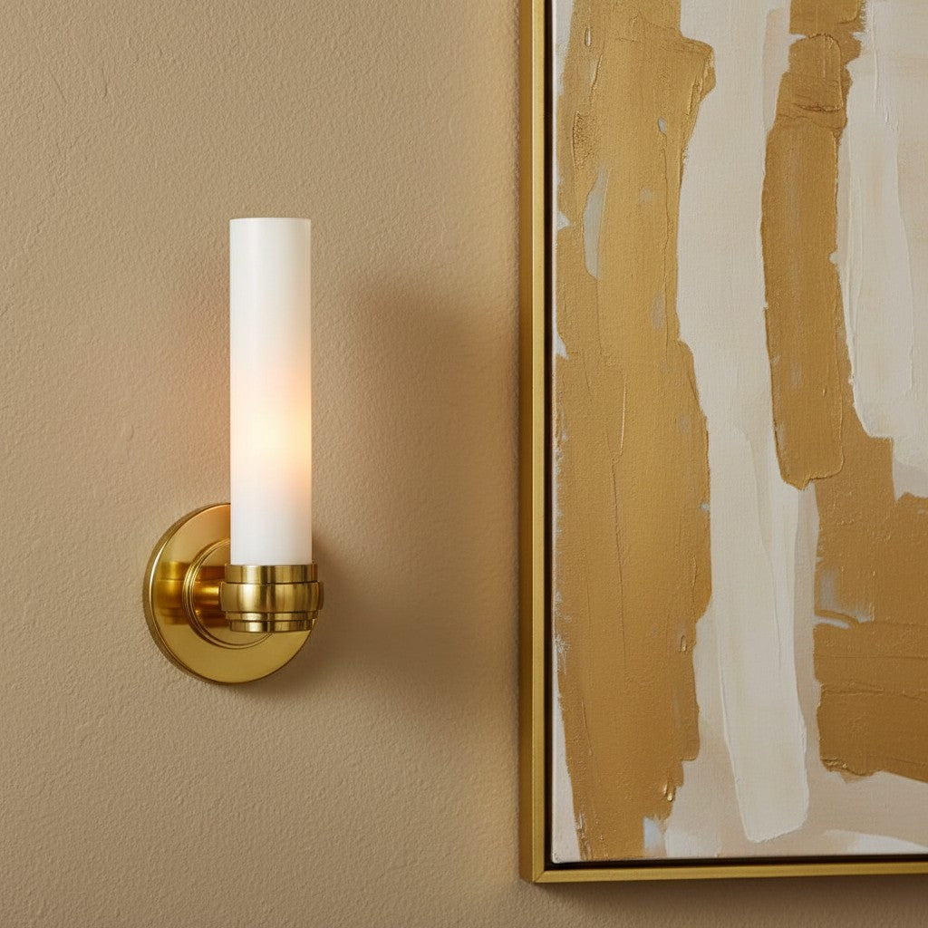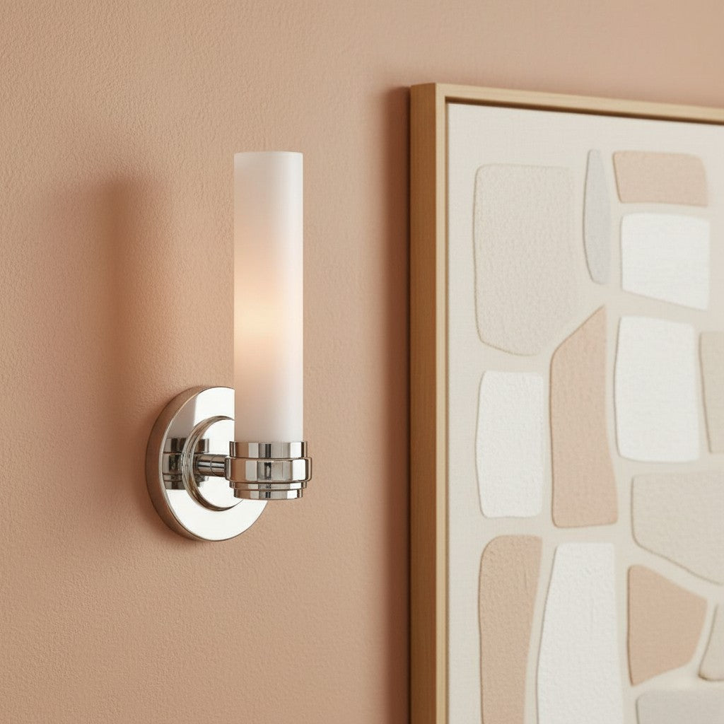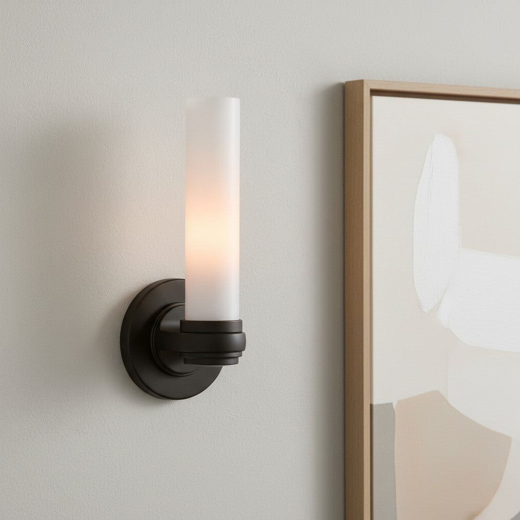 Combining sleek modern design with classic milk glass, the Liora Modern Milk Glass Tube Wall Sconce brings elegant charm to living rooms, hallways, or bedrooms. The cylindrical glass shade diffuses soft, ambient light, while the minimalist metal frame offers a timeless appeal.