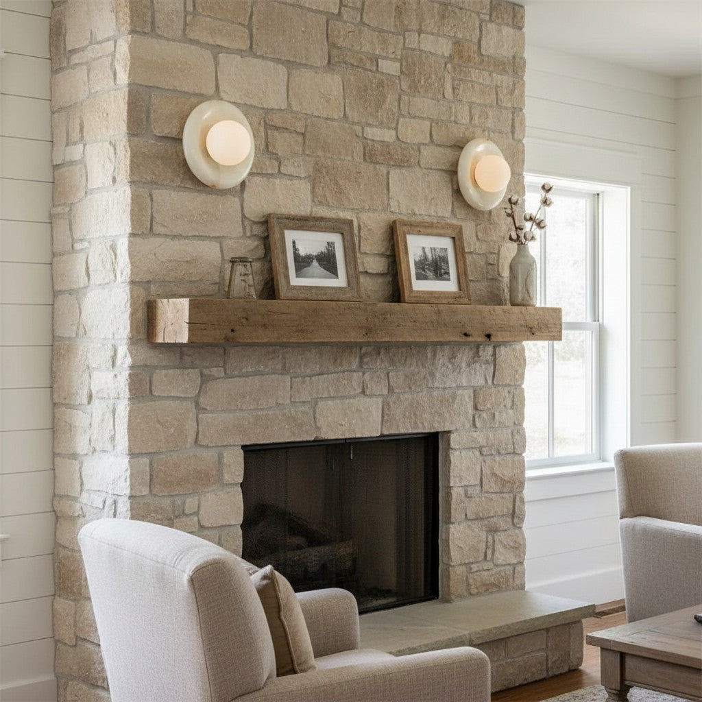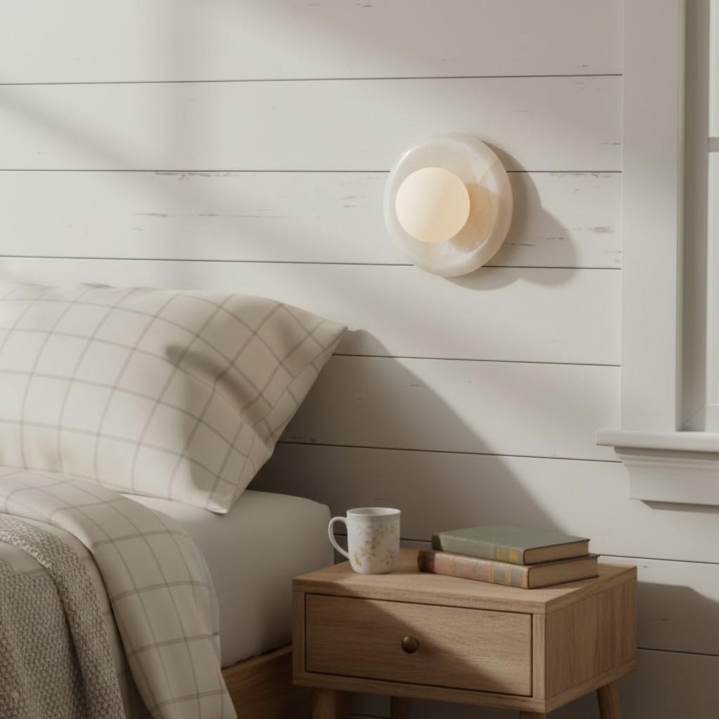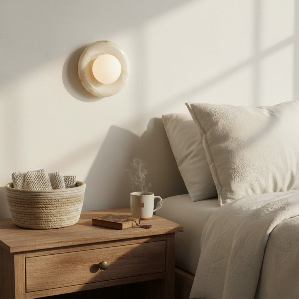 The Rhea Wall Sconce merges modern design with timeless elegance, featuring a central glass globe that casts a soft glow. A curved natural stone backplate enhances its refined appeal, ideal for bedrooms, hallways, or living rooms.