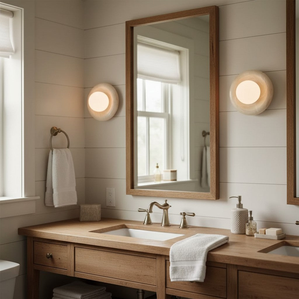 A perfectly round silhouette pairs with a curved natural stone backplate, blending sculptural beauty with refined craftsmanship.
