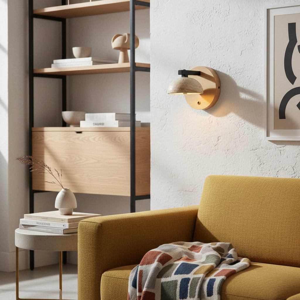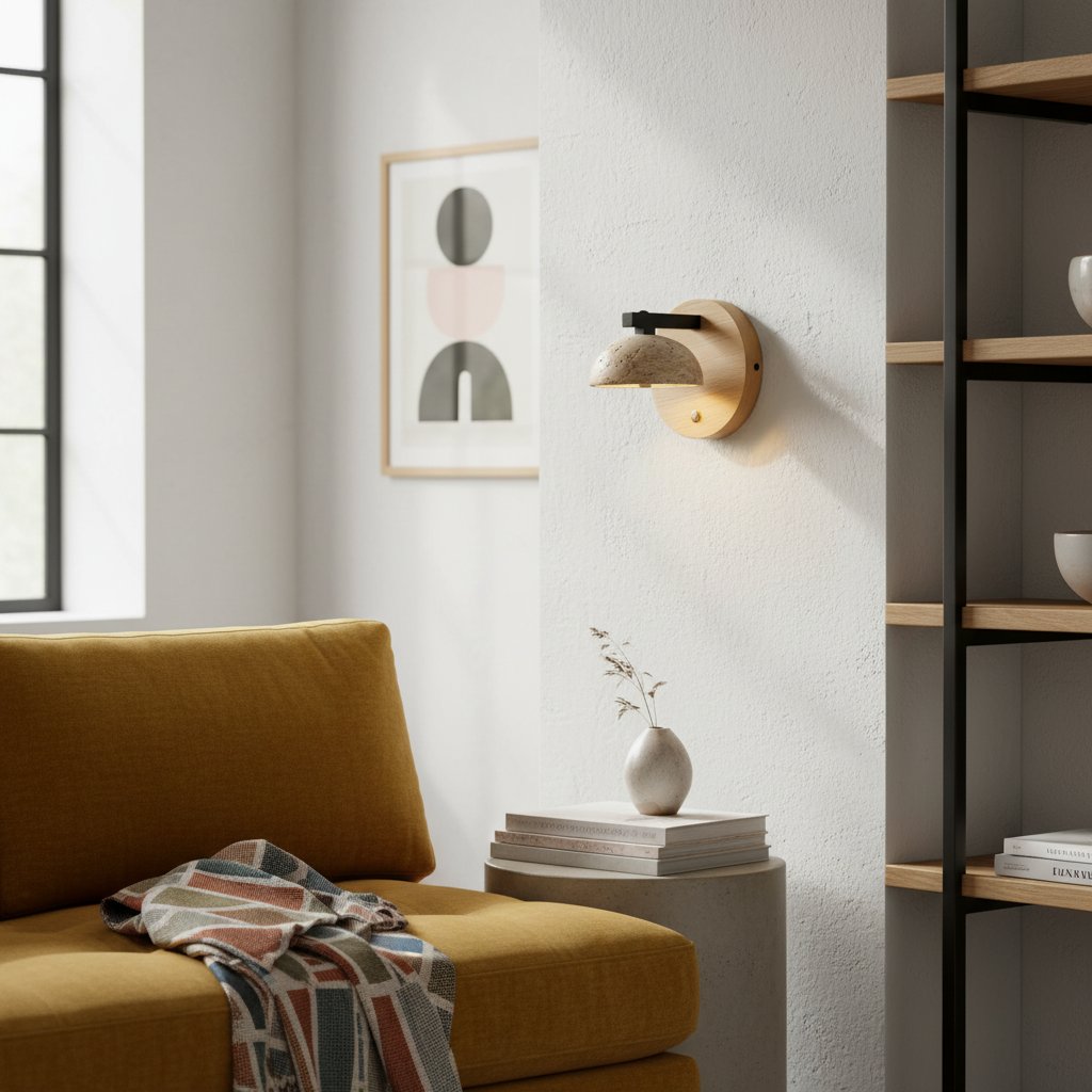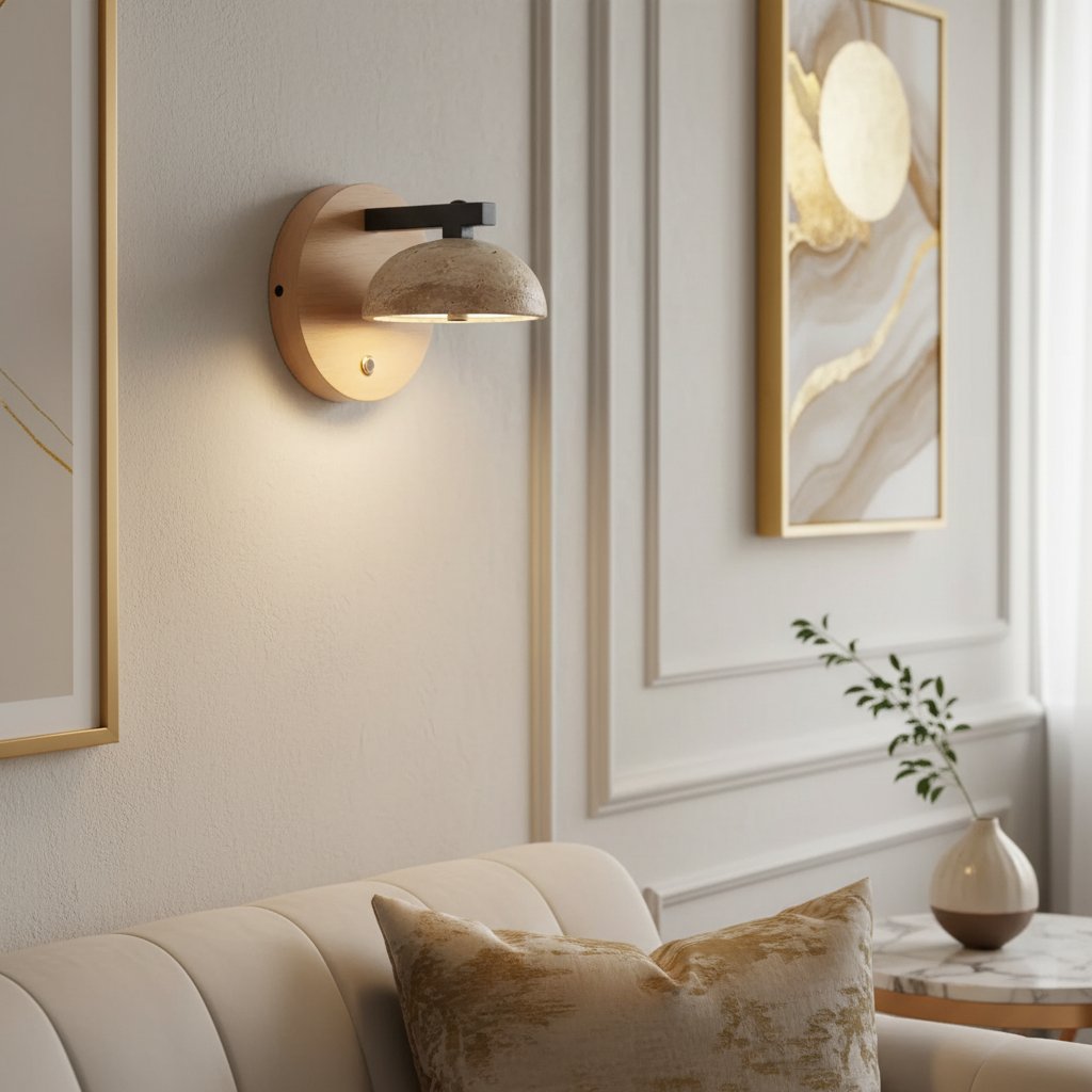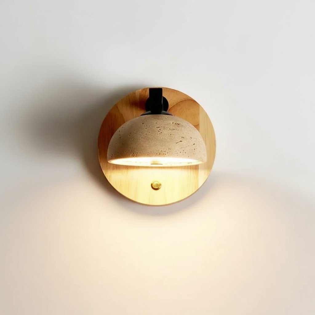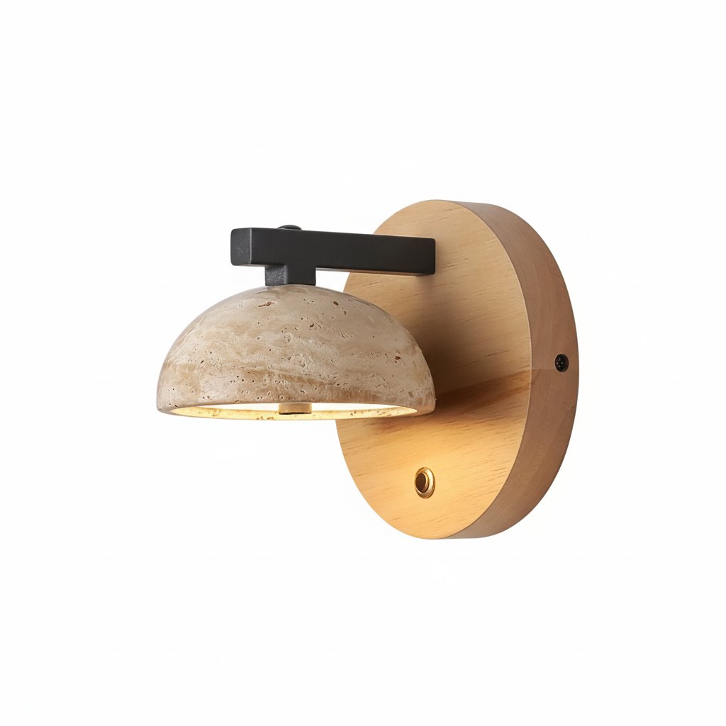 The Riley wall lamp cleverly blends natural travertine and solid wood, embodying a minimalist, vintage feel. Its soft light easily creates a soothing ambiance, perfect for establishing a tranquil retreat indoors.