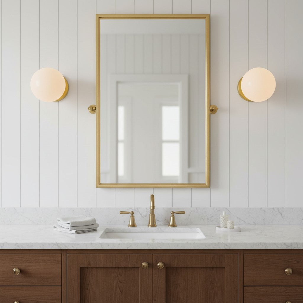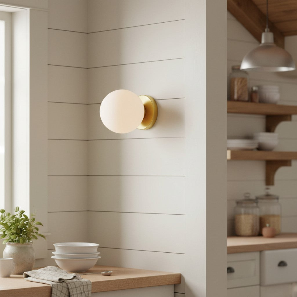 The Silenus Wall Sconce blends Mid-Century Modern elegance with contemporary craftsmanship, featuring a solid brass base and an opal glass globe. Perfect for hallways, living rooms, or bedrooms seeking refined charm.