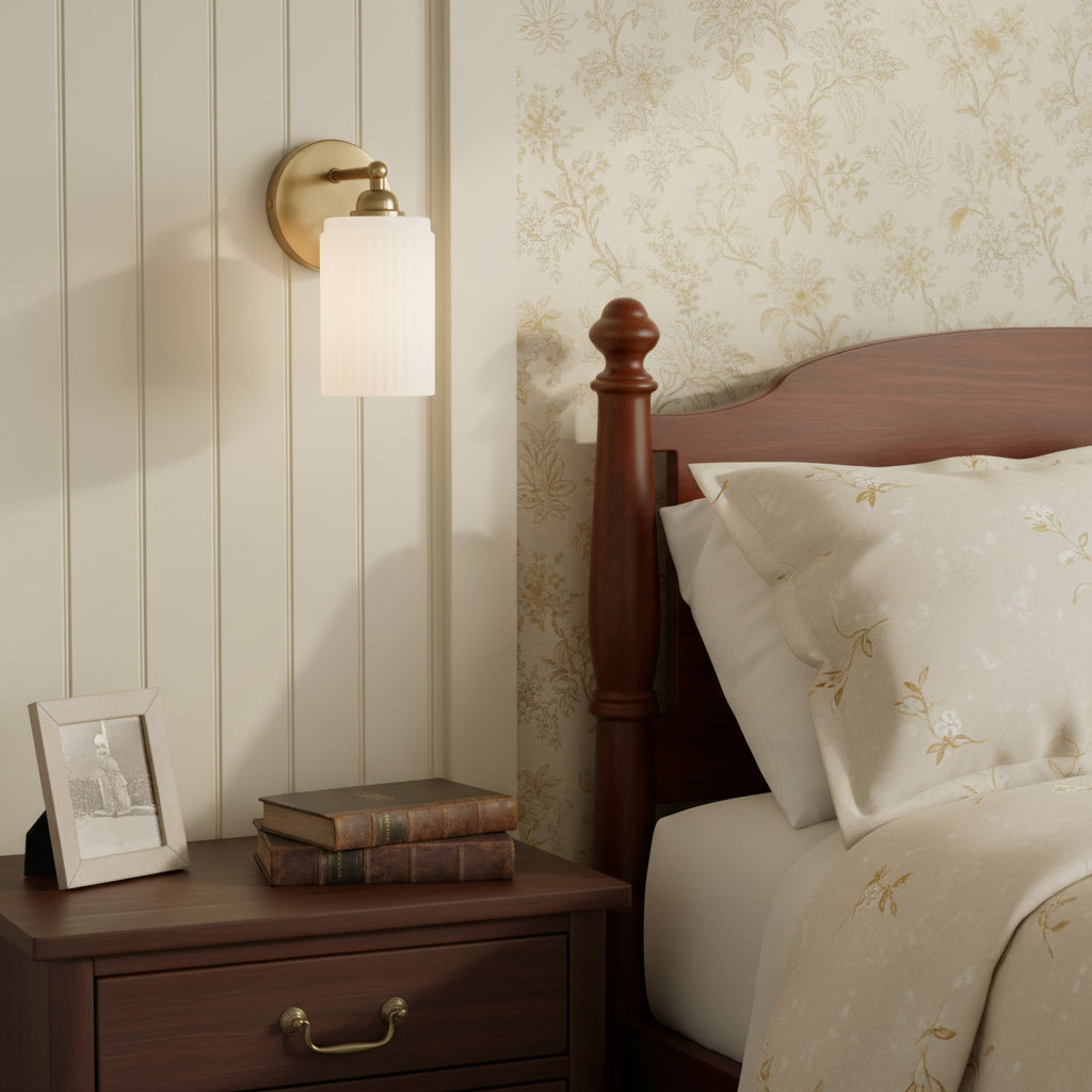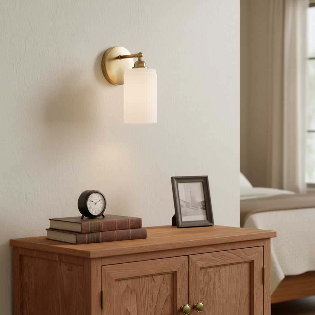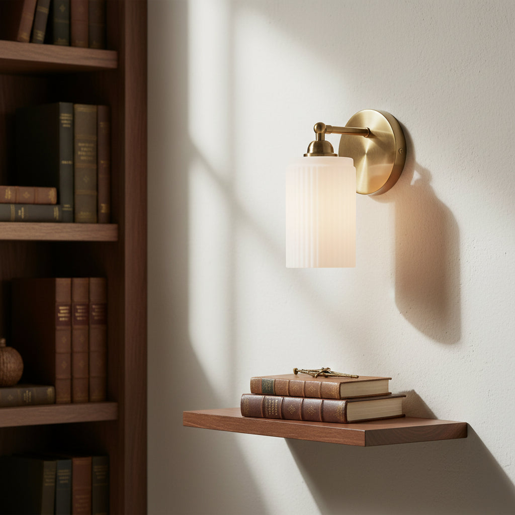 The Wall Sconce blends retro charm with modern elegance. Brass finish and ribbed glass shade cast warm, inviting light, ideal for adding a touch of sophistication to any space.