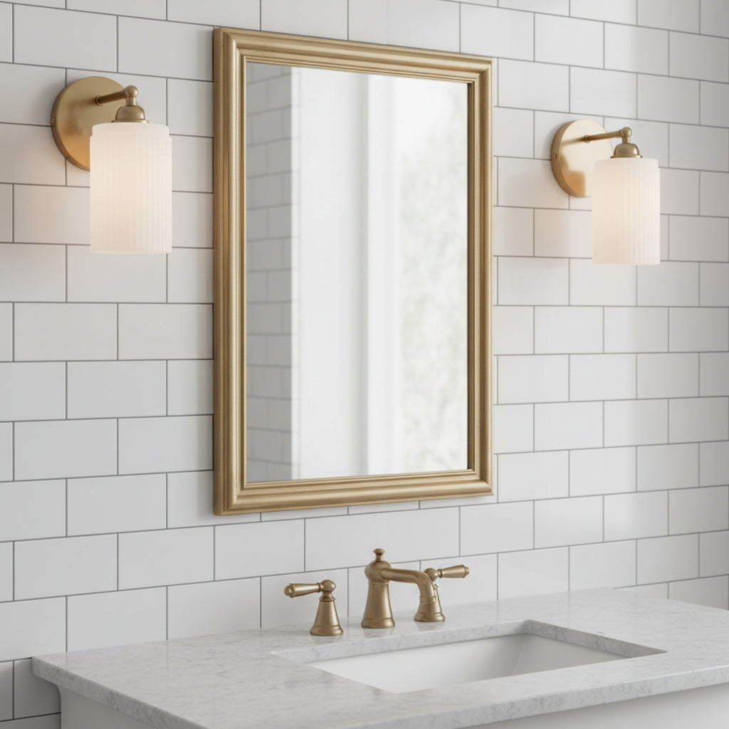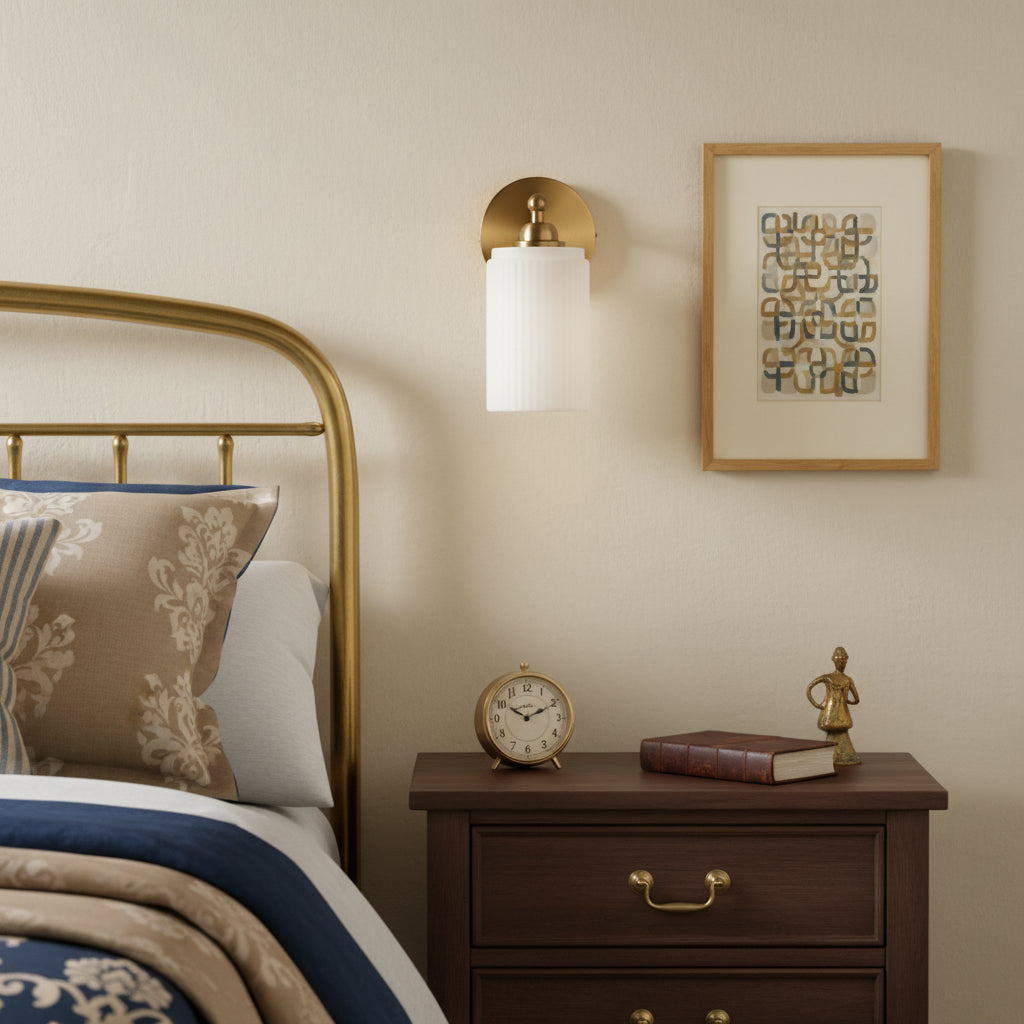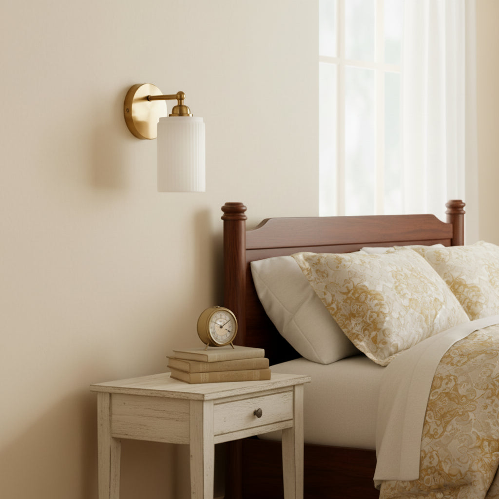 The Wall Sconce blends retro charm with modern elegance. Brass finish and ribbed glass shade cast warm, inviting light, ideal for adding a touch of sophistication to any space.