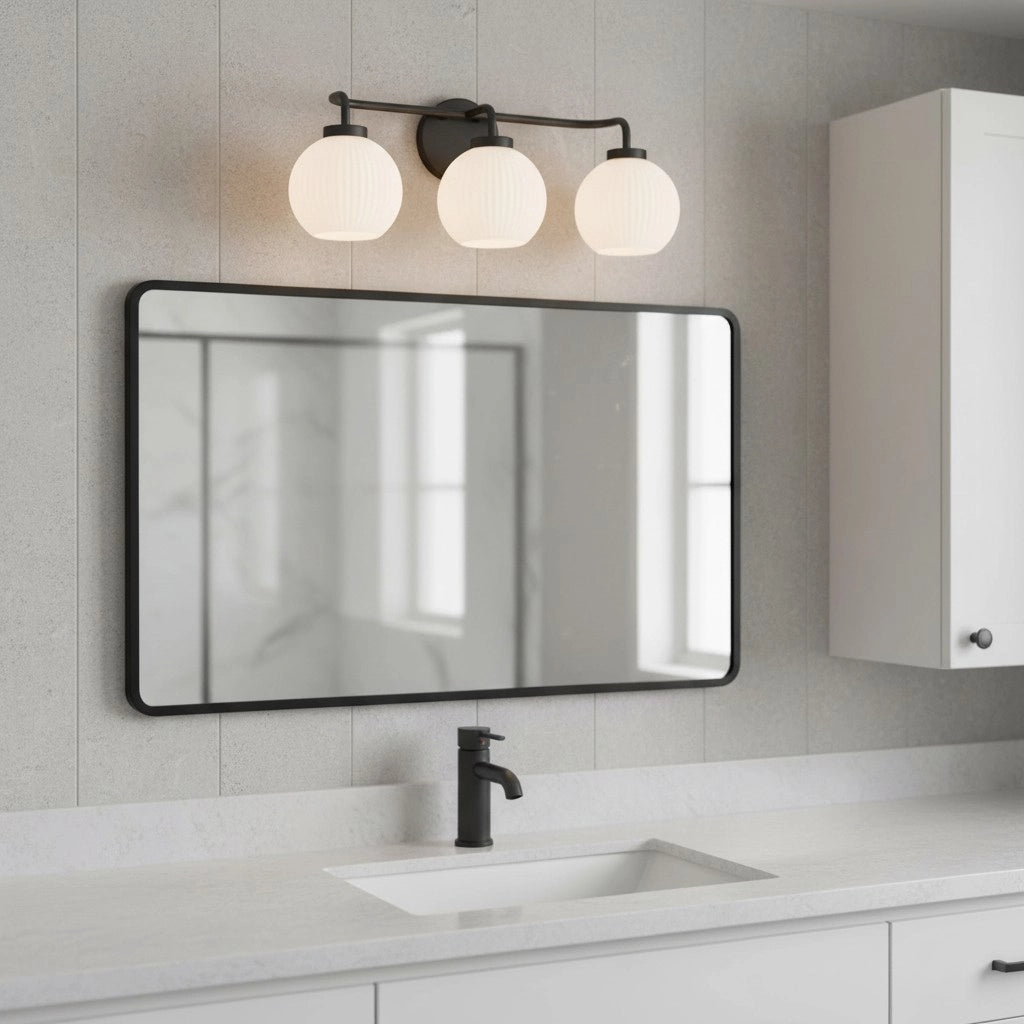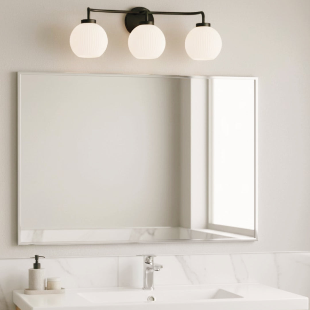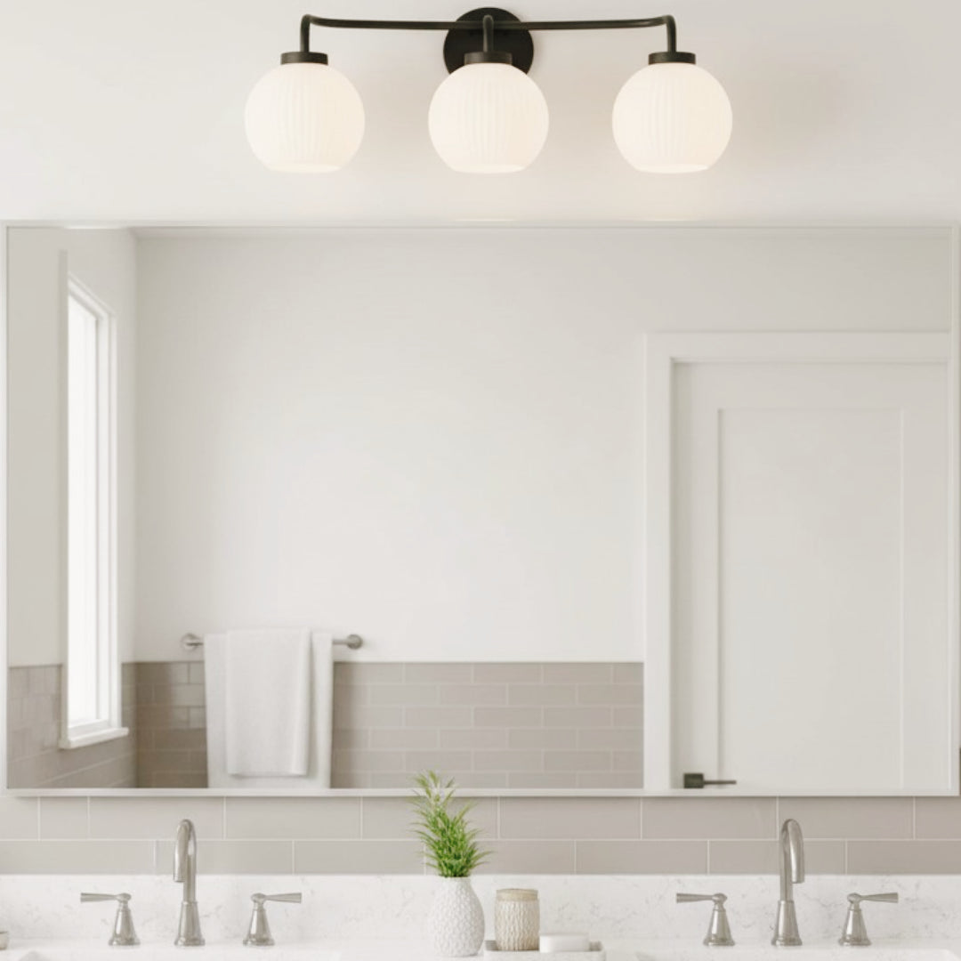 The Vero bath light combines a slender black frame with three textured white globes for elegant contrast.