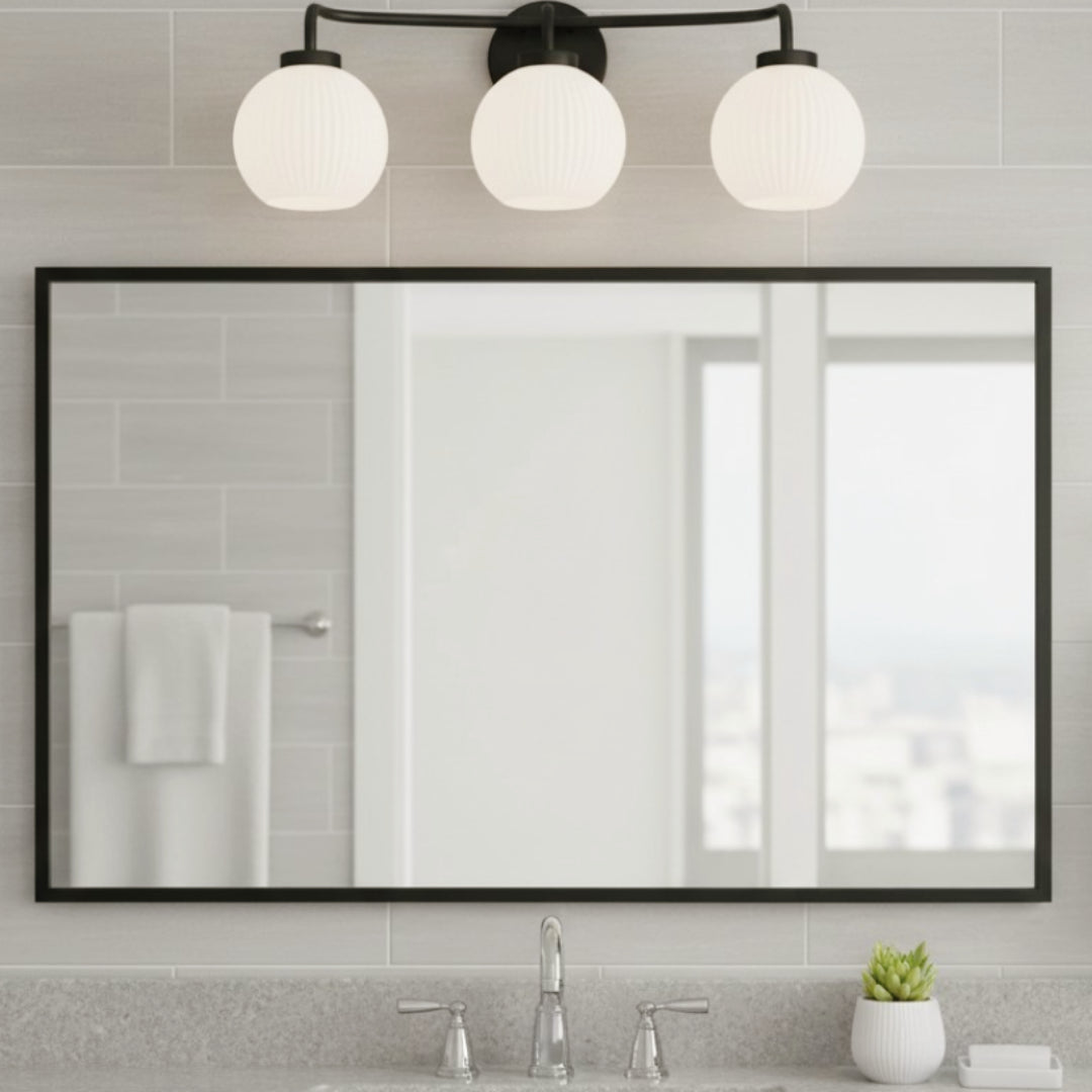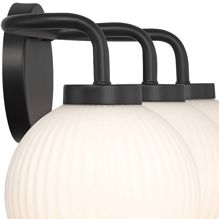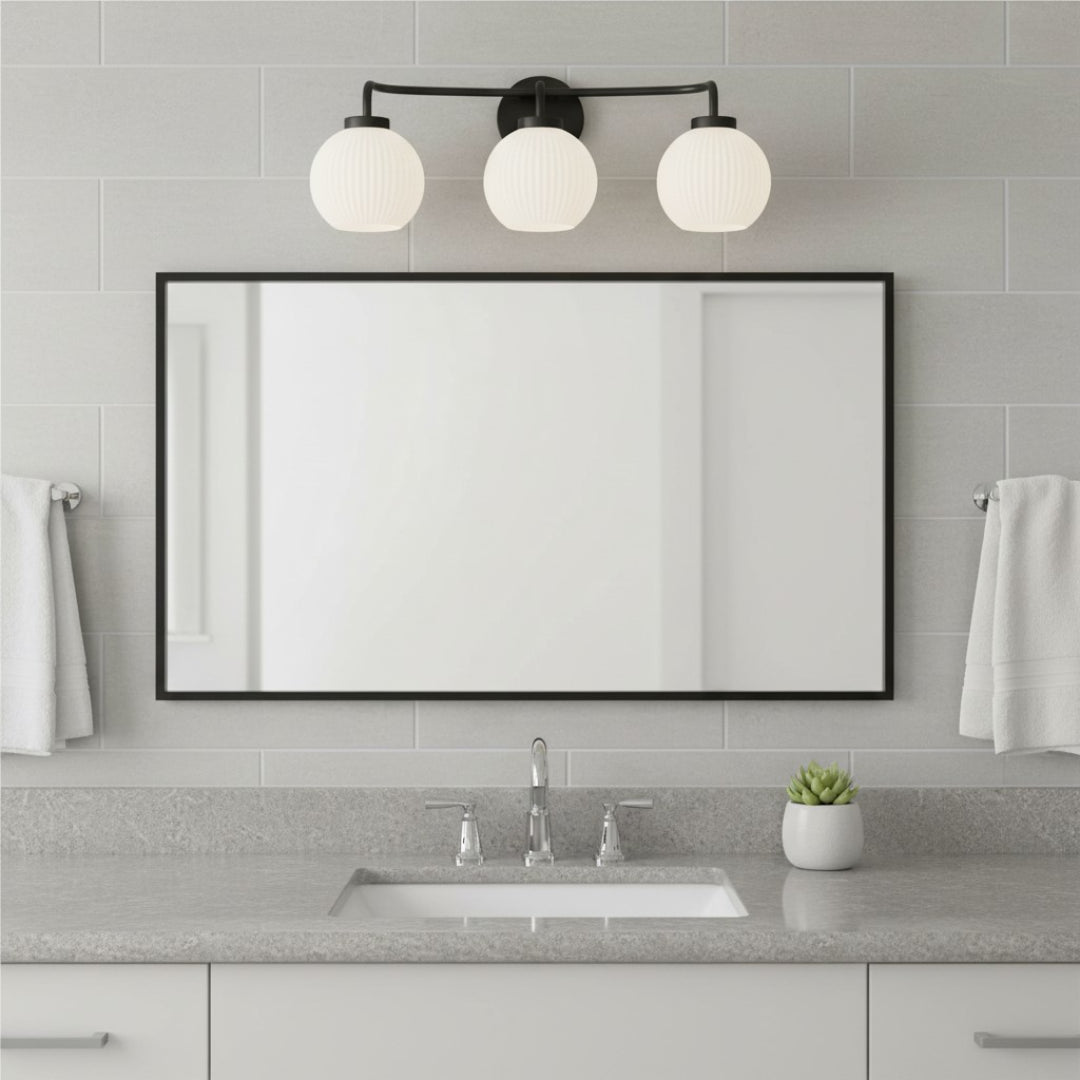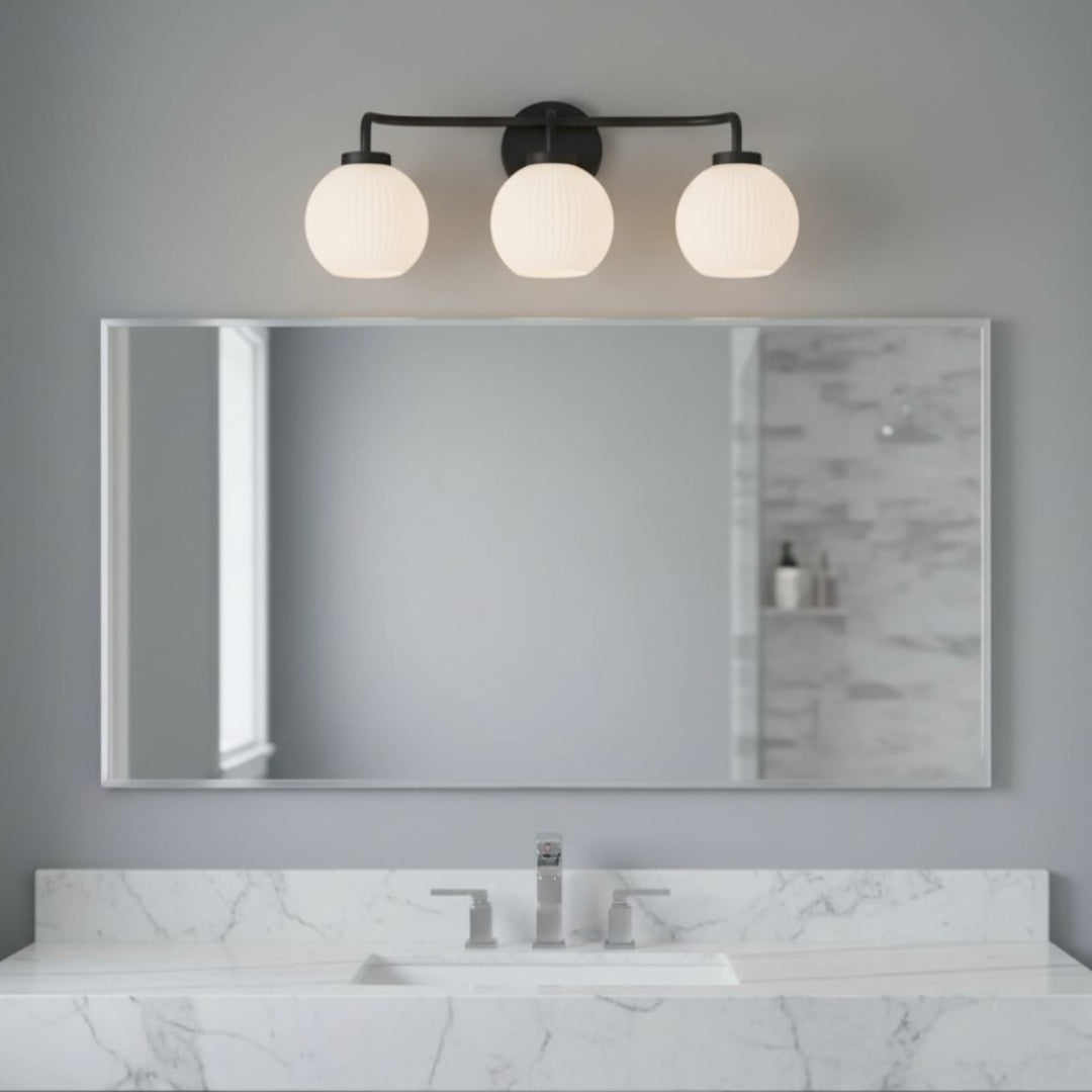 The Vero bath light combines a slender black frame with three textured white globes for elegant contrast.