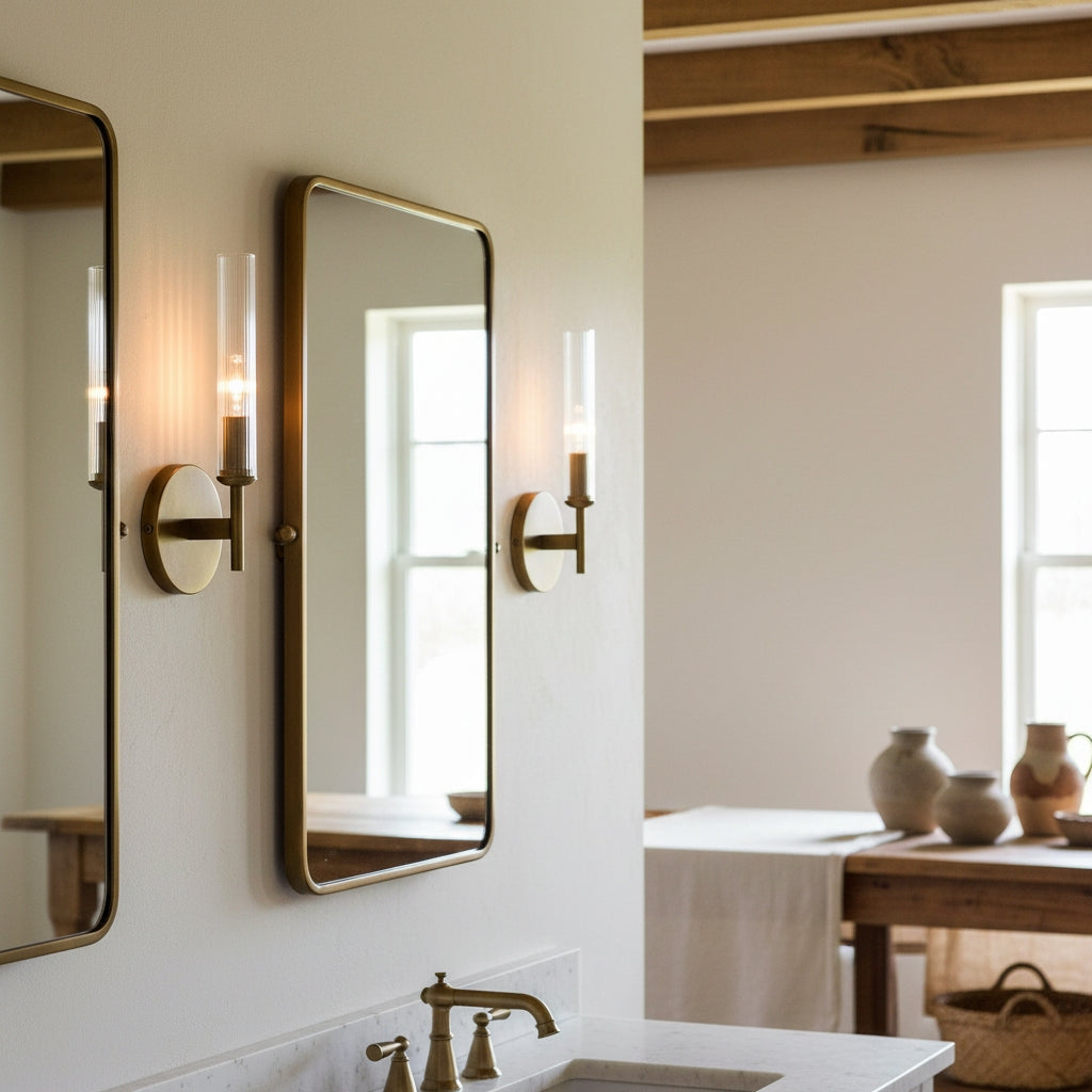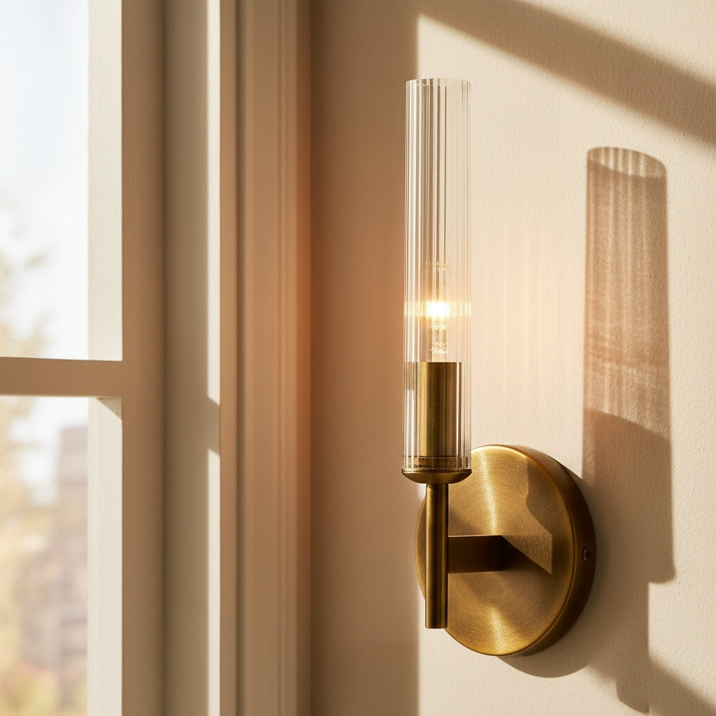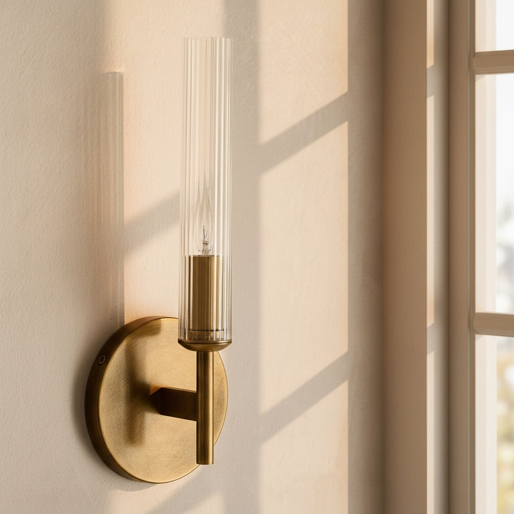 The Vireo Tube Sconce combines rustic charm with modern versatility. Featuring ribbed glass and a copper-accented frame, it brings warm, elegant illumination to any space. Perfect for bathrooms, hallways, or bedrooms.