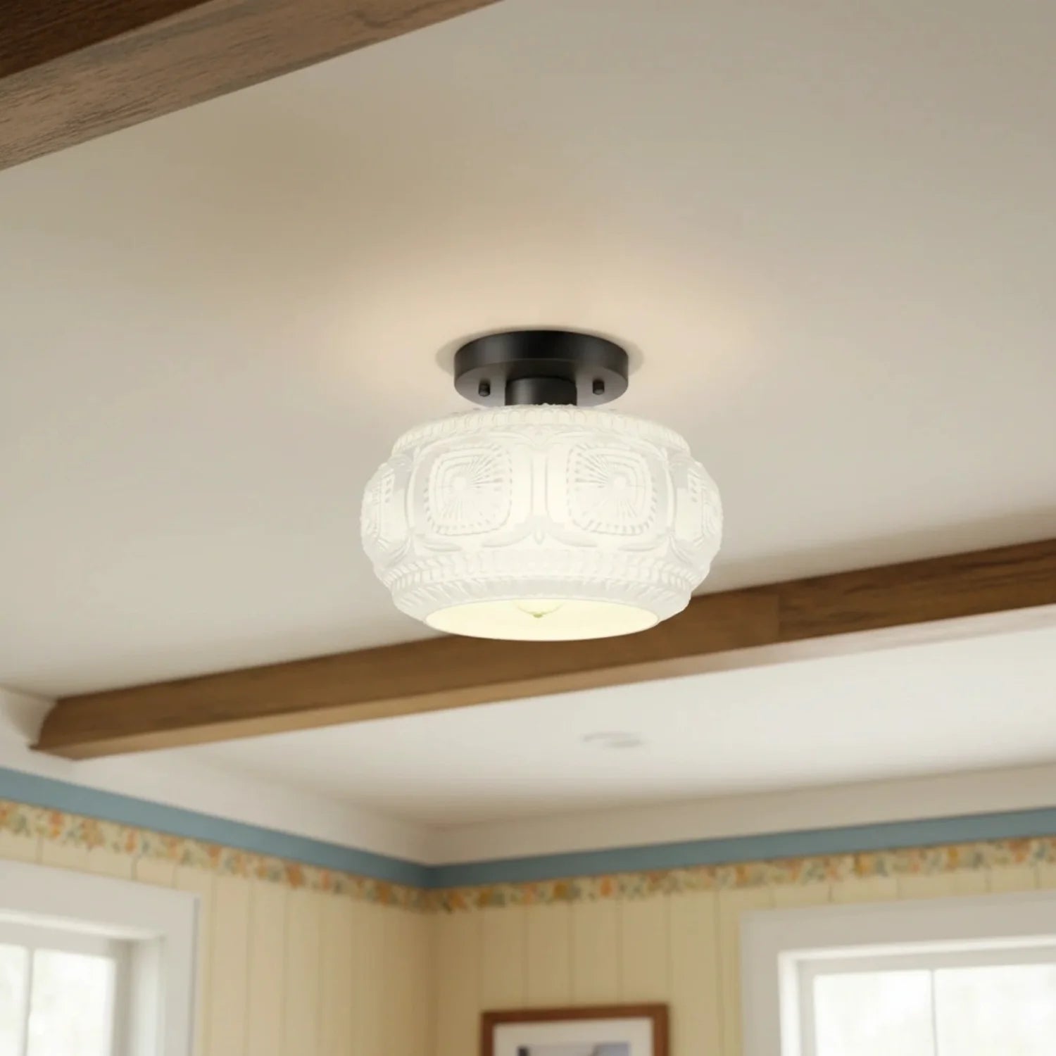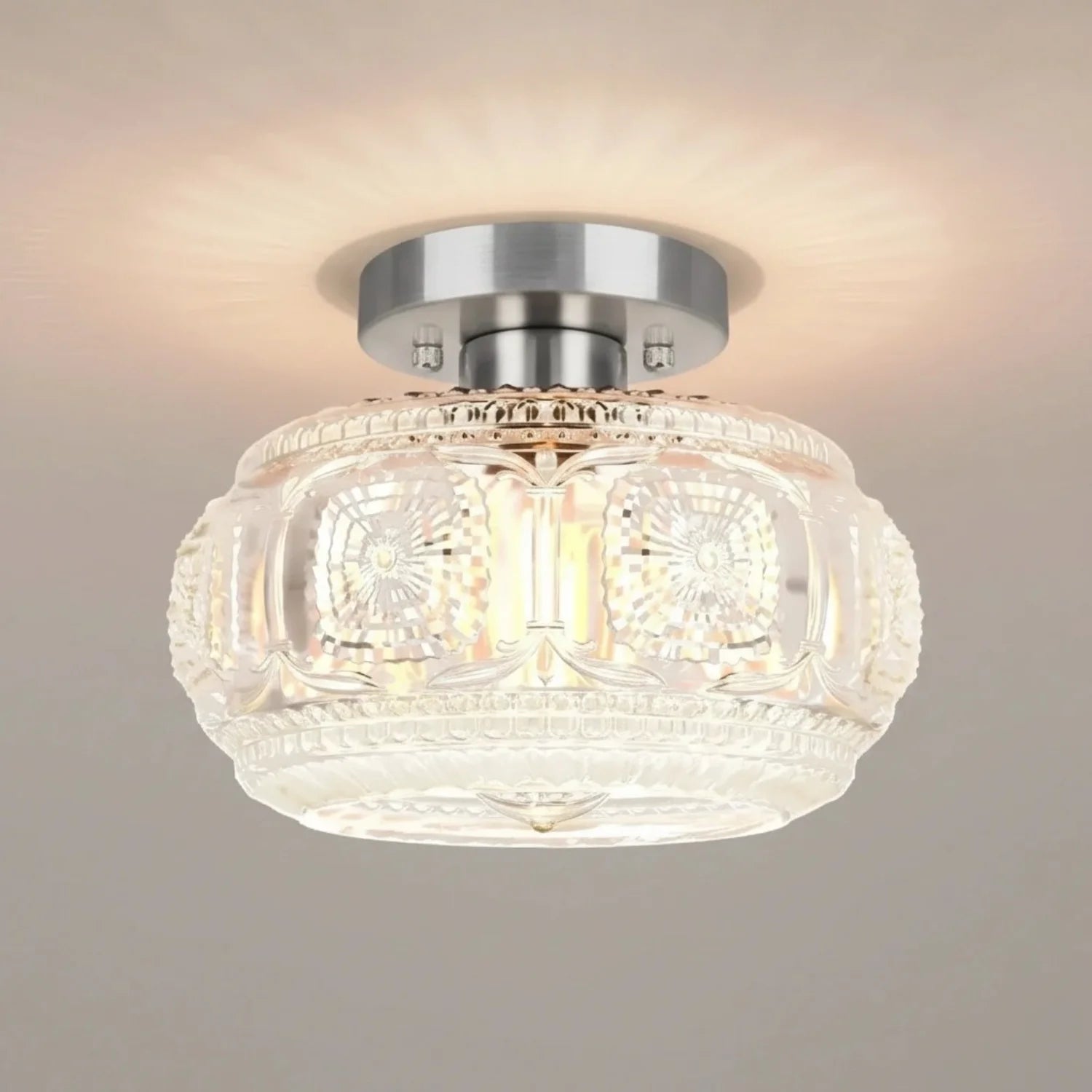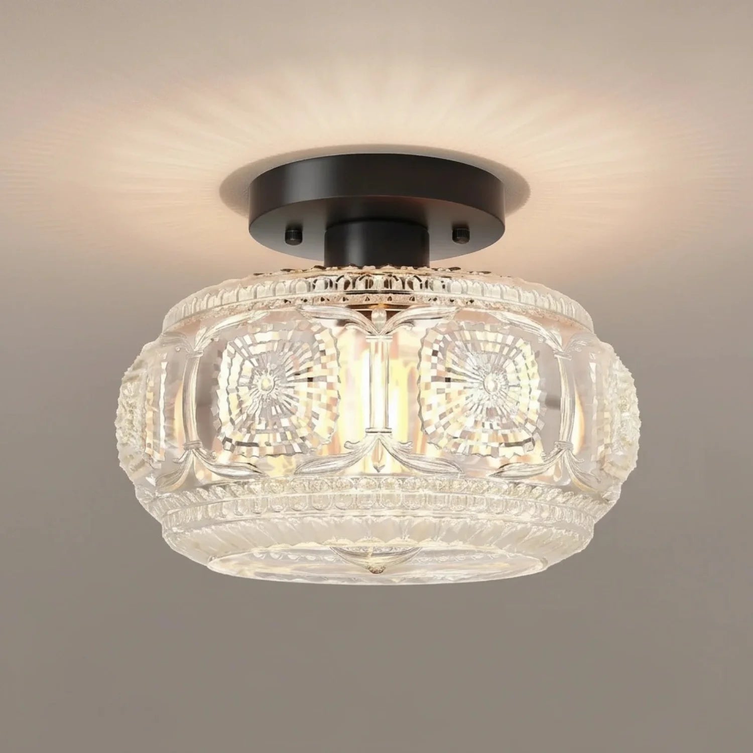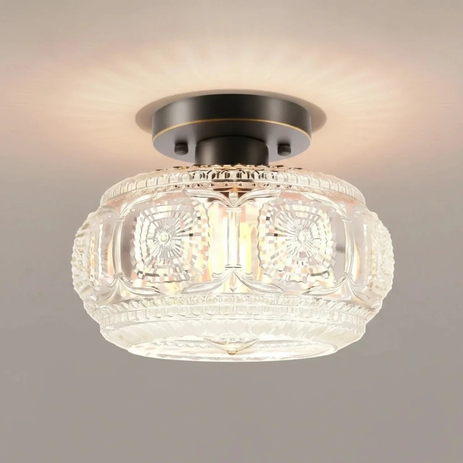 This ceiling light features a carved glass shade paired with a sturdy metal base, creating a warm and inviting atmosphere for bedrooms, hallways, living rooms, kitchens, and entryways. It is an ideal choice for residential and transitional interior designs.