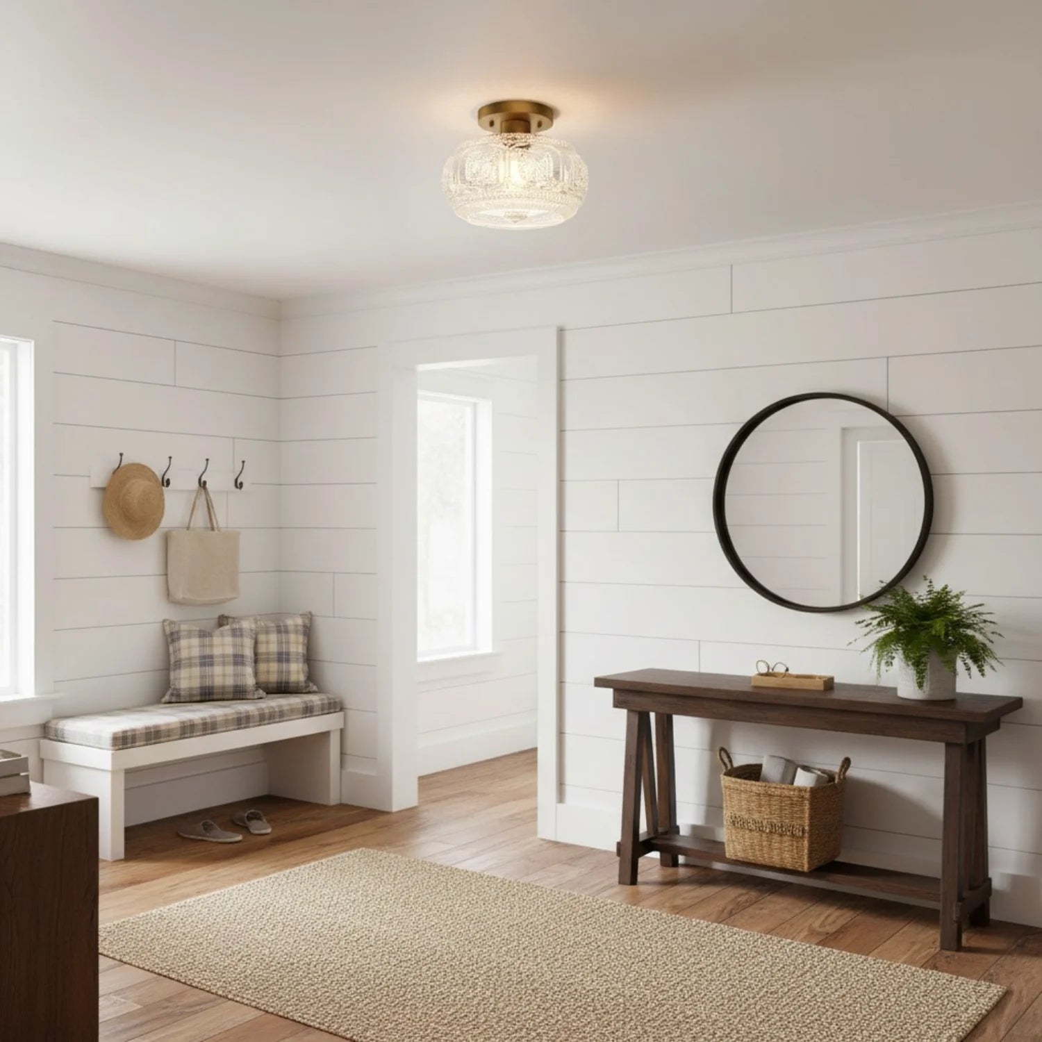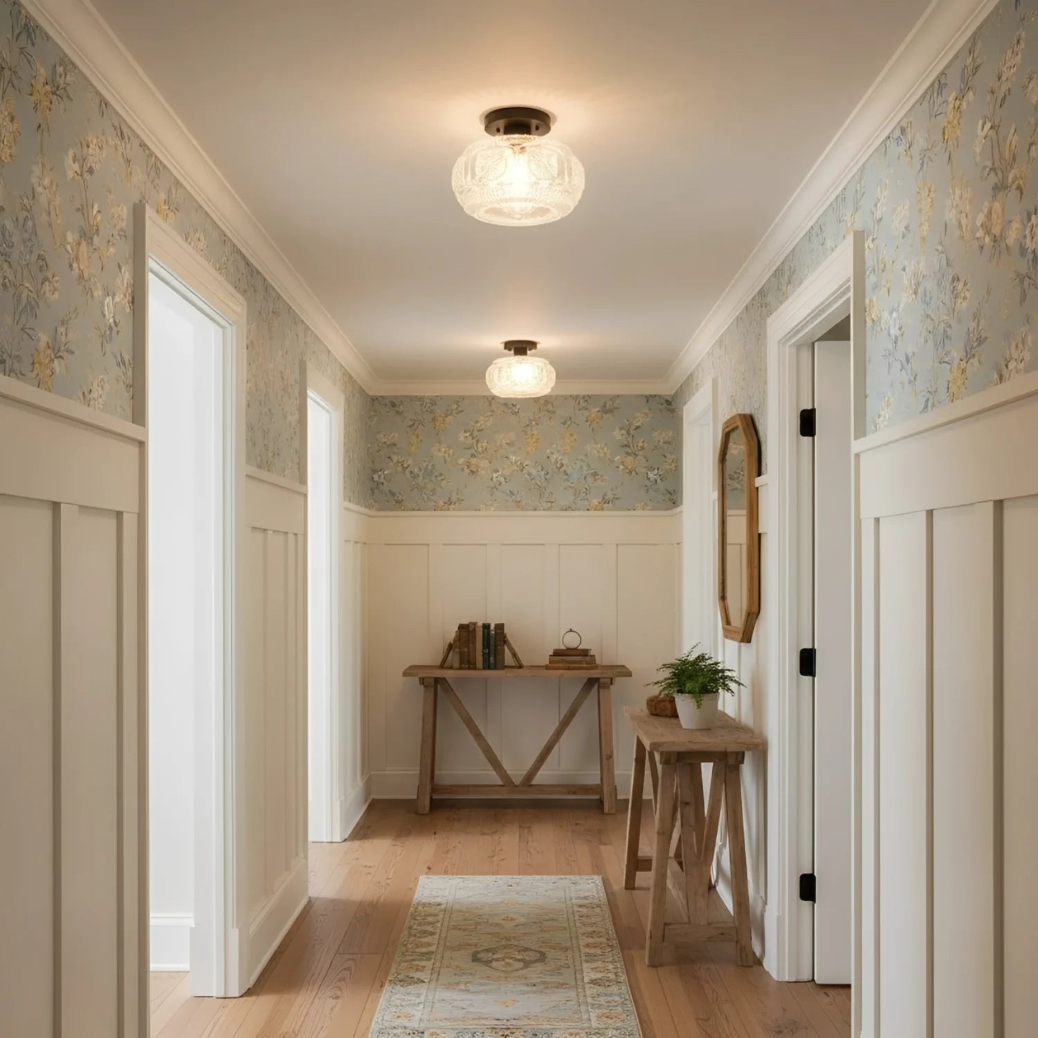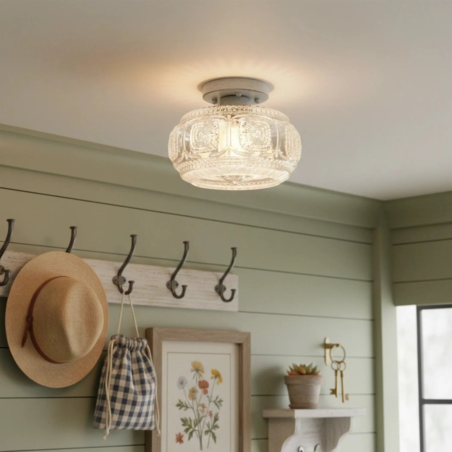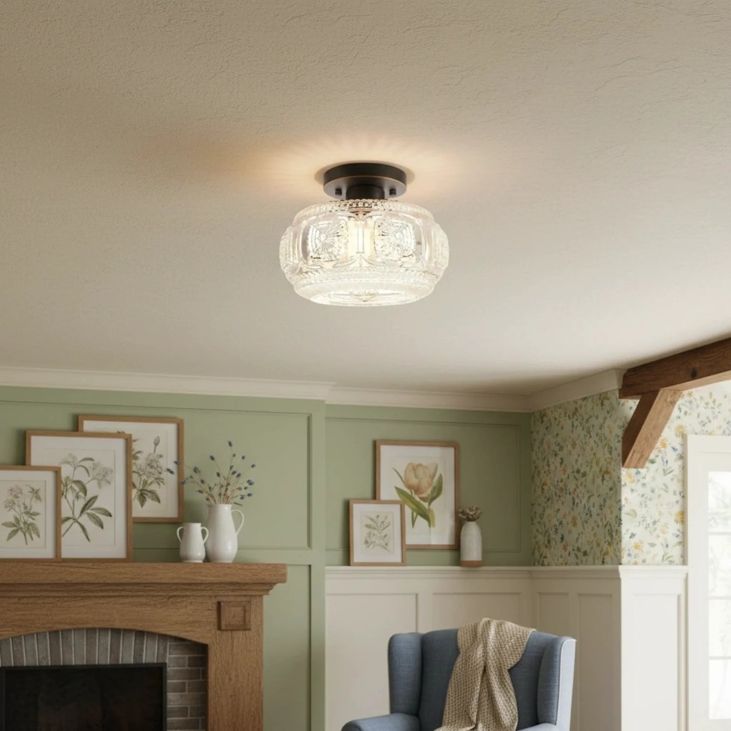 This ceiling light features a carved glass shade paired with a sturdy metal base, creating a warm and inviting atmosphere for bedrooms, hallways, living rooms, kitchens, and entryways. It is an ideal choice for residential and transitional interior designs.