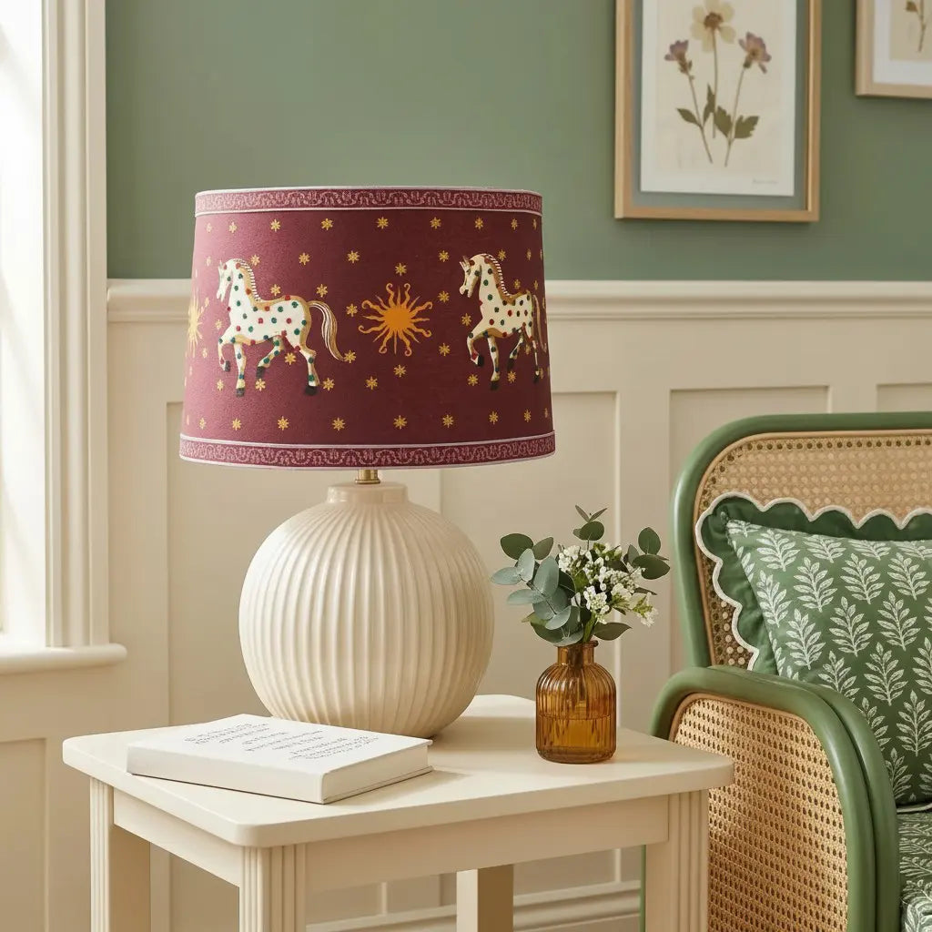 This vintage fairytale drum lamp shade showcases whimsical sun and horse motifs—merging enchanted storytelling charm with soft, warm light diffusion. It suits table lamps, floor lamps, or cozy bedroom and living room accent spaces.