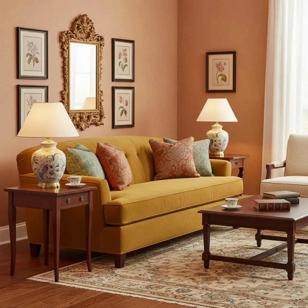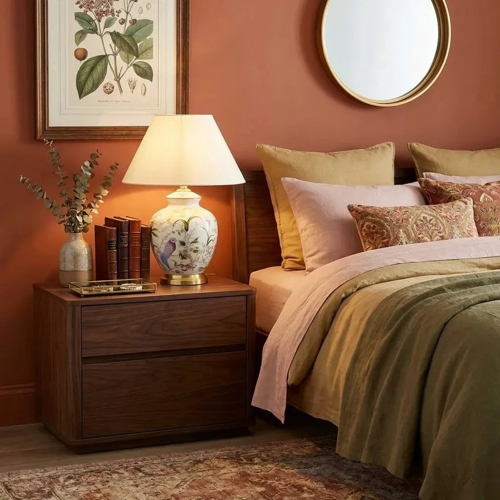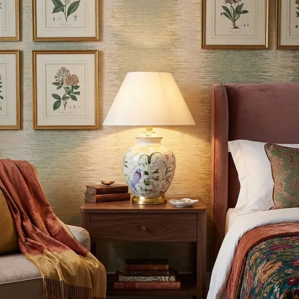 This elegant ceramic table lamp features a softly contoured body and brushed copper base, casting warm ambient light that enhances cozy, romantic bedrooms and living spaces with retro charm.