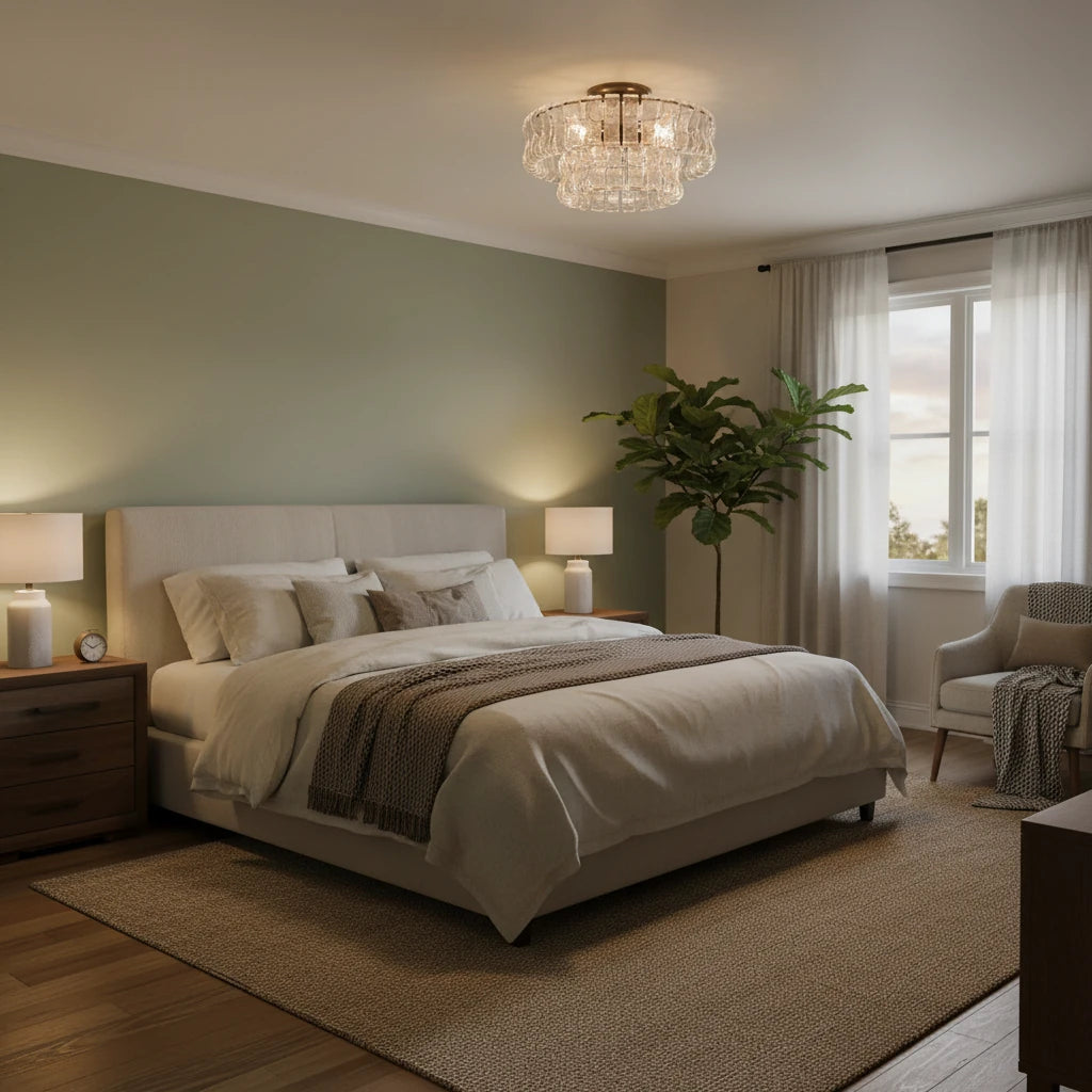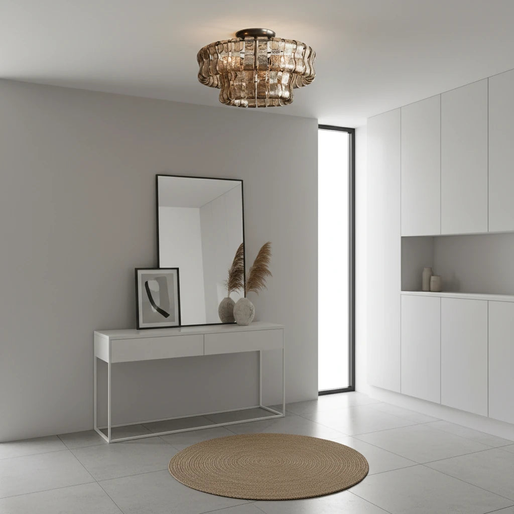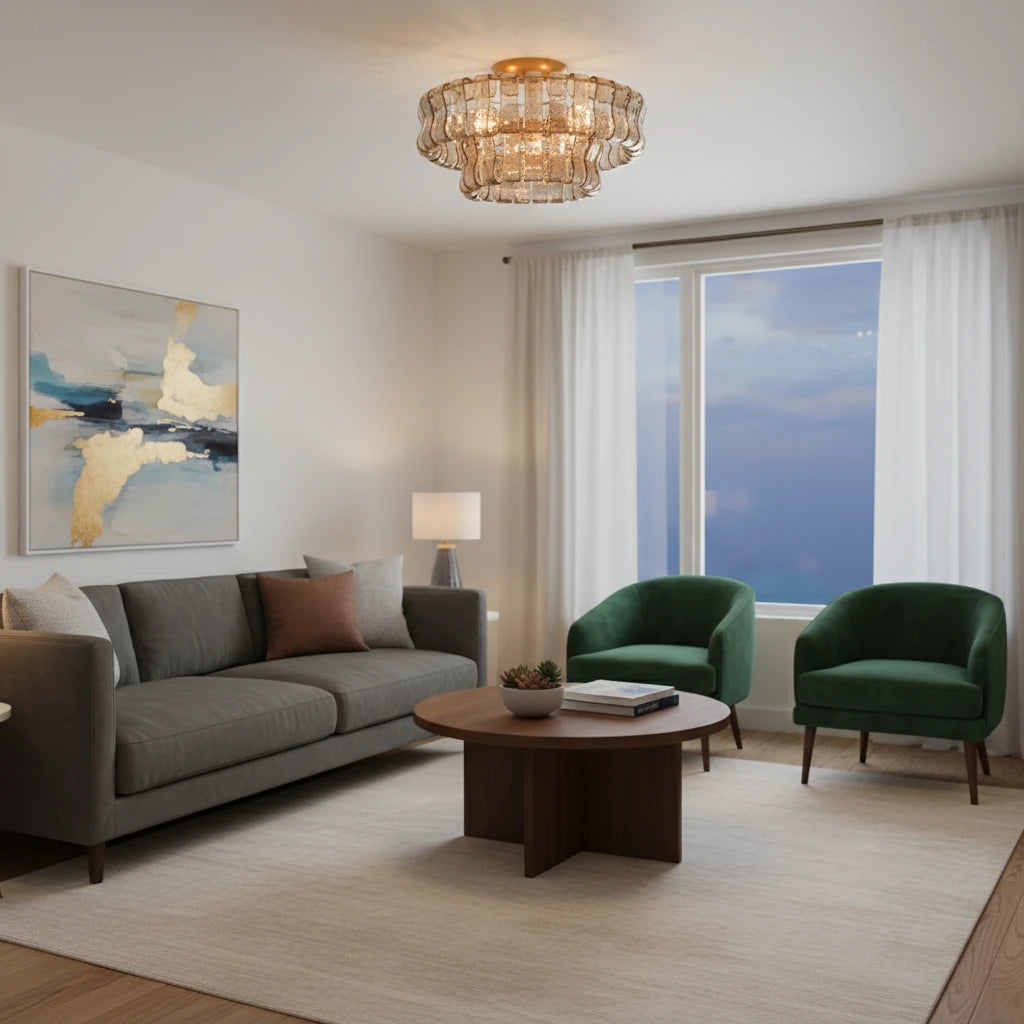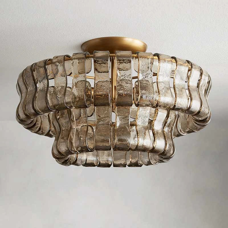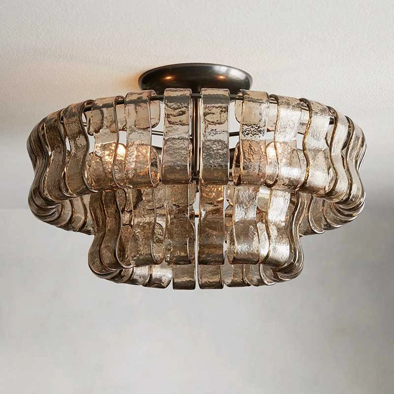 A refined semi-flush chandelier featuring curved, textured Italian-style glass and a plated brass or bronze frame. Delivers warm, layered illumination that complements modern and farmhouse interiors.