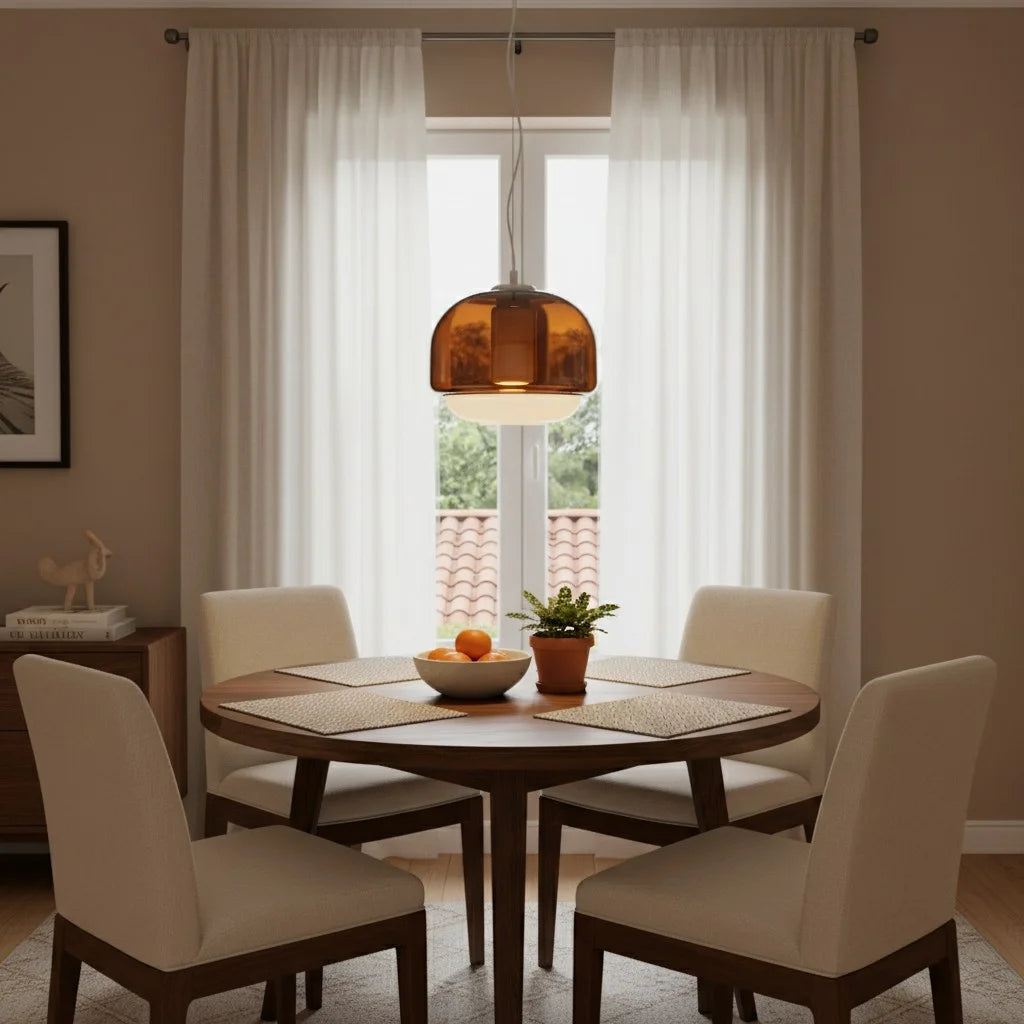 Deze dubbele koepelpendel combineert doorschijnend en ondoorzichtig gekleurd glas om een zachte, vrolijke ambiance te creëren. De ronde vorm en warme tinten brengen een vleugje moderne charme naar eetkamers, keukeneilanden of gezellige hoeken.