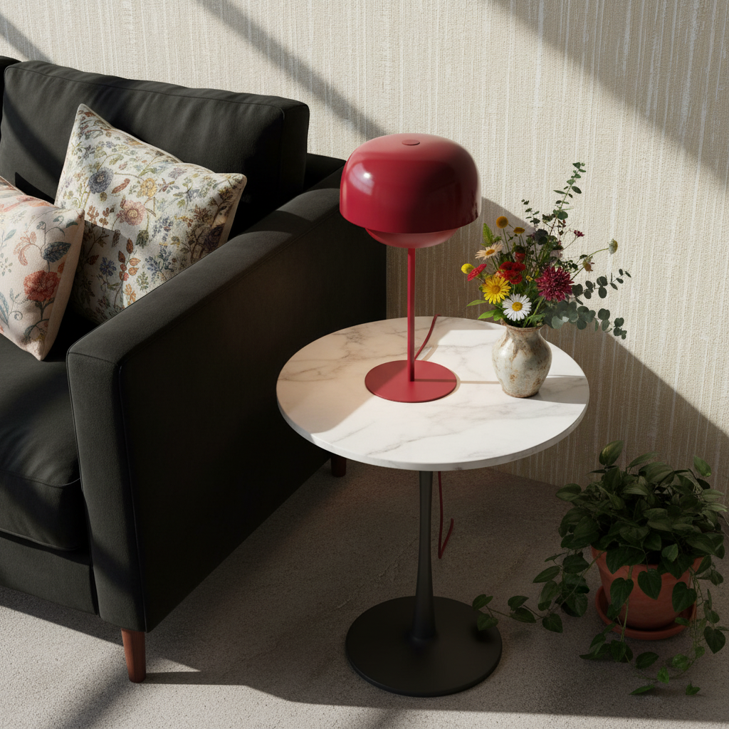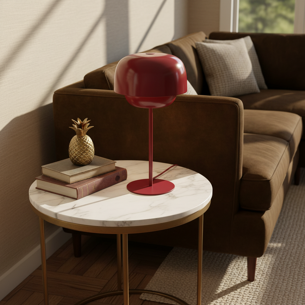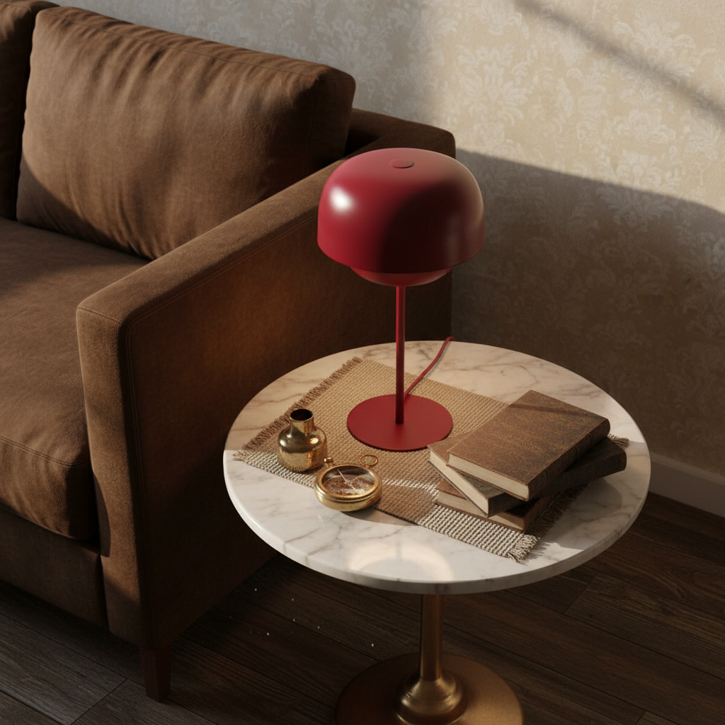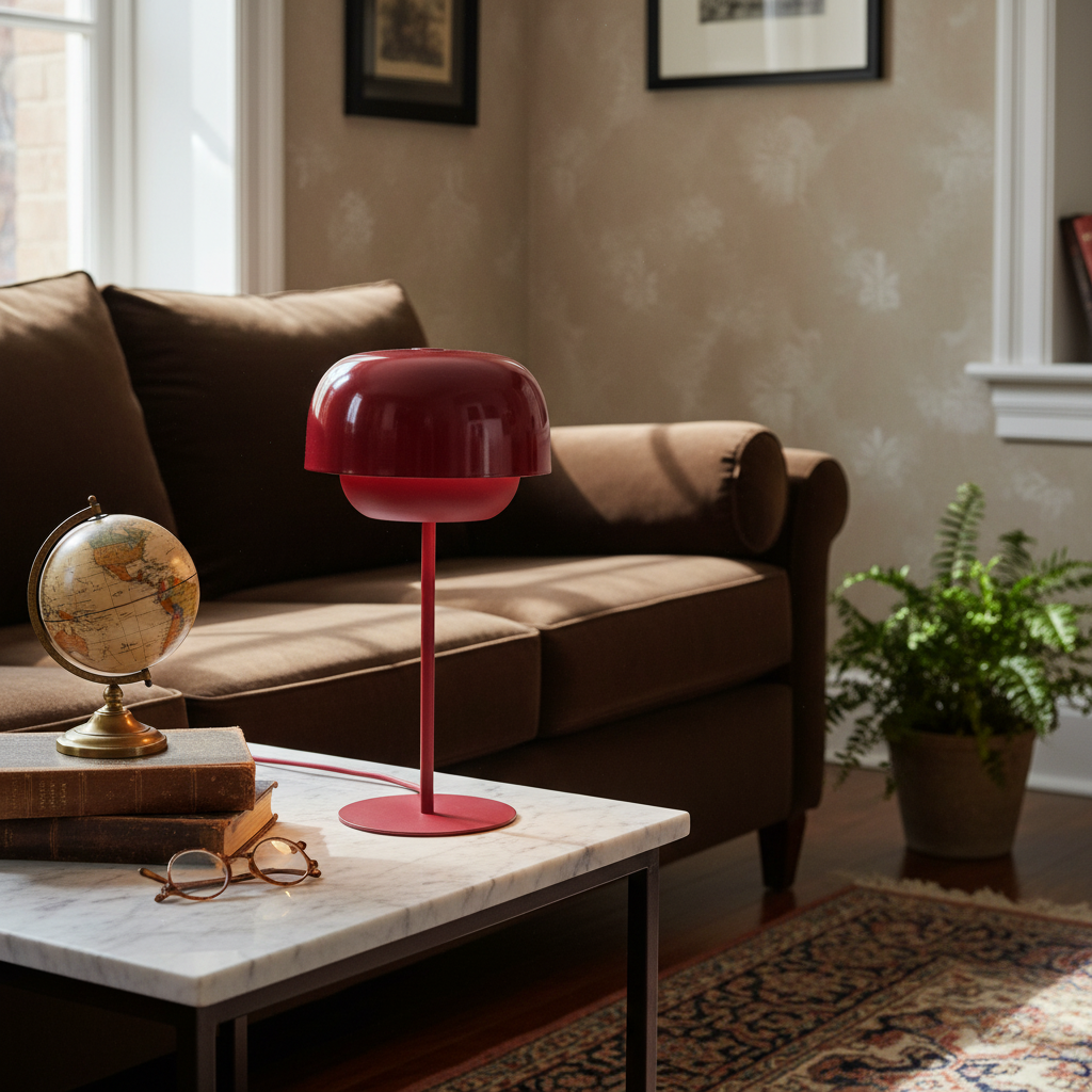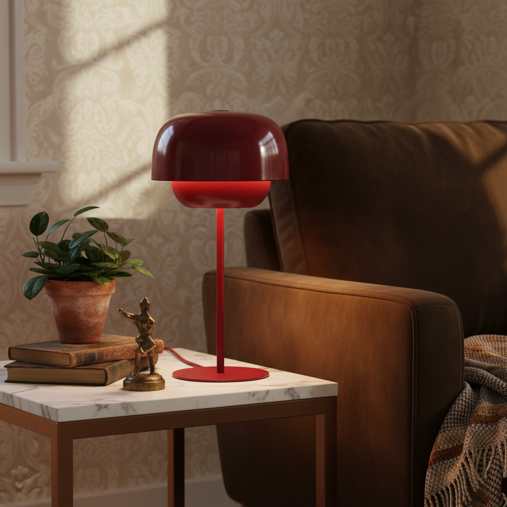 De Soteria Tafellamp combineert een slanke koepelsilhouet met levendige afwerkingen voor een speelse maar verfijnde uitstraling. Het strakke ontwerp verlicht bureaus, nachtkastjes en gezellige leeshoekjes.