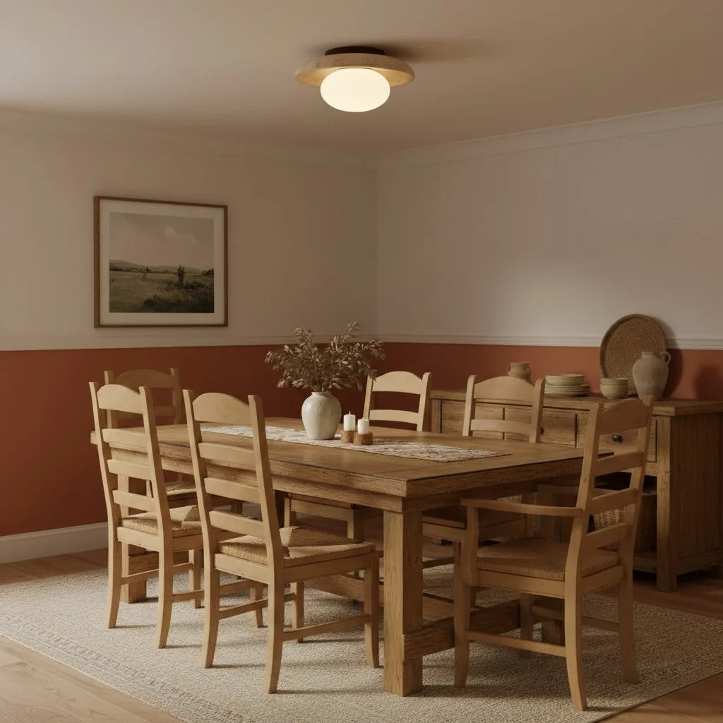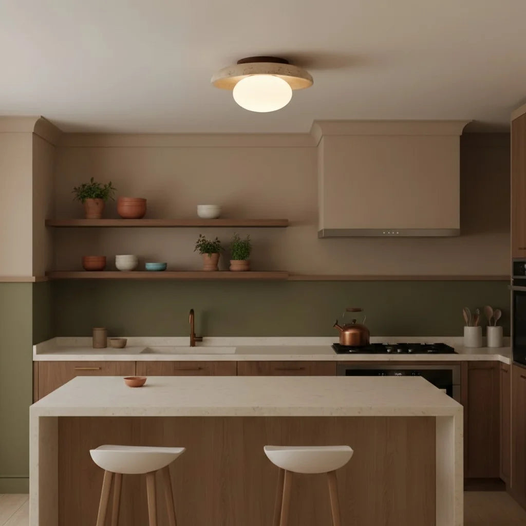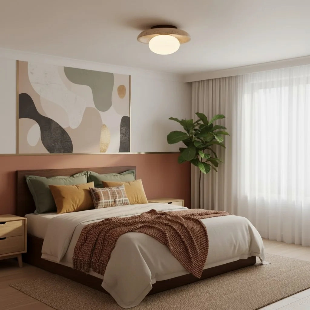 The Alaey Ceiling Light features a smooth glass shade, natural wood base, and a refined travertine accent, delivering soft, ambient lighting. Its clean, modern design paired with warm natural materials makes it an ideal choice for living spaces.