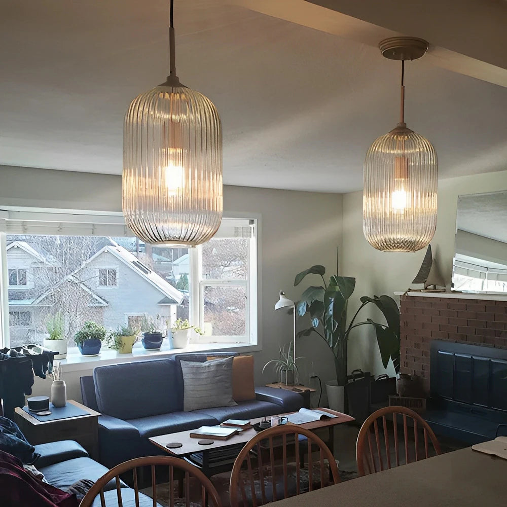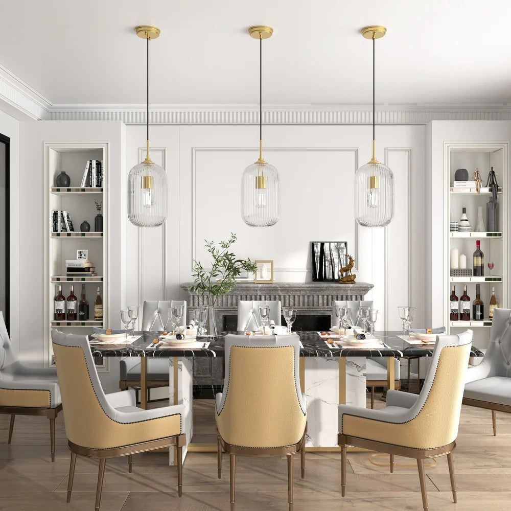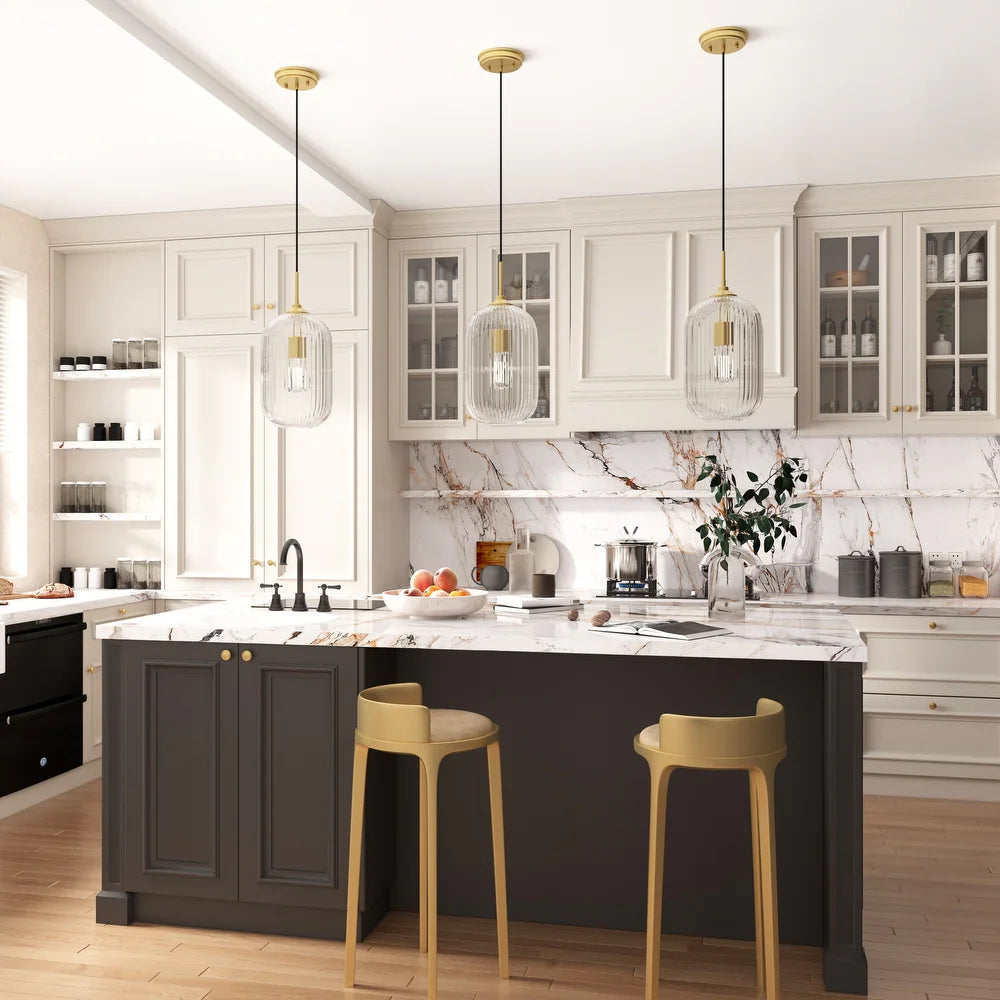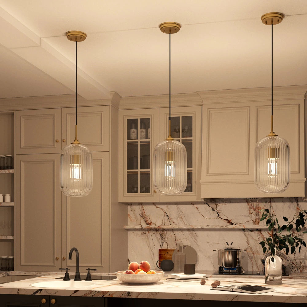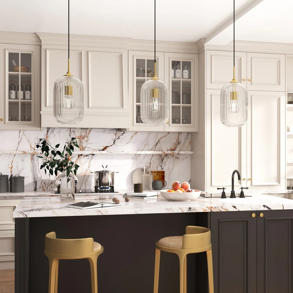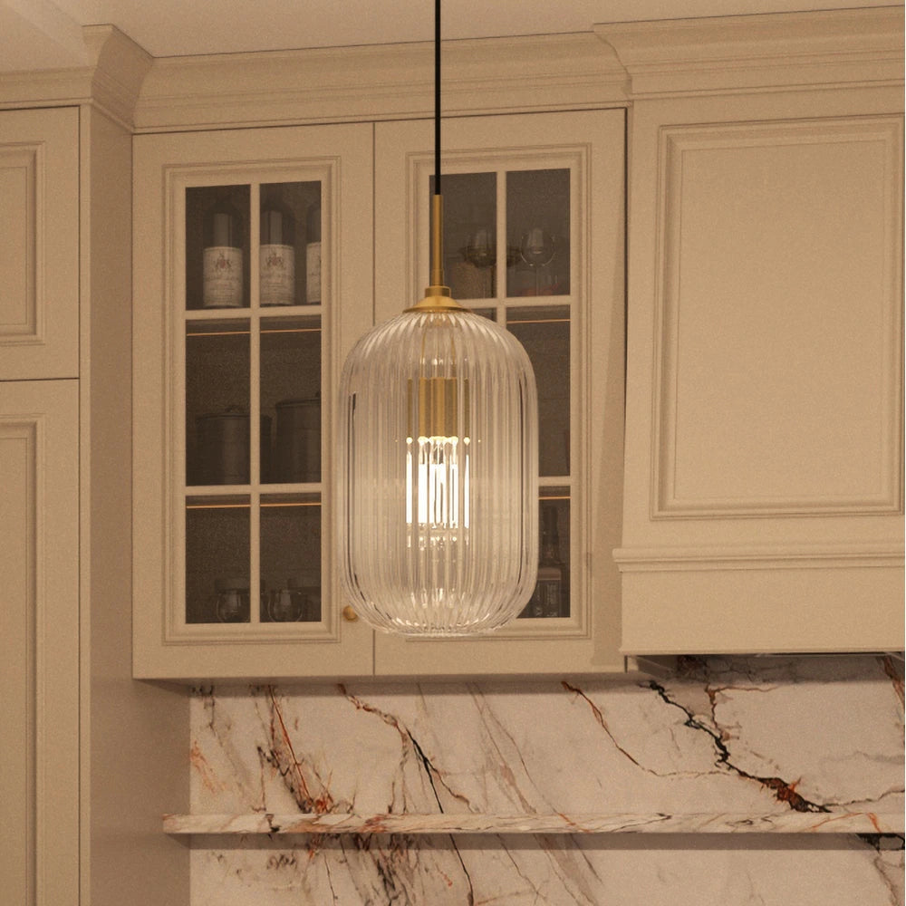 Enhance your space with this modern gold pendant light, featuring elegant striped glass that casts a warm, inviting glow. Perfect for kitchen islands, cozy corners, or bedrooms, it adds a touch of glam to modern, farmhouse, or eclectic interiors.