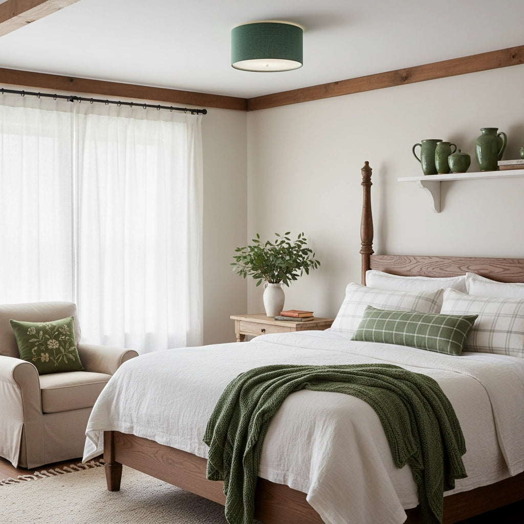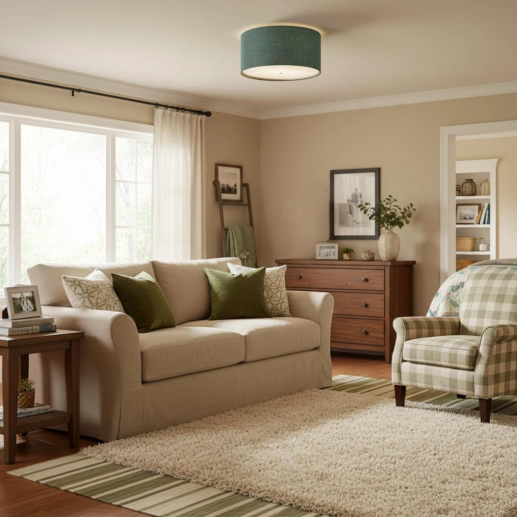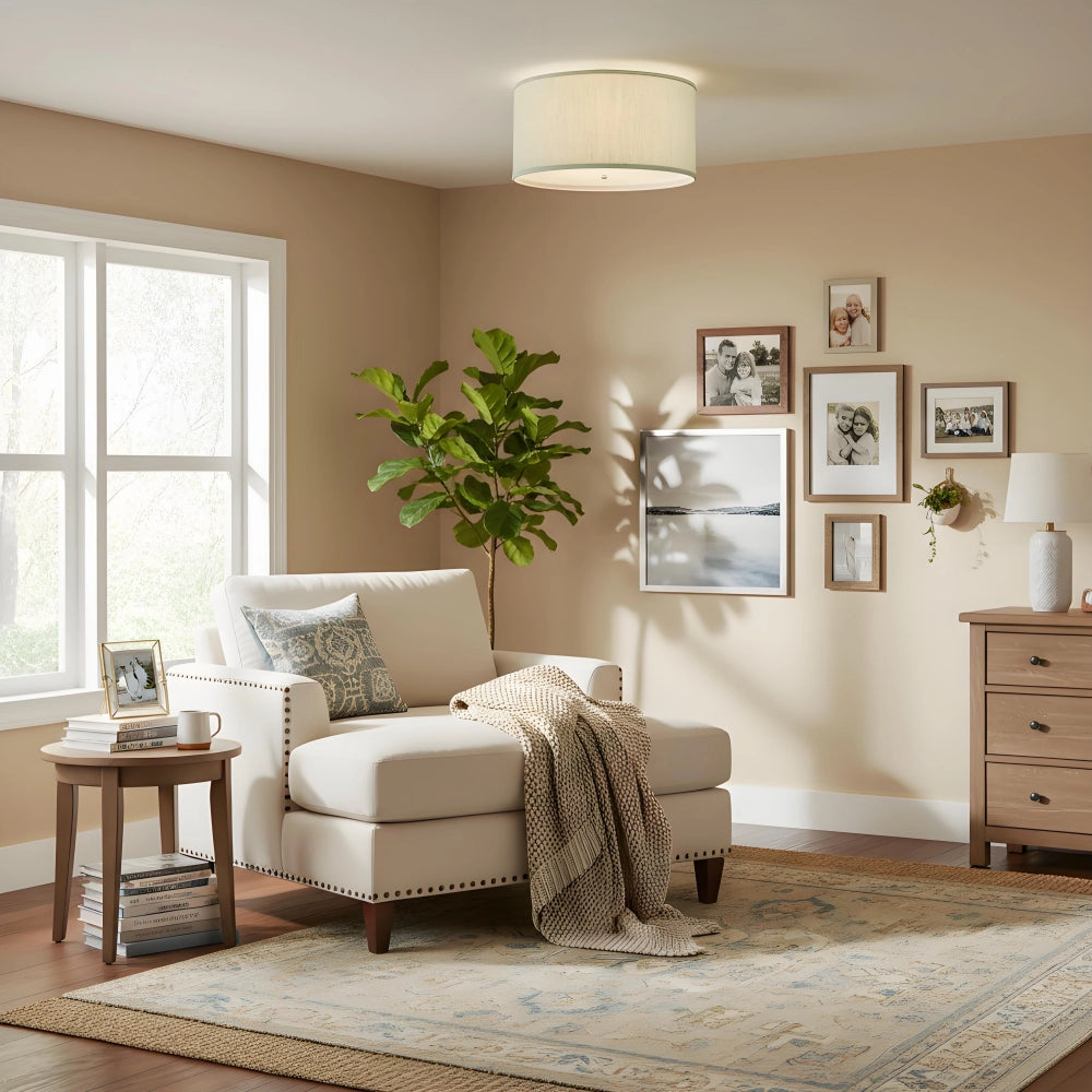 The Ceiling Light features a cylindrical fabric shade in soft hues. Blending modern style with cozy ambiance, ideal for living rooms or bedrooms.