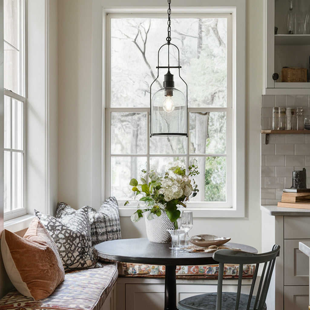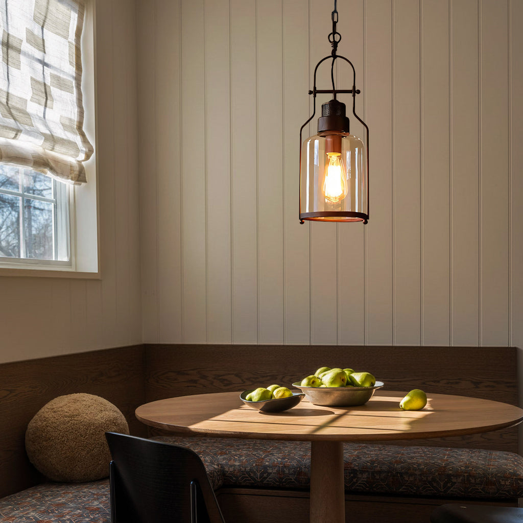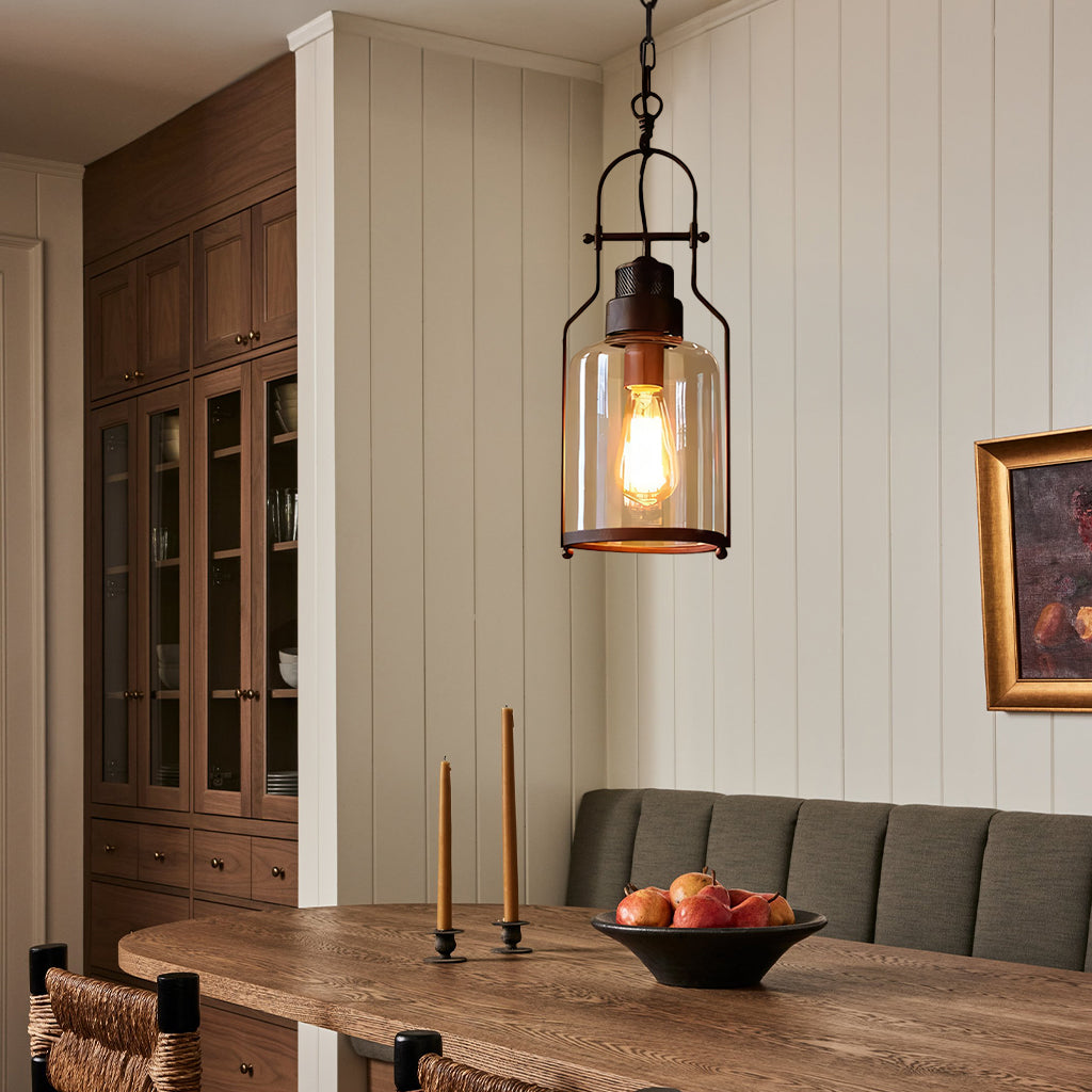 Merging vintage industrial charm with farmhouse style, the Morris Pendant Light enhances kitchens, bars, or dining spaces. Its metal-and-glass jar offers warm lighting, with adjustable height for ideal placement.
