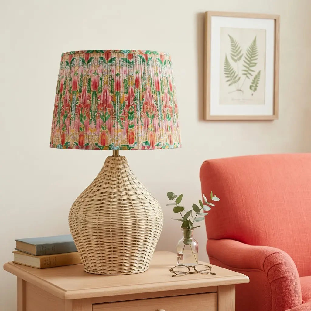 This country-inspired lamp shade features pleated fabric with vibrant floral prints—blending rustic cottage charm with soft, diffused light diffusion. It suits table lamps, floor lamps, or cozy bedroom and living room accent spaces.