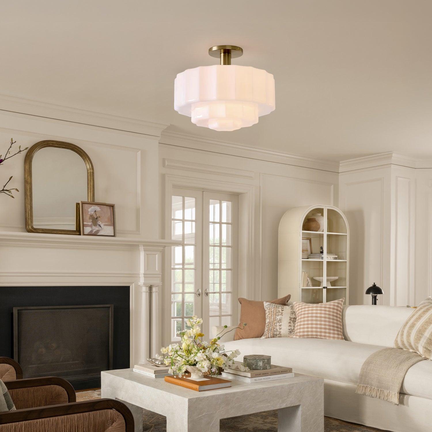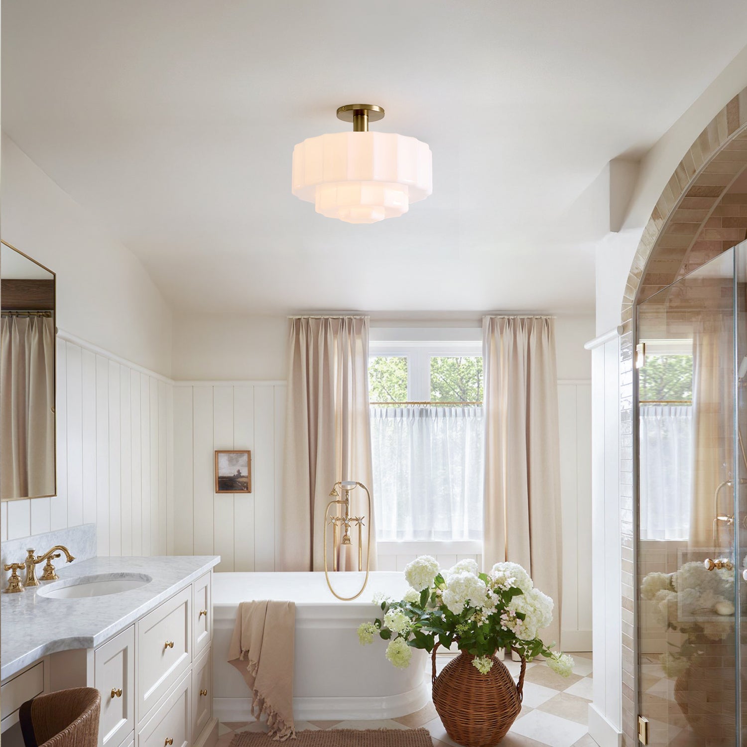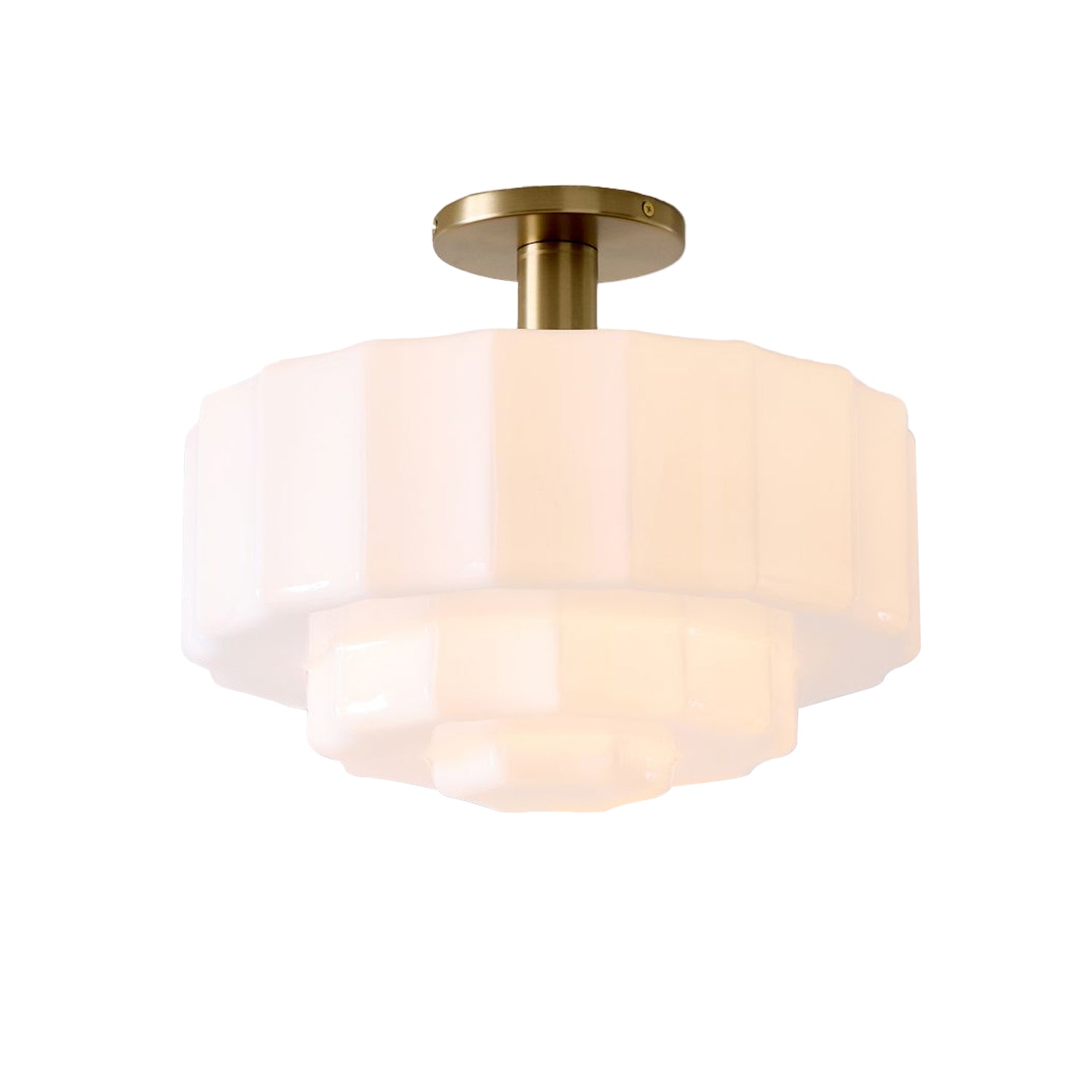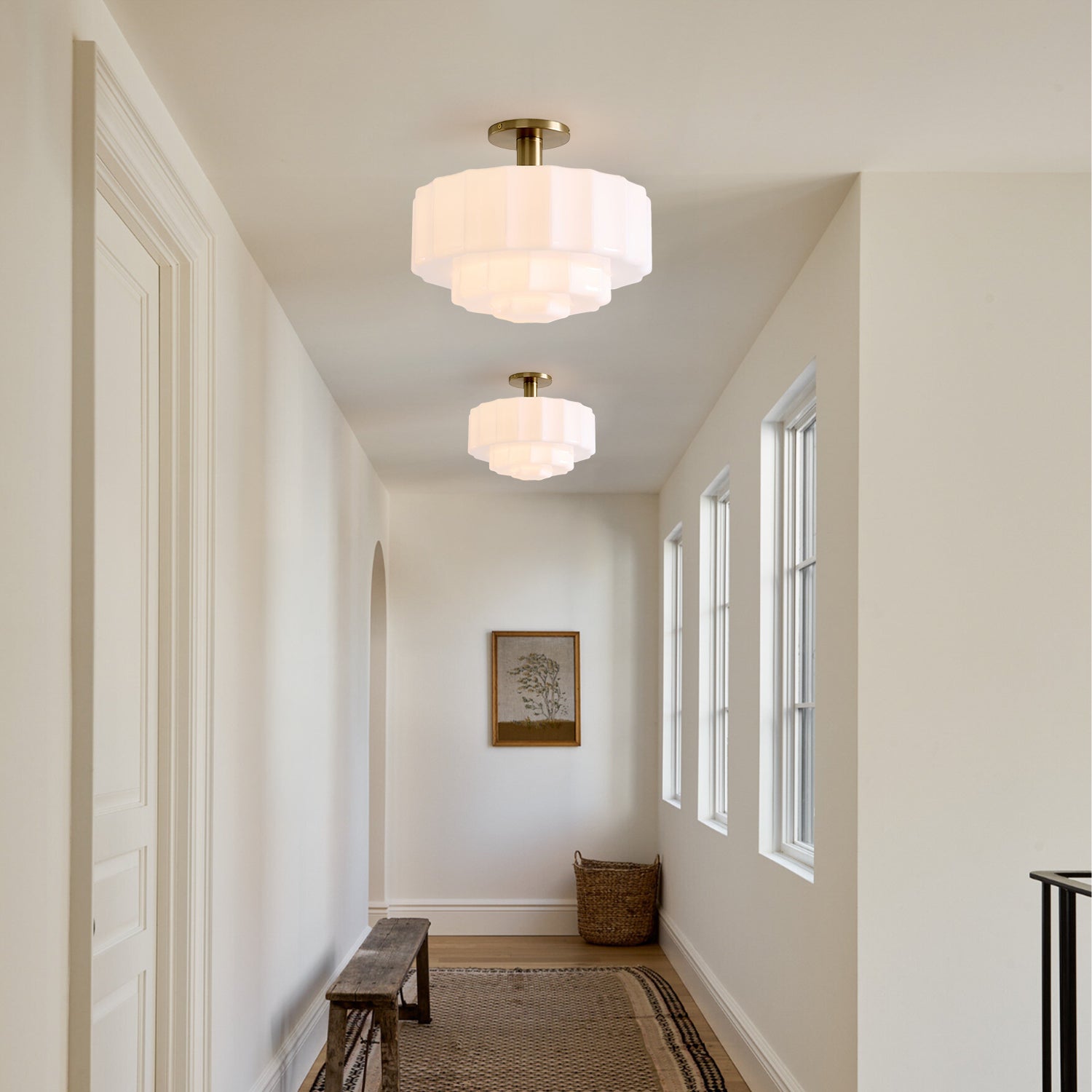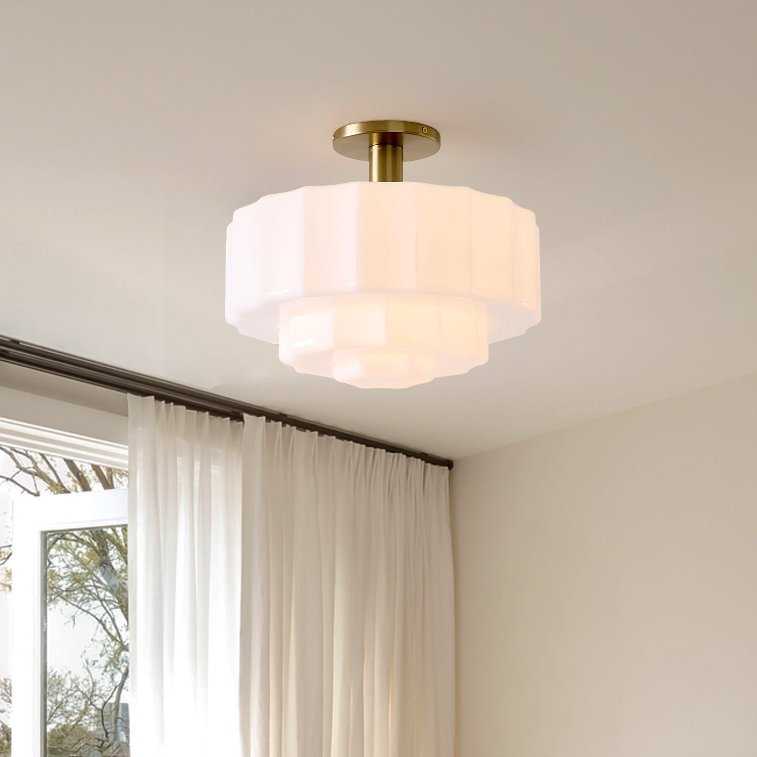 This flush mount ceiling light blends Art Deco style with modern design. Its tiered, textured milk glass shade adds depth and gives off a warm, soft glow. The Brass metal base adds a touch of elegance, making it ideal for bedrooms, entryways, or hallways.